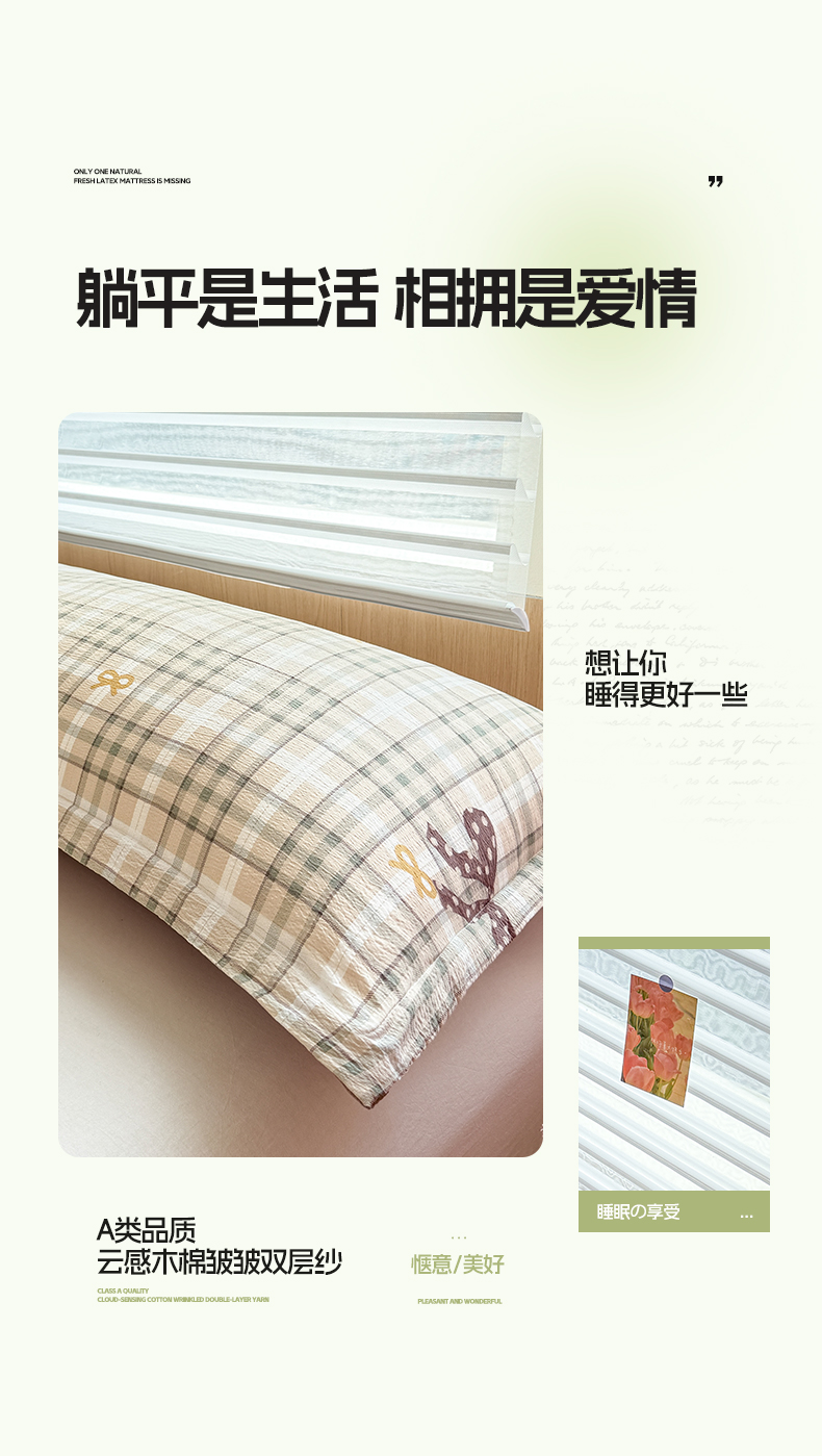 (总)麦田家纺 2025新款A类云感木棉皱皱双层纱印花四件套,春意浓,繁花,花颜,简意,开心小熊,腊肠犬,浪漫花语,免挽星辰,甜心格,小蓝町,樱桃格,紫韵