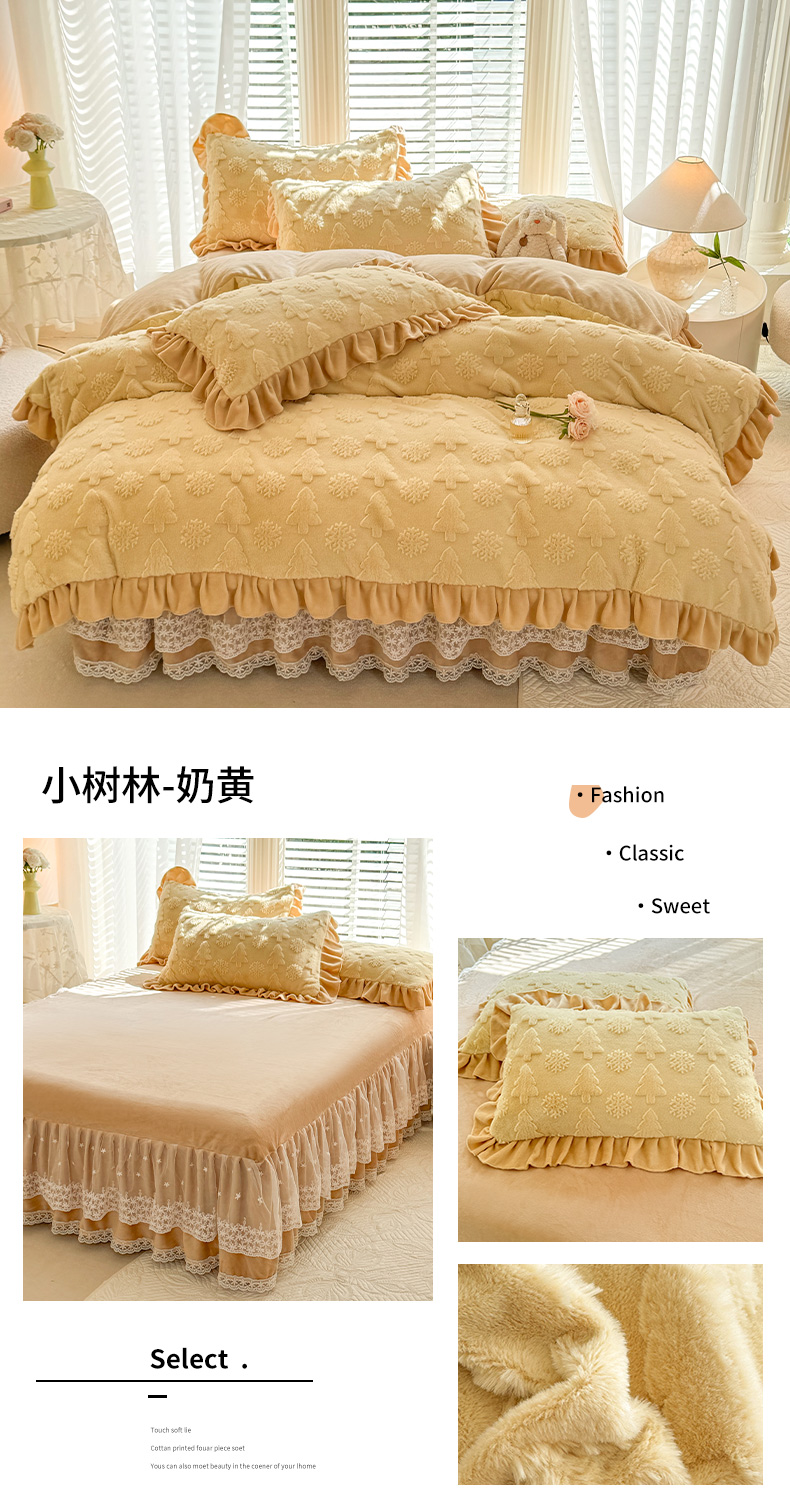 商品名称:唐人居 2025新款雕花花边兔毛绒床裙四件套 花儿朵朵-卡其