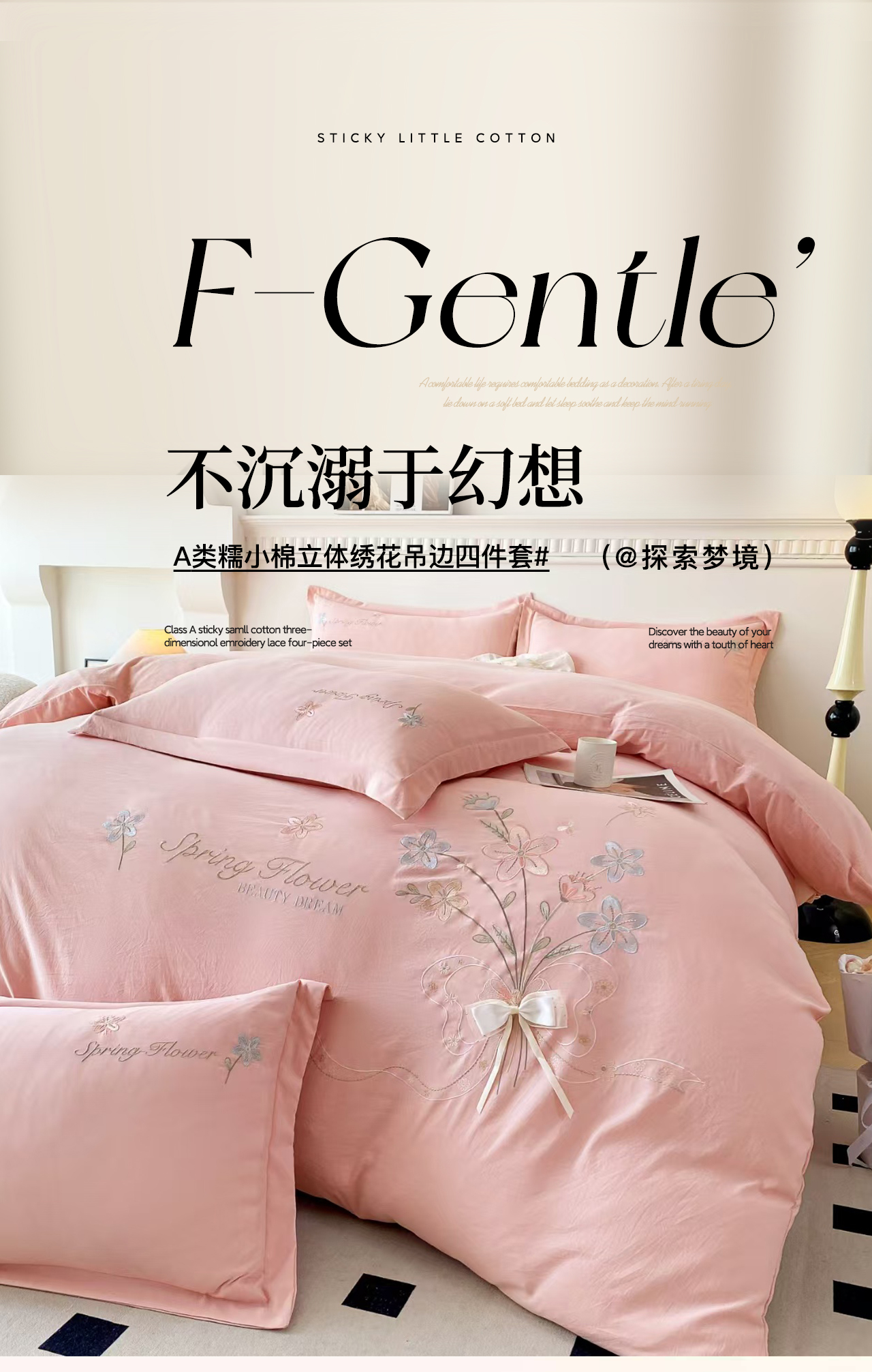 (总)大麦乐田 2025新款糯小棉立体绣花吊边四件套-蝶梦花语,蝶梦花语 粉玉,蝶梦花语 桔色,蝶梦花语 浅兰,蝶梦花语 浅绿,蝶梦花语 浅紫