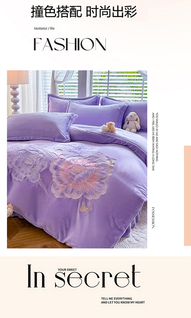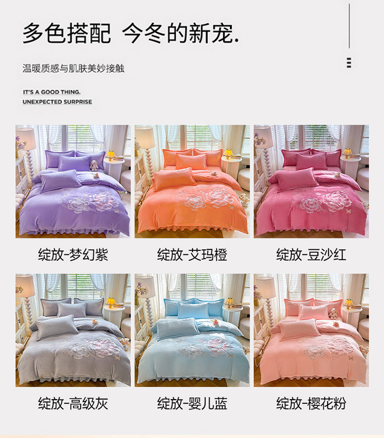 (总)漫布云2025秋冬新款全消光大版花卉平绣牛奶绒刺绣款四件套--绽放系列,绽放-艾玛橙 ,绽放-豆沙红 ,绽放-高级灰,绽放-梦幻紫 ,绽放-婴儿蓝 ,绽放-樱花粉