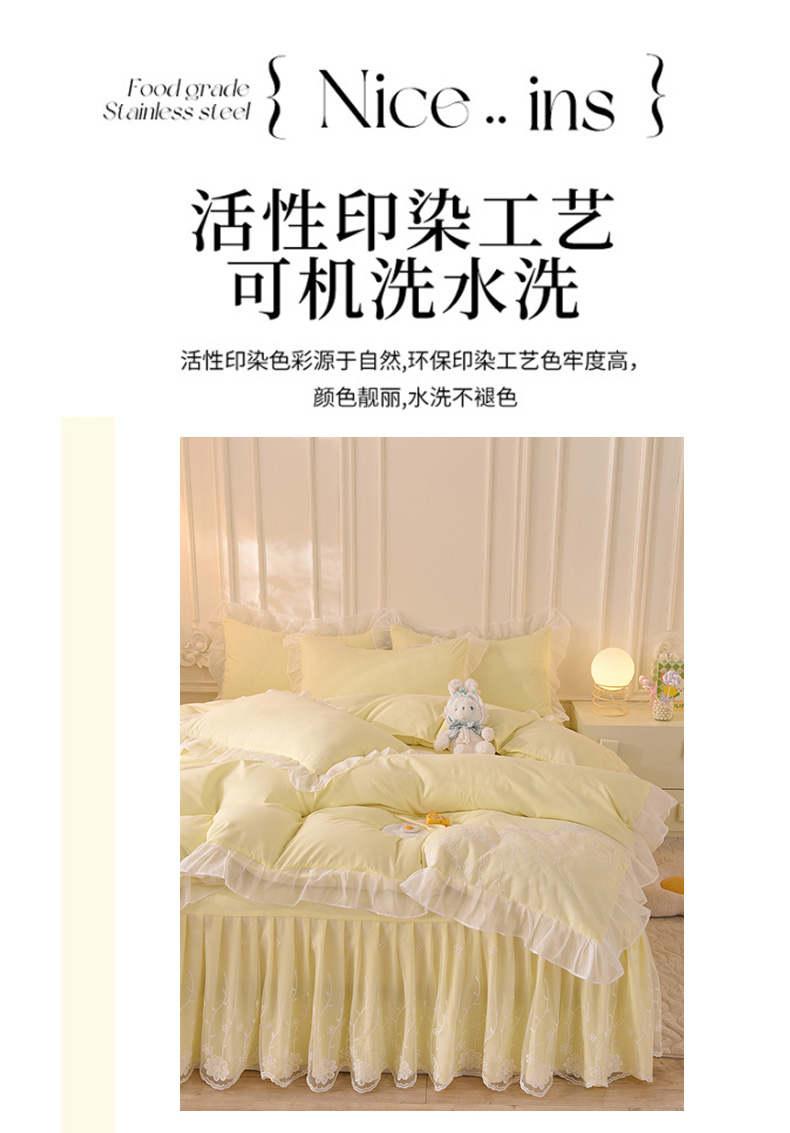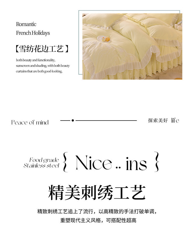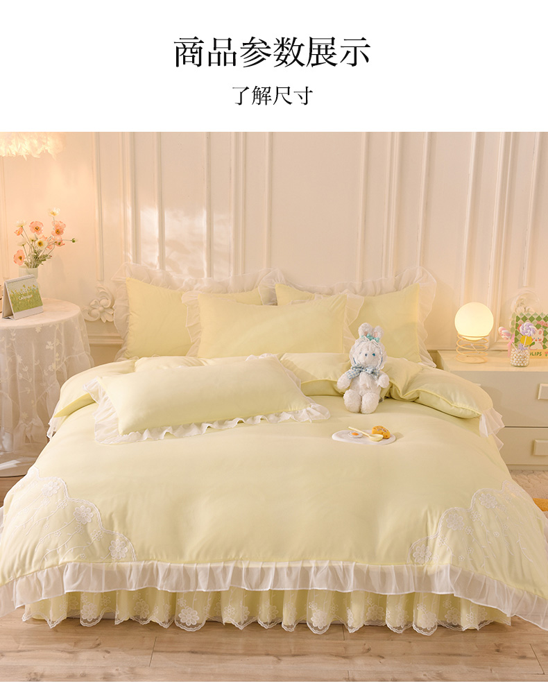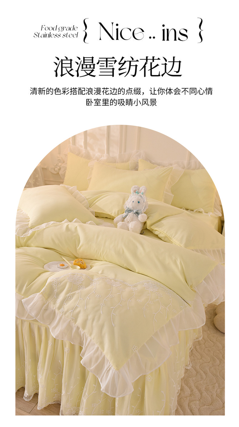 商品名称:后庭寝室 2025新款亲肤雪纺花边刺绣蕾丝公主四件套-花香系列 花香-浅果绿