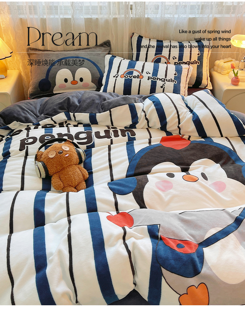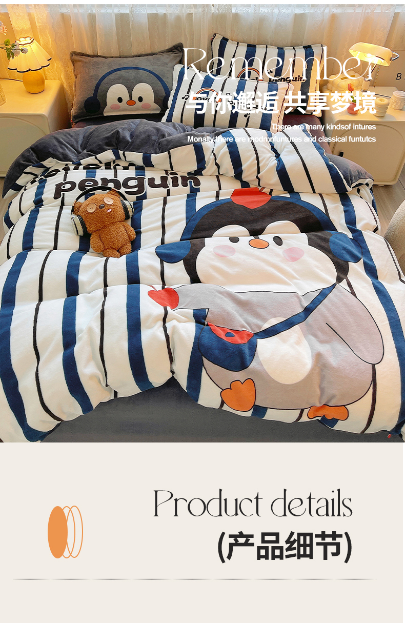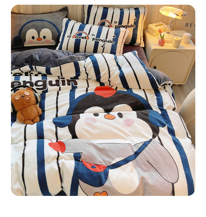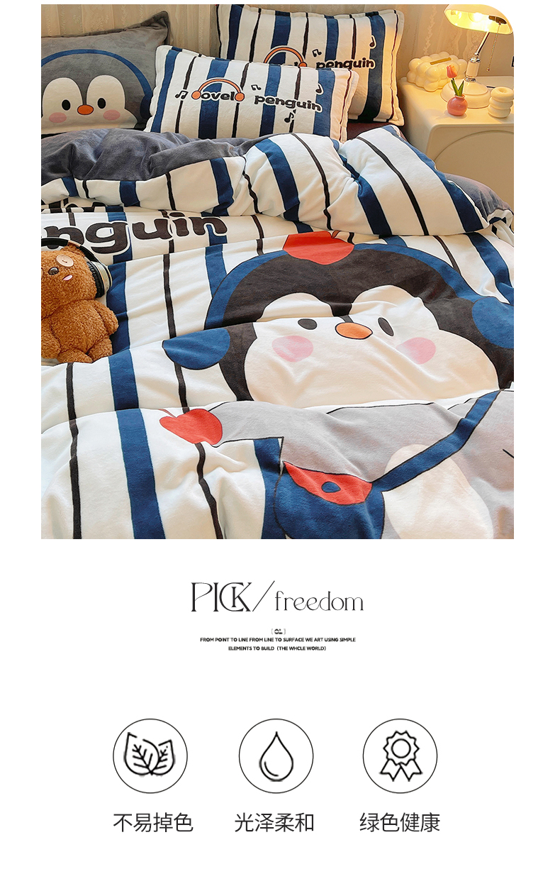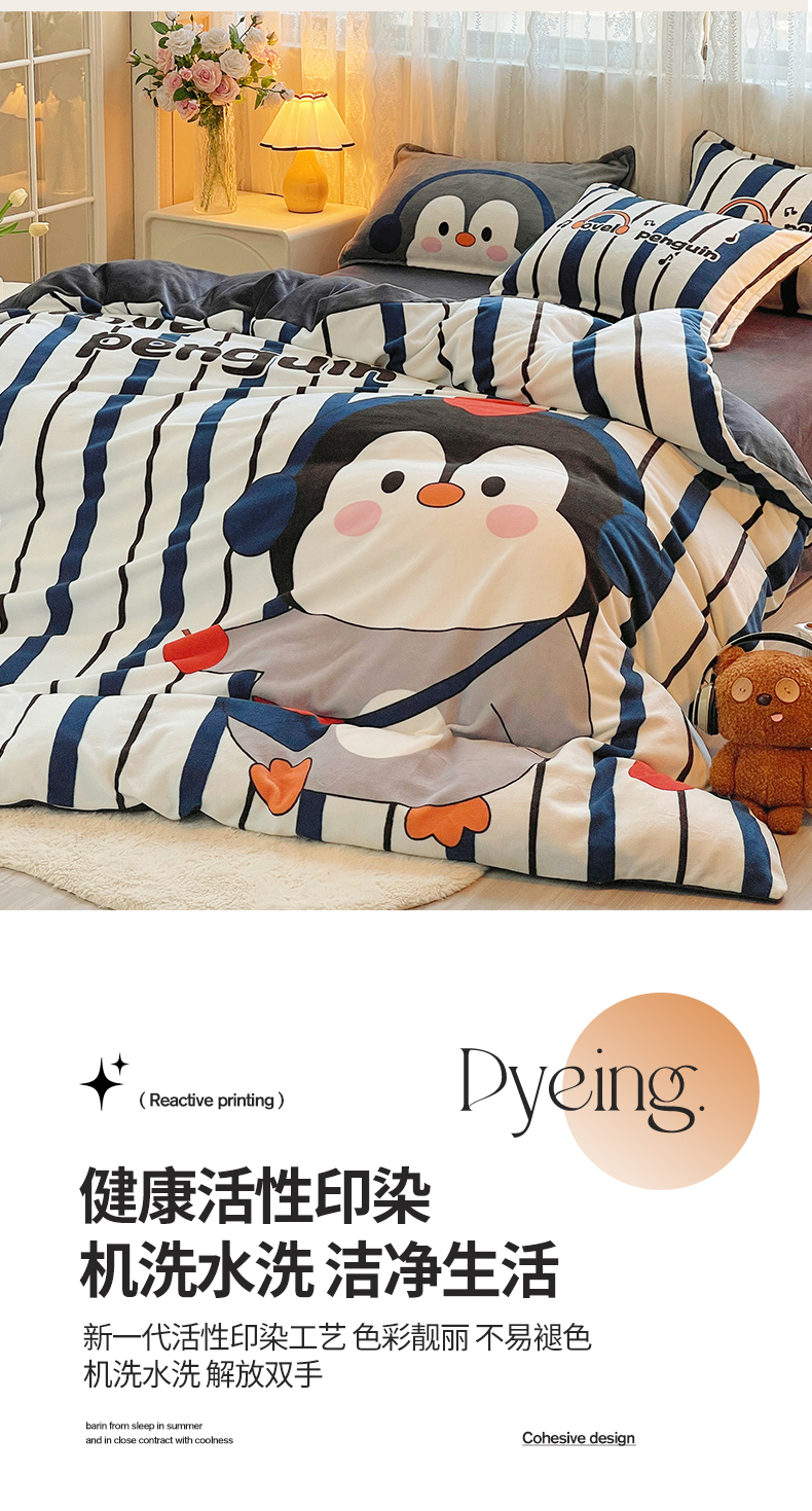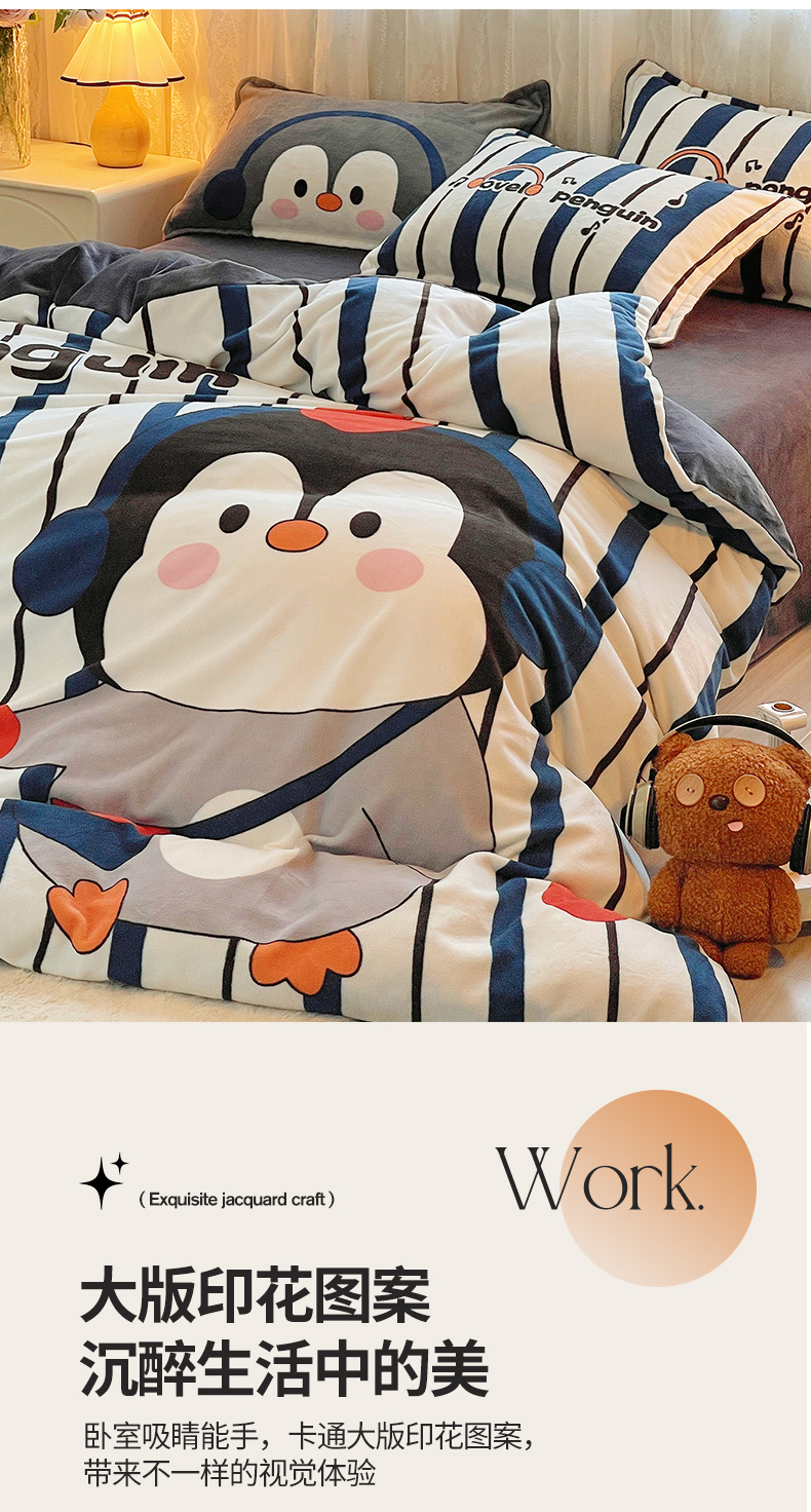 炫拼家纺 2025新款大版数码印花卡通高克重牛奶绒四件套 元气企鹅