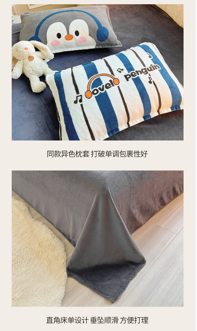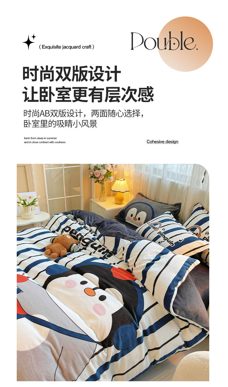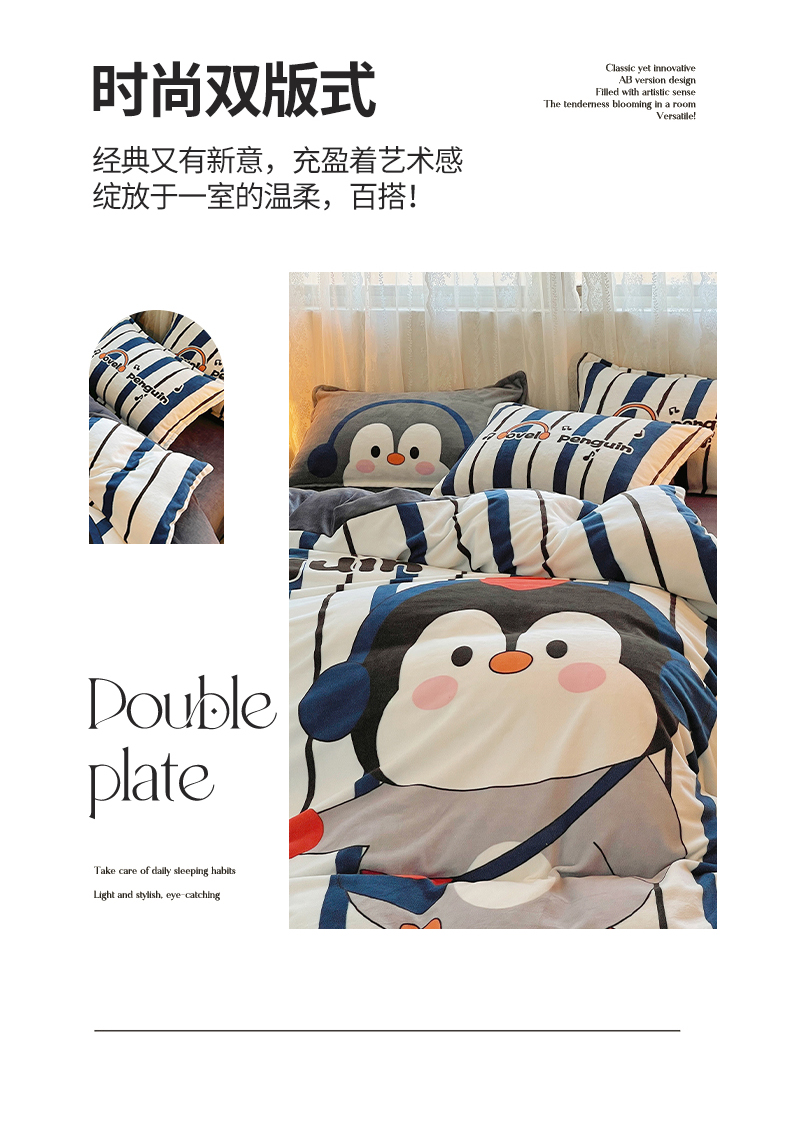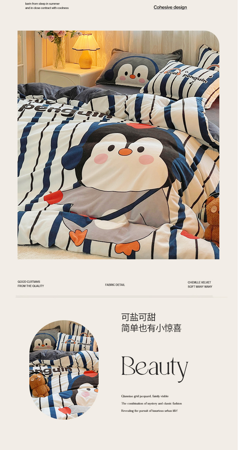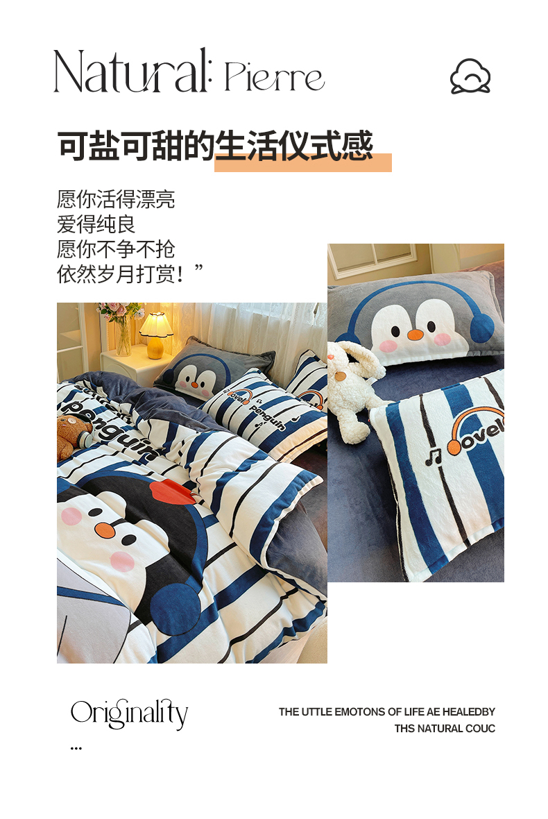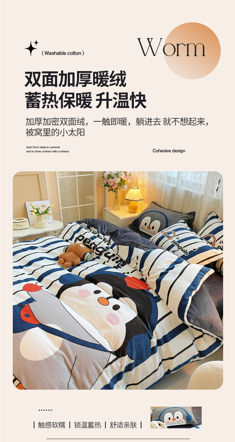 炫拼家纺 2025新款大版数码印花卡通高克重牛奶绒四件套 元气企鹅