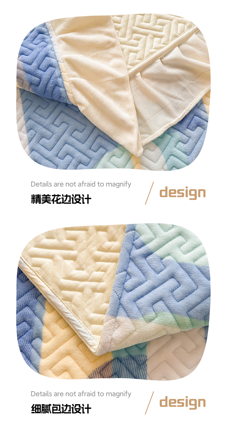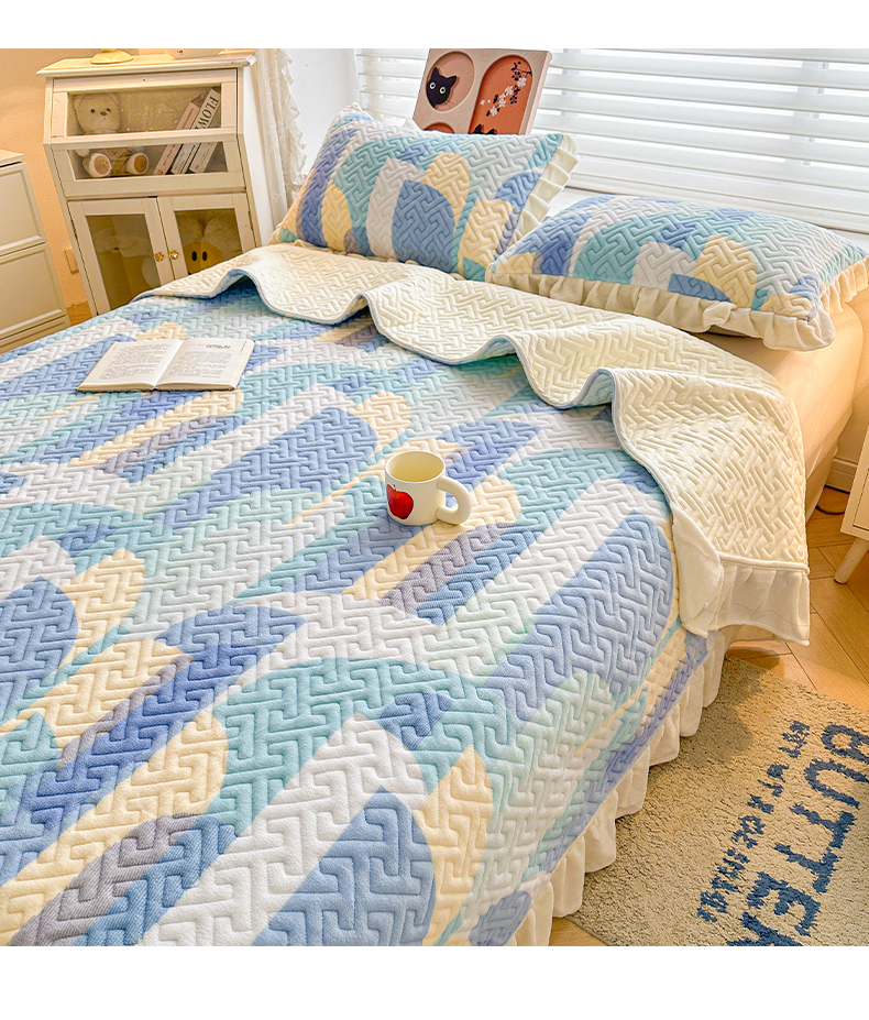 商品名称:凯罗 2025新款牛奶绒花边床盖印花小清新盖毯加大牛奶绒床盖床单 诗意蓝月
