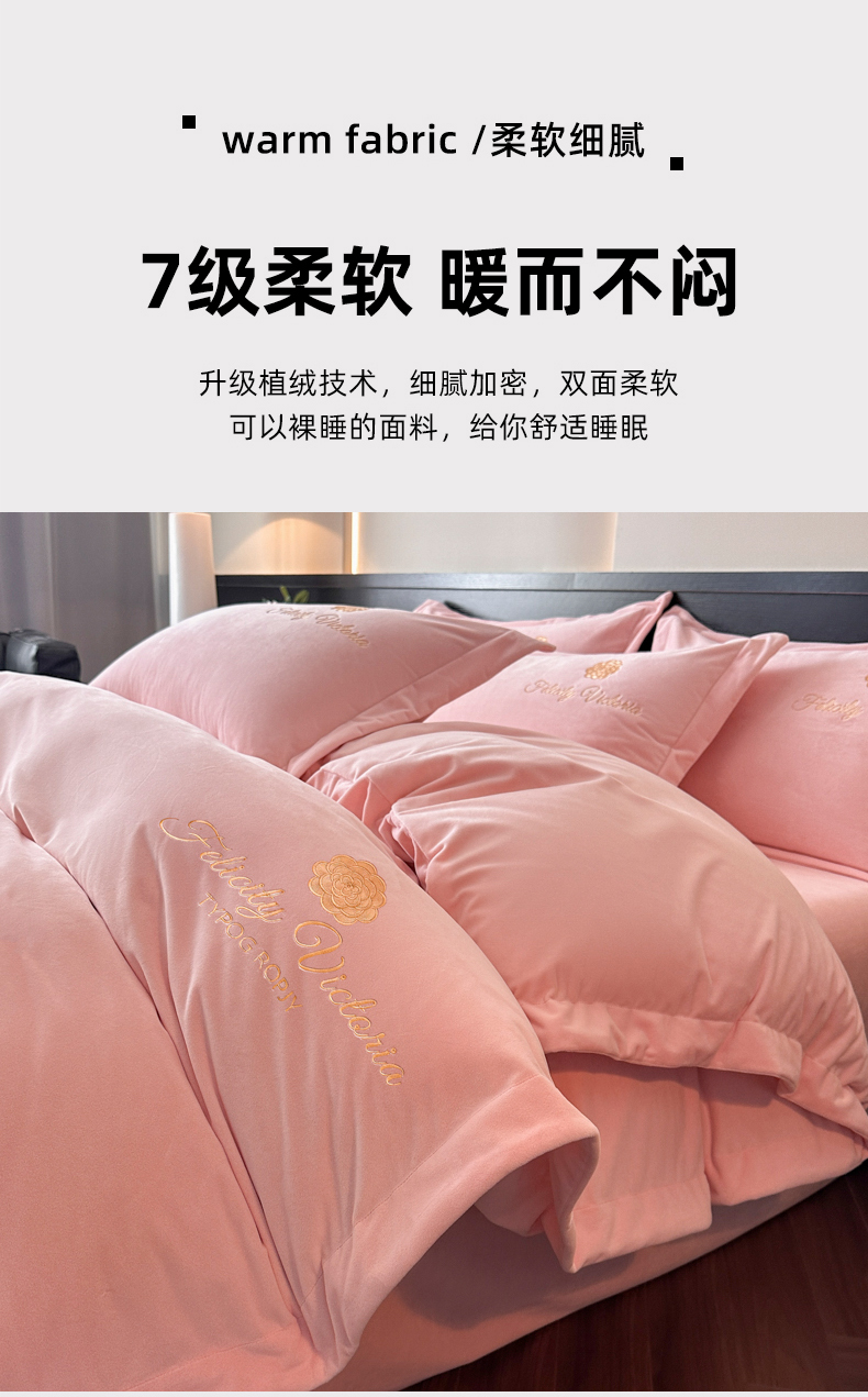 商品名称:鸿织源2025新款-茶颜系列 宝宝绒宽边四件套 茶颜-樱粉