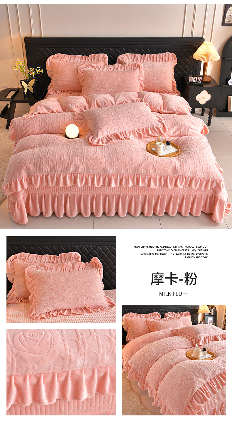 商品名称:赫本家纺 2025新款高克重纯色花边款雕花绒床盖款四件套 摩卡-粉