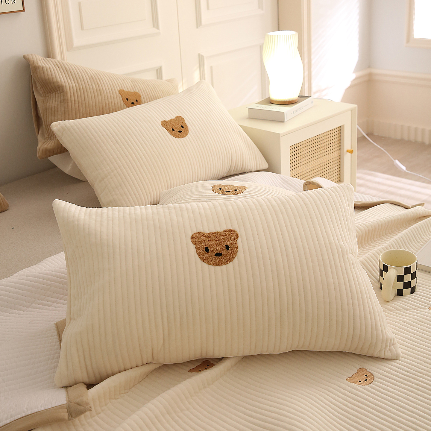 (总)期遇家居 2025新款夹棉绗缝绒枕套毛巾绣绒小熊枕套,绒小熊白,绒小熊灰,绒小熊玉,绒小熊咖