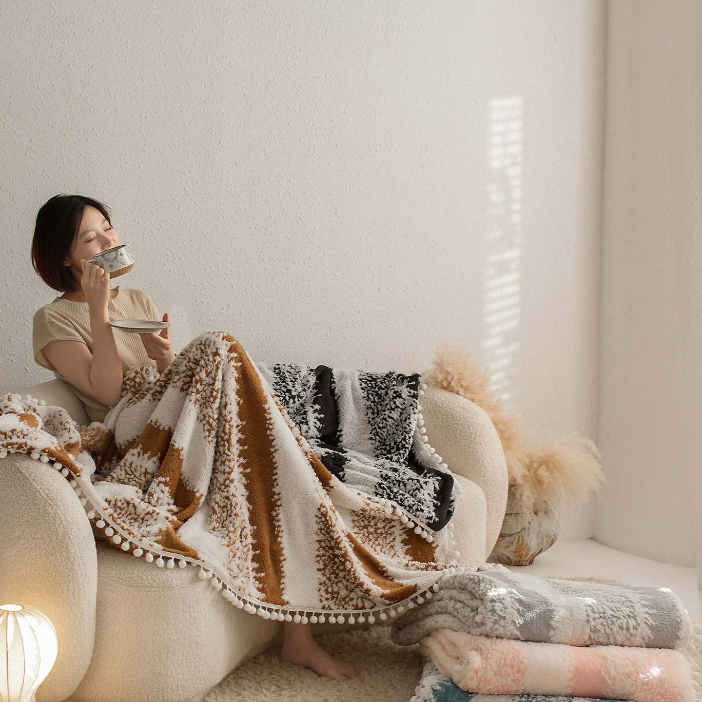 商品名称:安莱生活 2025新款阳离子羊羔绒200克毛毯--森语雪球系列 森语雪球-棕咖