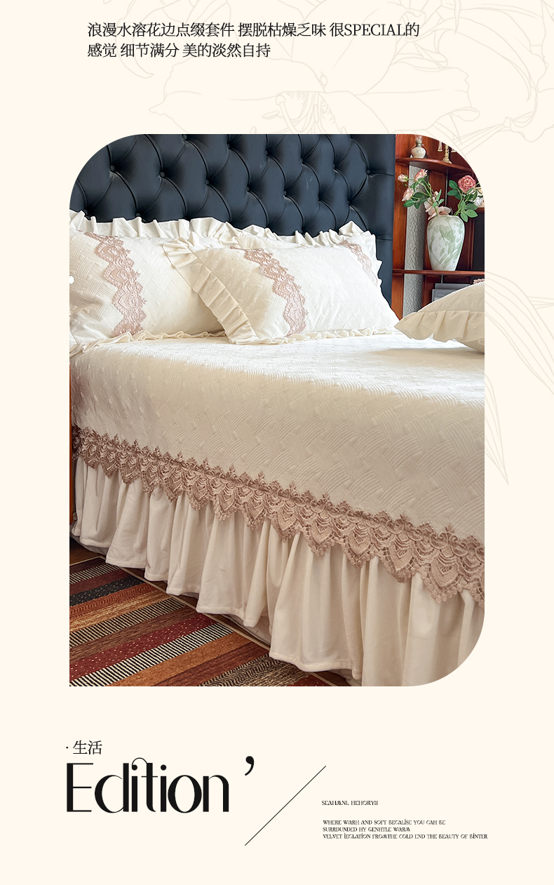 • 91家纺网 家纺一手货源 找家纺 (总)瑞宝 2025新款雕花牛奶绒花边夹棉床盖四件套-莫妮卡,奶昔白,抹茶绿,奶茶咖,少女粉,雾蓝