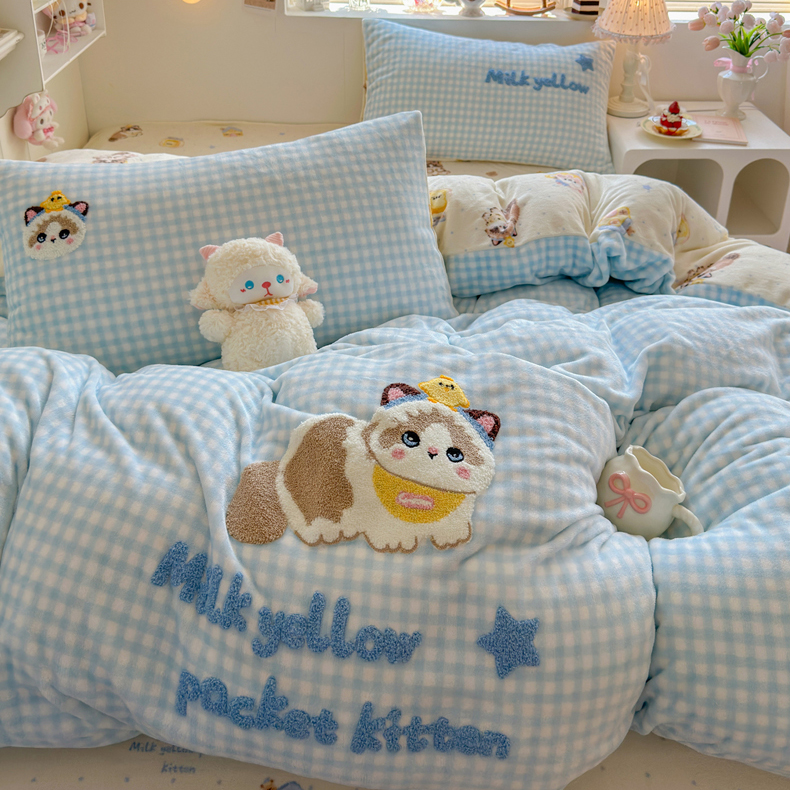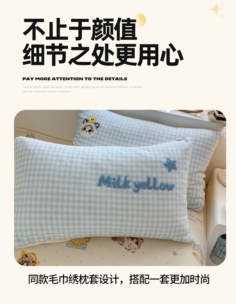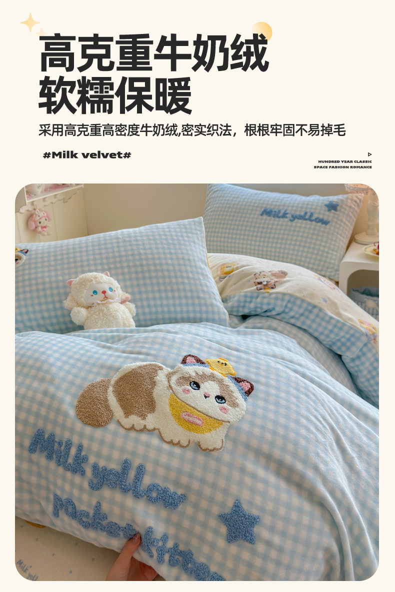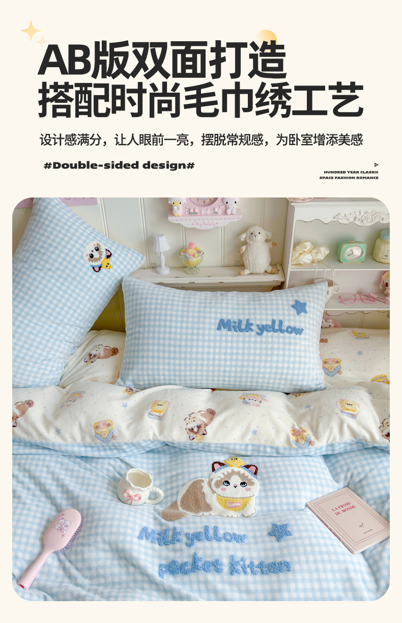 商品名称:Sweet dreams甜梦 2025新款全消光牛奶绒毛巾绣印花四件套 斑点小猫