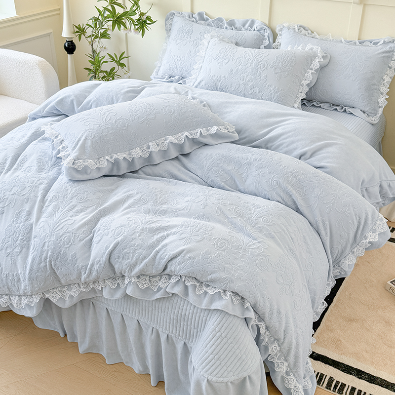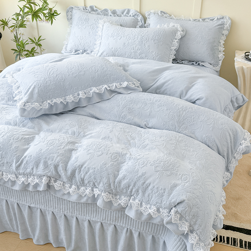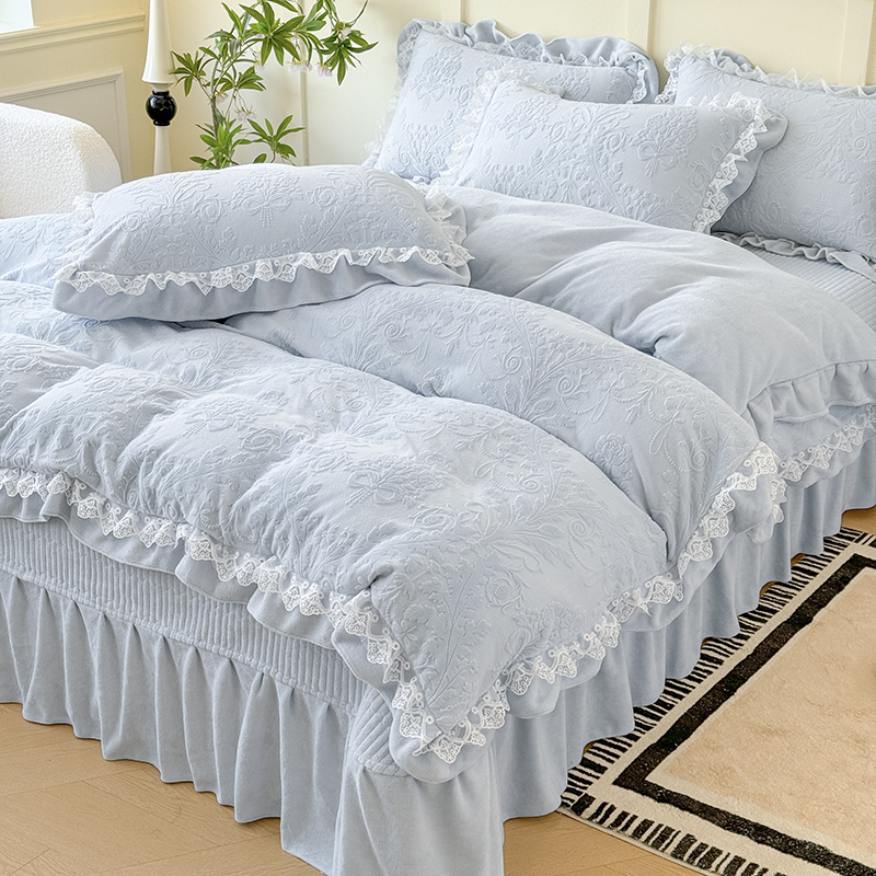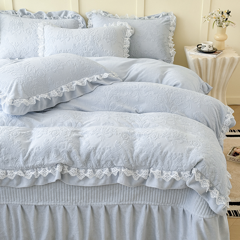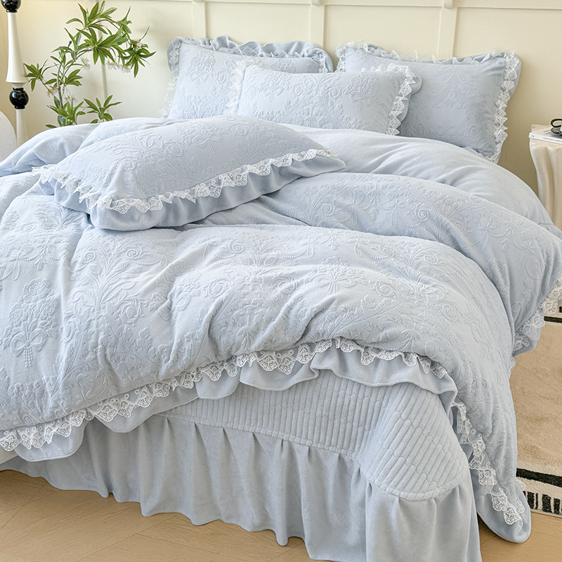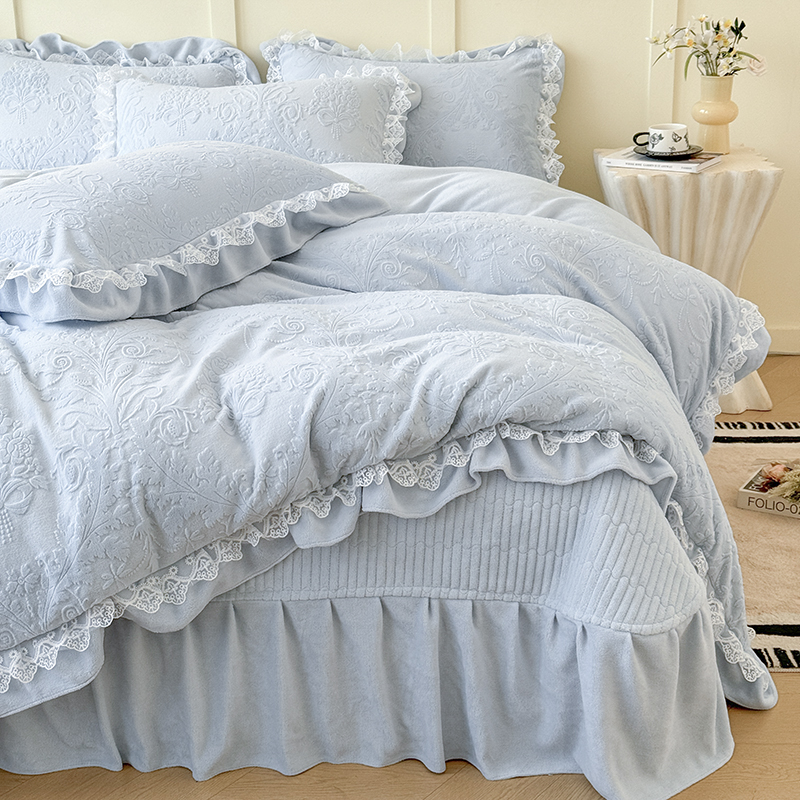雅眠居 2025新款韩版花边高克重雕花绒牛奶绒床盖四件套 安娜花园-天空蓝