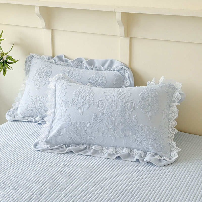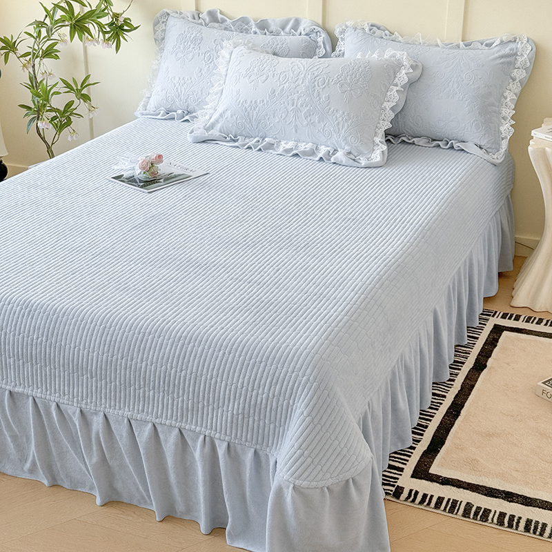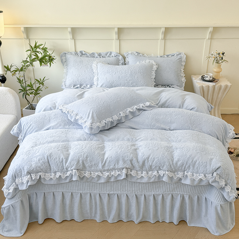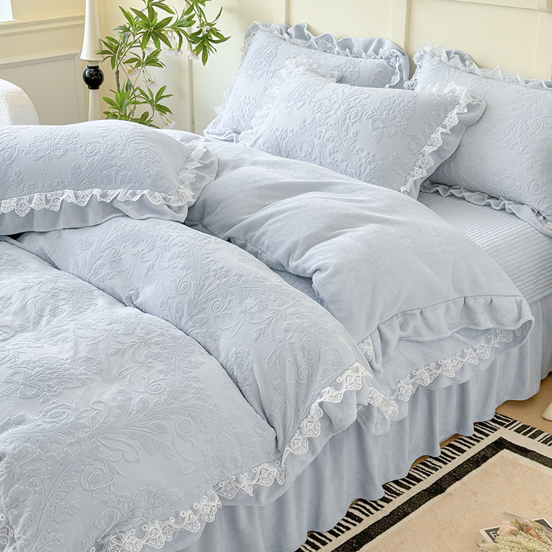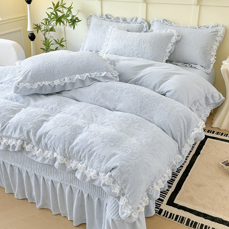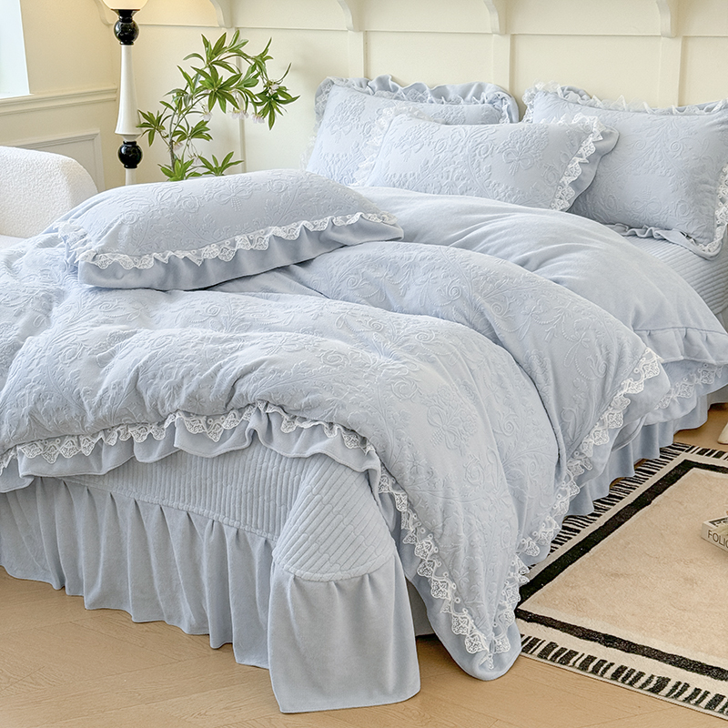 雅眠居 2025新款韩版花边高克重雕花绒牛奶绒床盖四件套 安娜花园-天空蓝