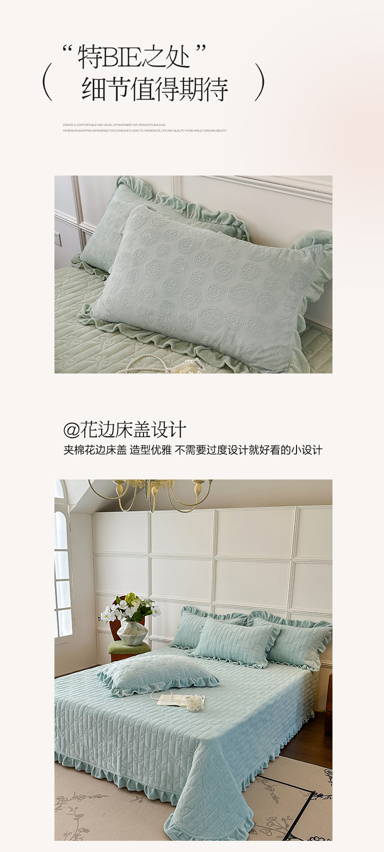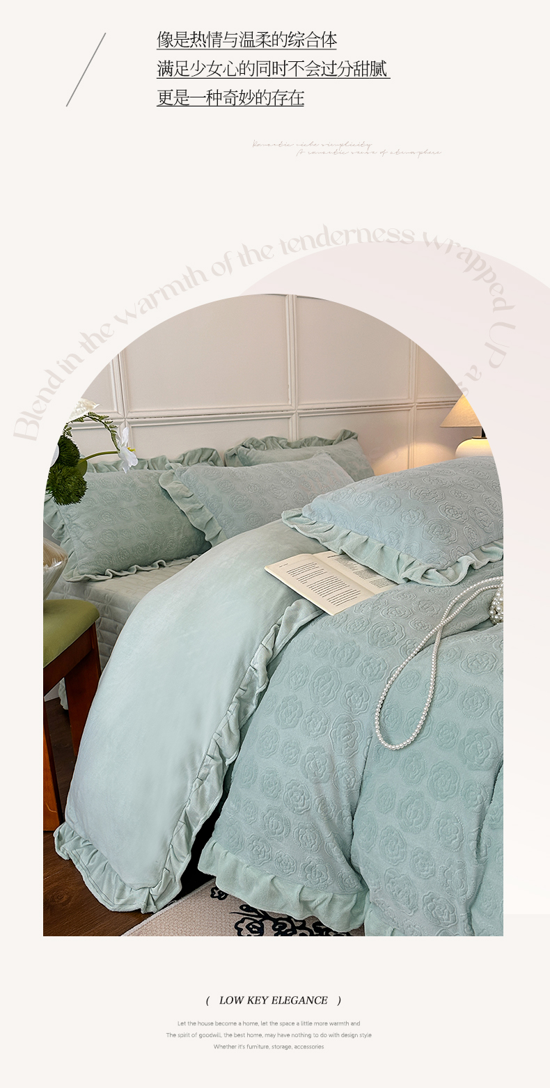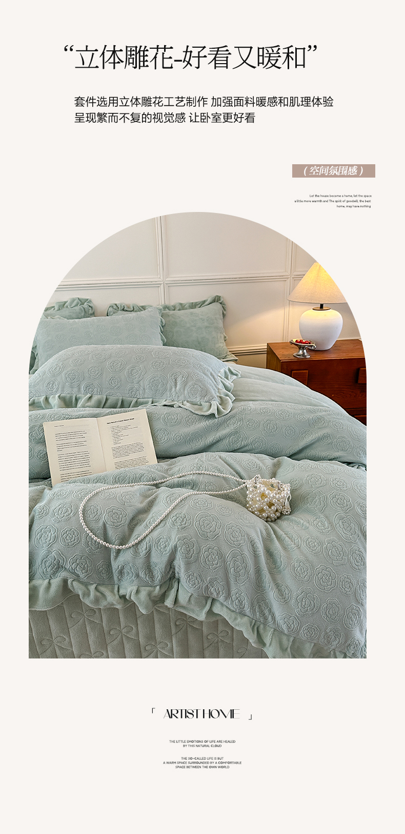 当前位置: 91家纺网 > 商品网购 > 床品套件 > 四件套 > 牛奶绒四件套 > 野合家纺 2025新款法式A类雕花牛奶绒韩版公主风四件套床盖款床单款床笠款 山茶花-马利兰