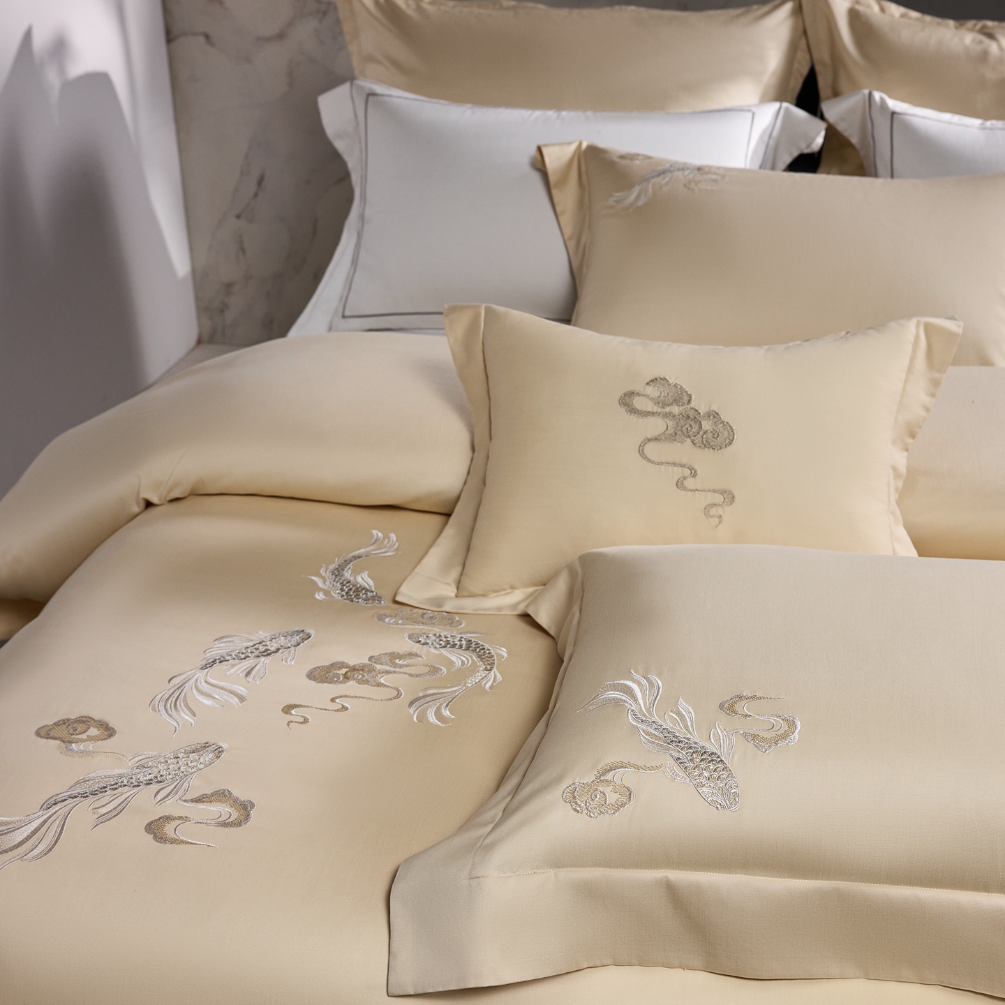 商品名称:淼铭家纺 2025秋冬新款新中式天丝棉磨毛刺绣工艺四件套-锦鲤系列 锦鲤-金
