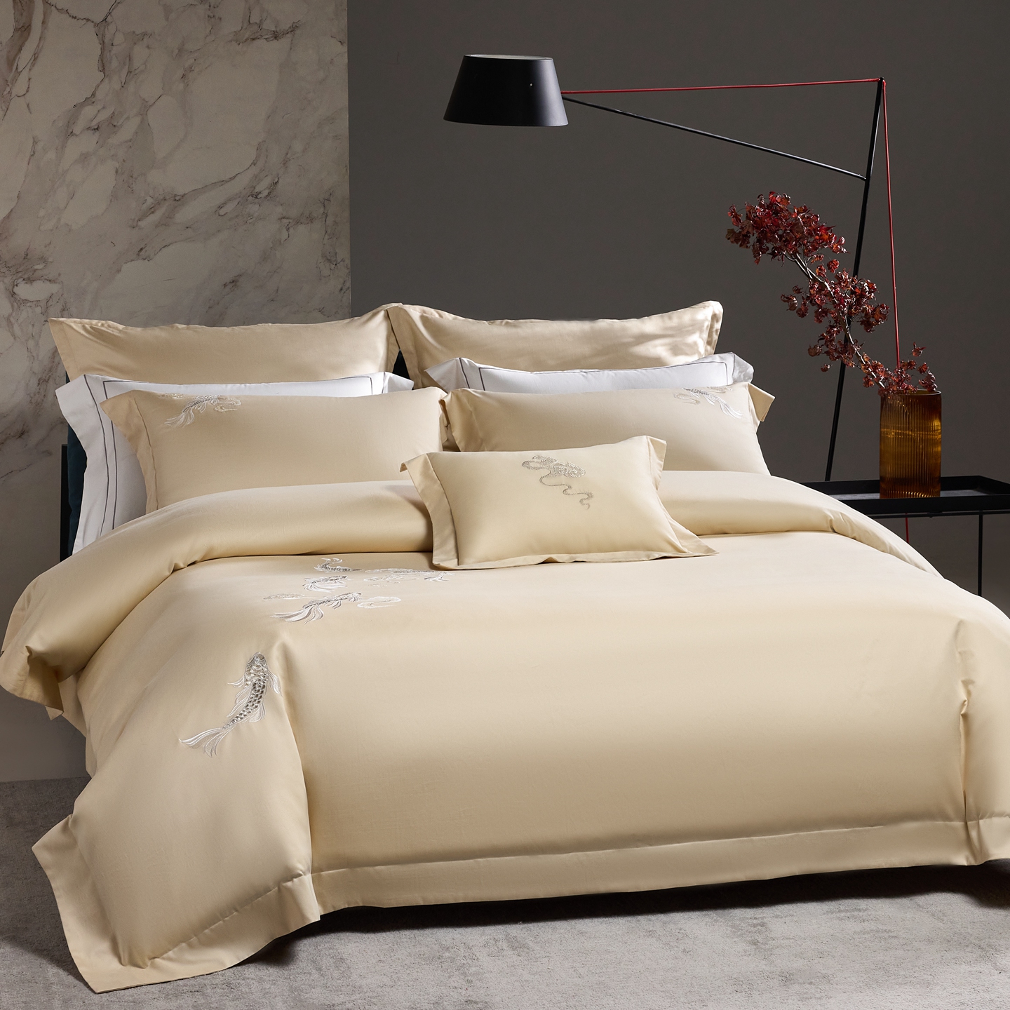 淼铭家纺 2025秋冬新款新中式天丝棉磨毛刺绣工艺四件套-锦鲤系列 锦鲤-金