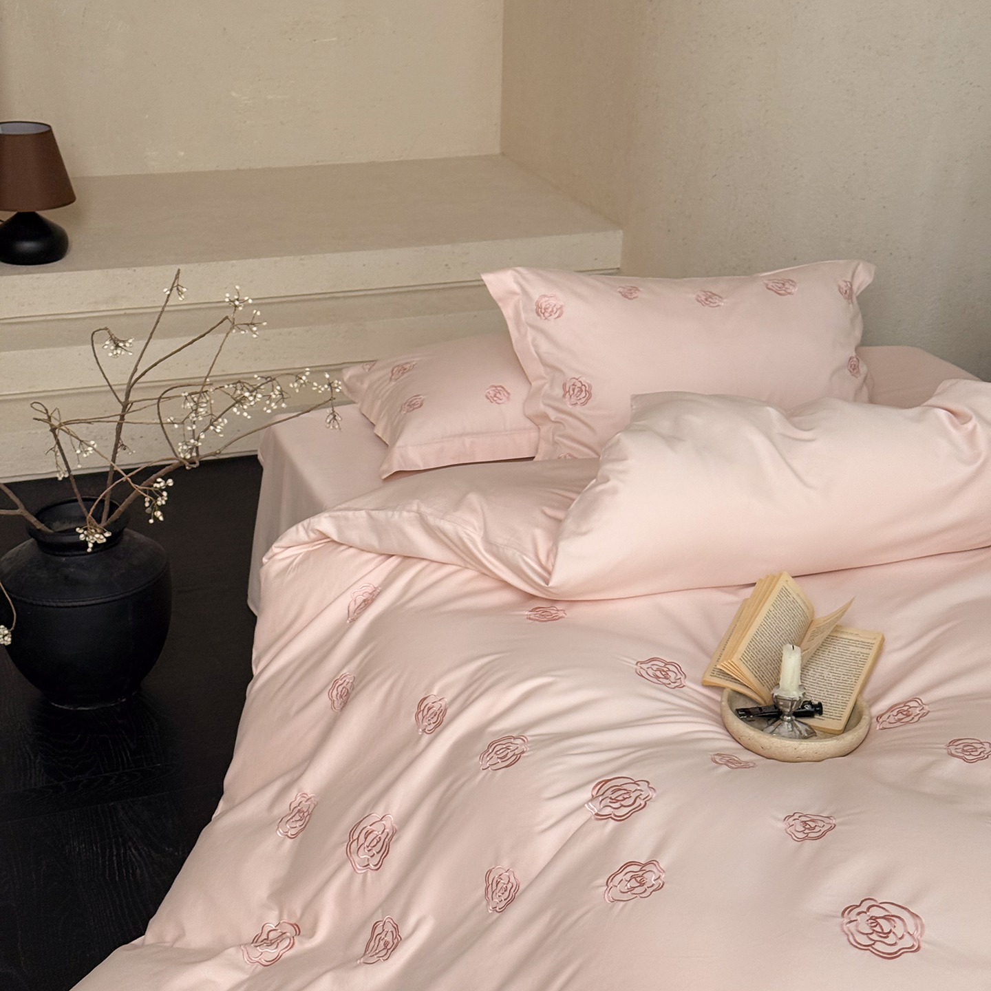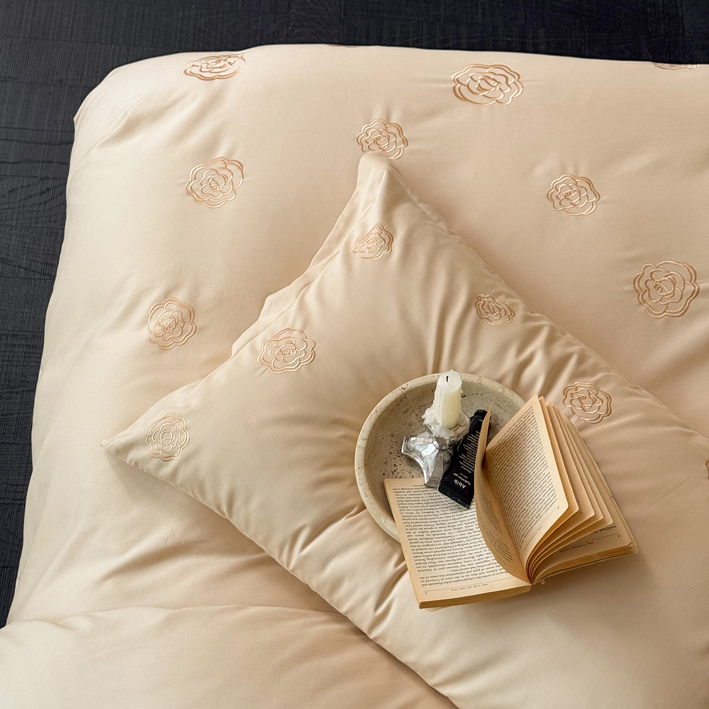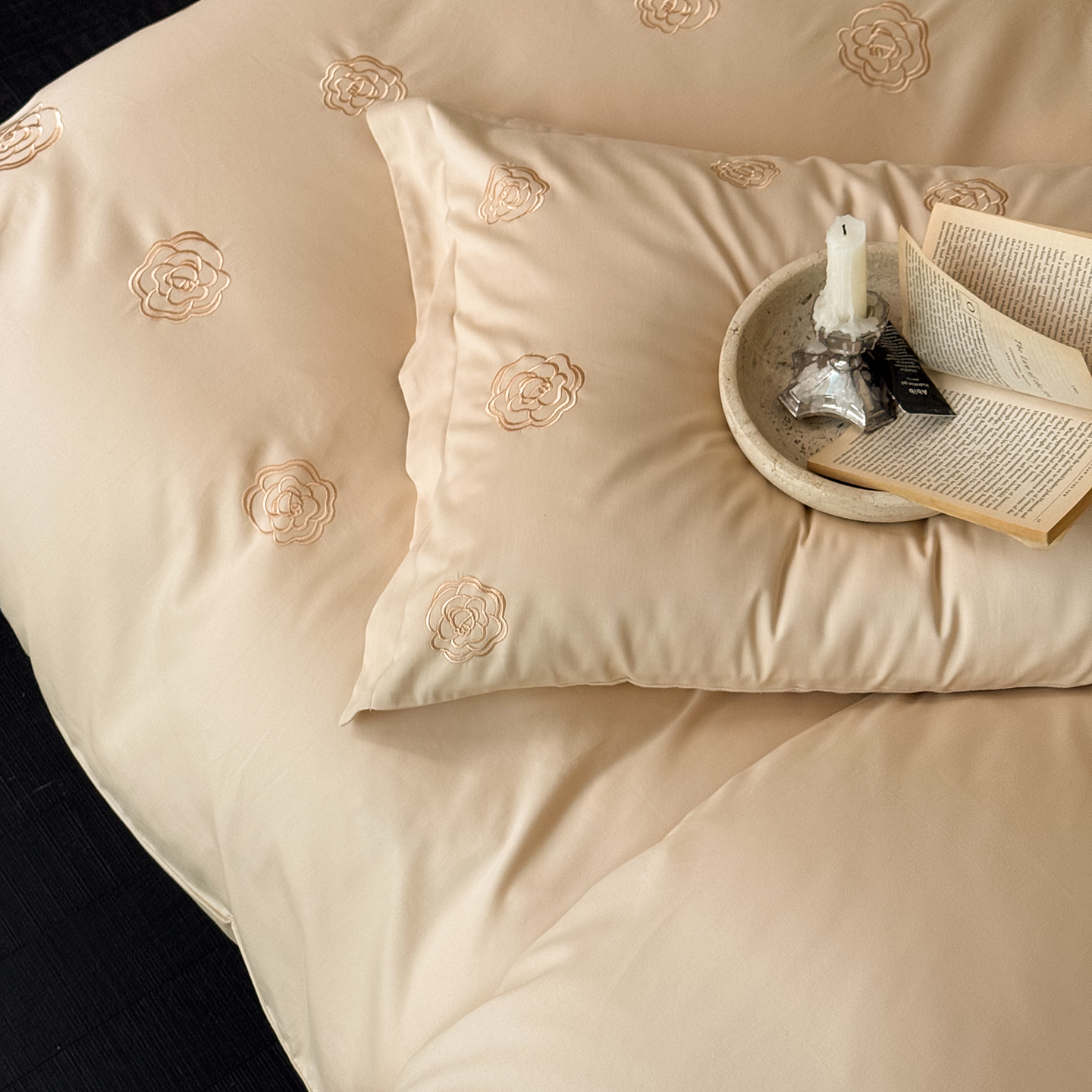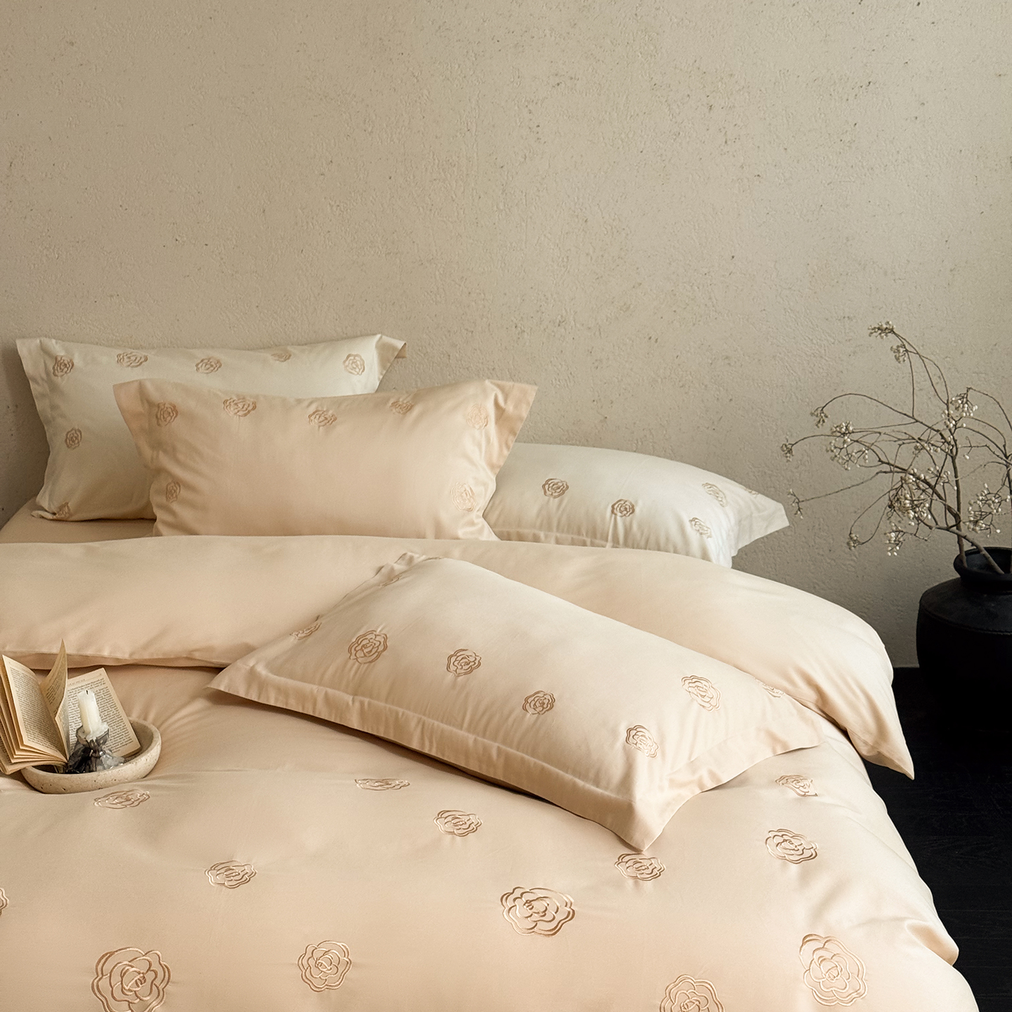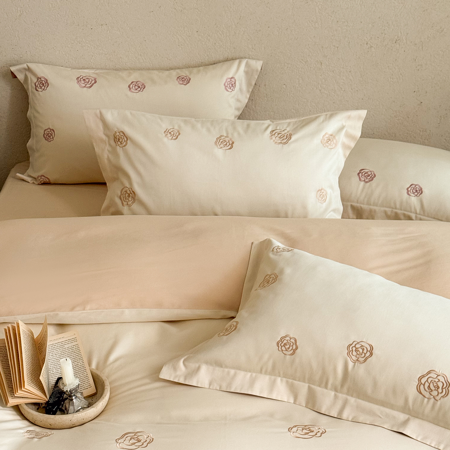 (总)佳汐蓝 2025春夏新品双层皱皱纱刺绣+织带+荷叶边四件套--白茶花,奶白,曲奇