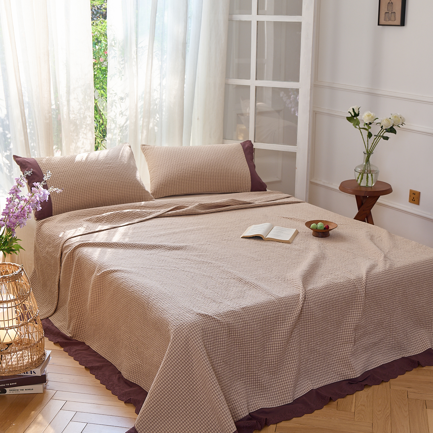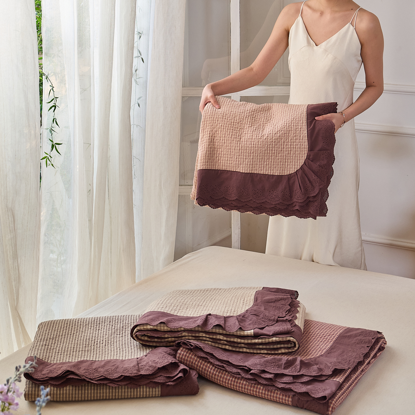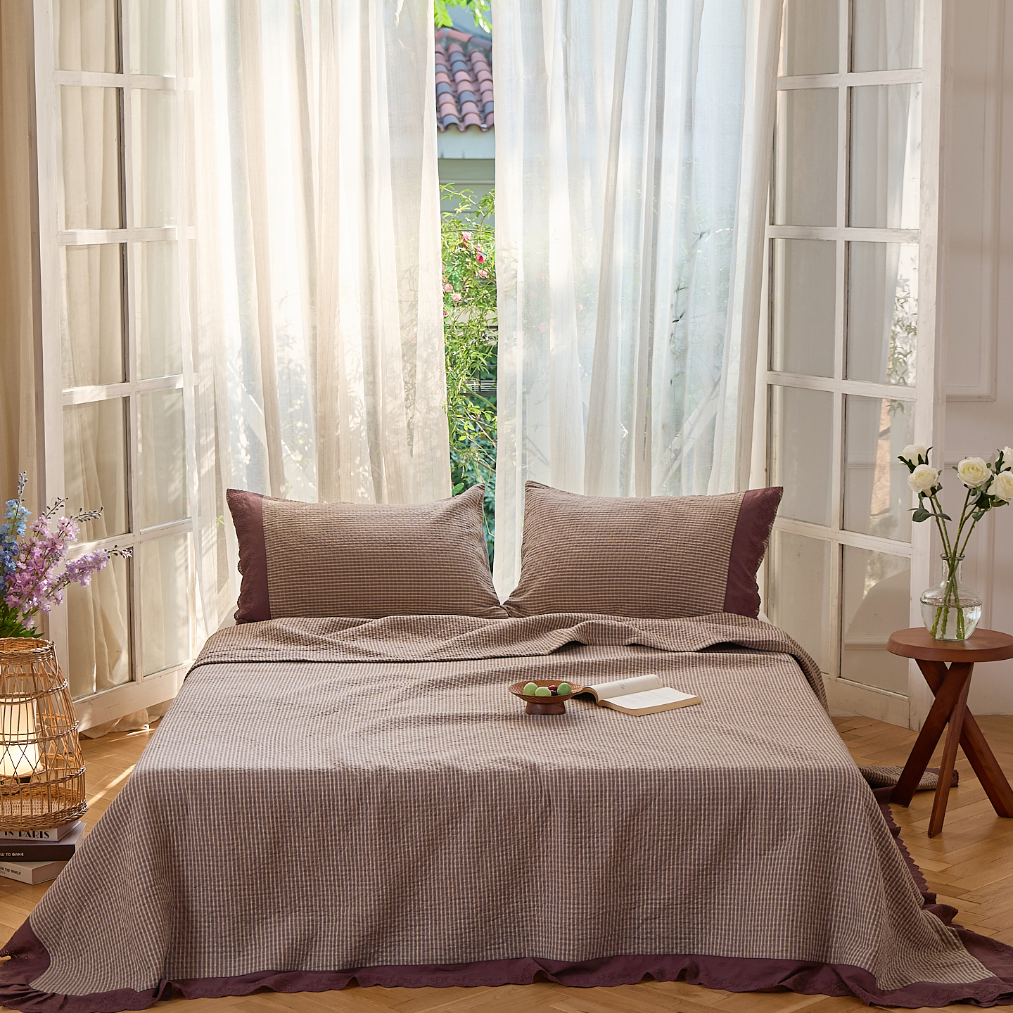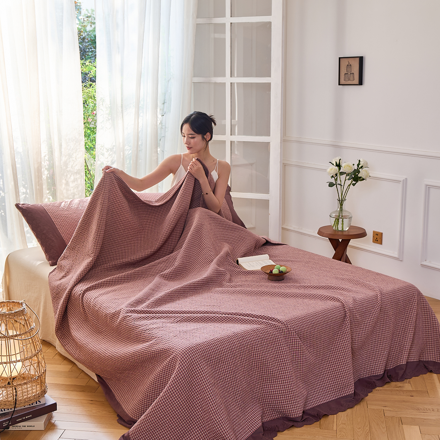 (总)沐瑟家纺 2025新款全棉纱布细纱布大床盖毯子床盖三件套LV系列,LV咖色,春意浓,玫瑰之约,小天鹅-绿,绽放-红色,绽放-姜黄