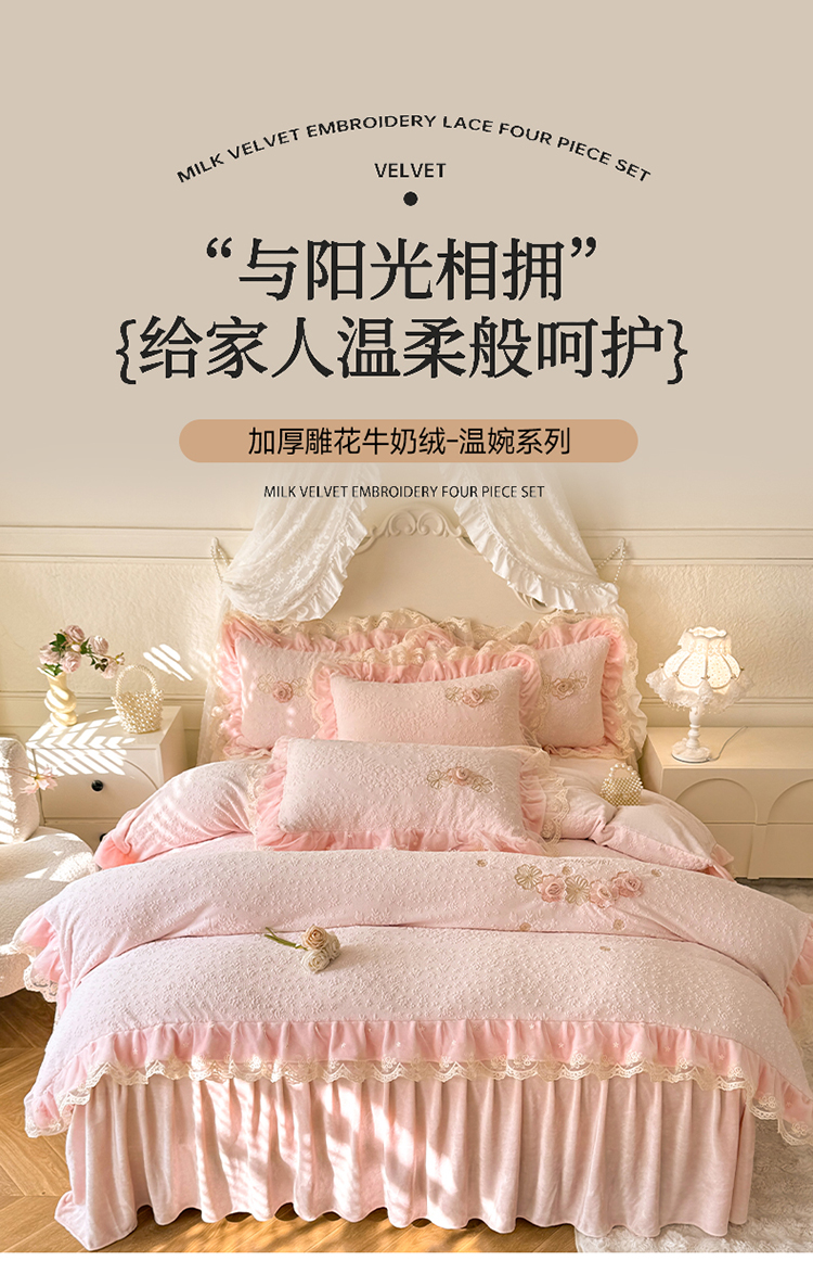 当前位置: 91家纺网 > 商品网购 > 床品套件 > 四件套 > 牛奶绒四件套 > 2025漫布云纺360g全消光牛奶绒工艺款蕾丝盘花立体雕花绒牛奶绒四件套刺绣绣花套件 温婉-奶油白