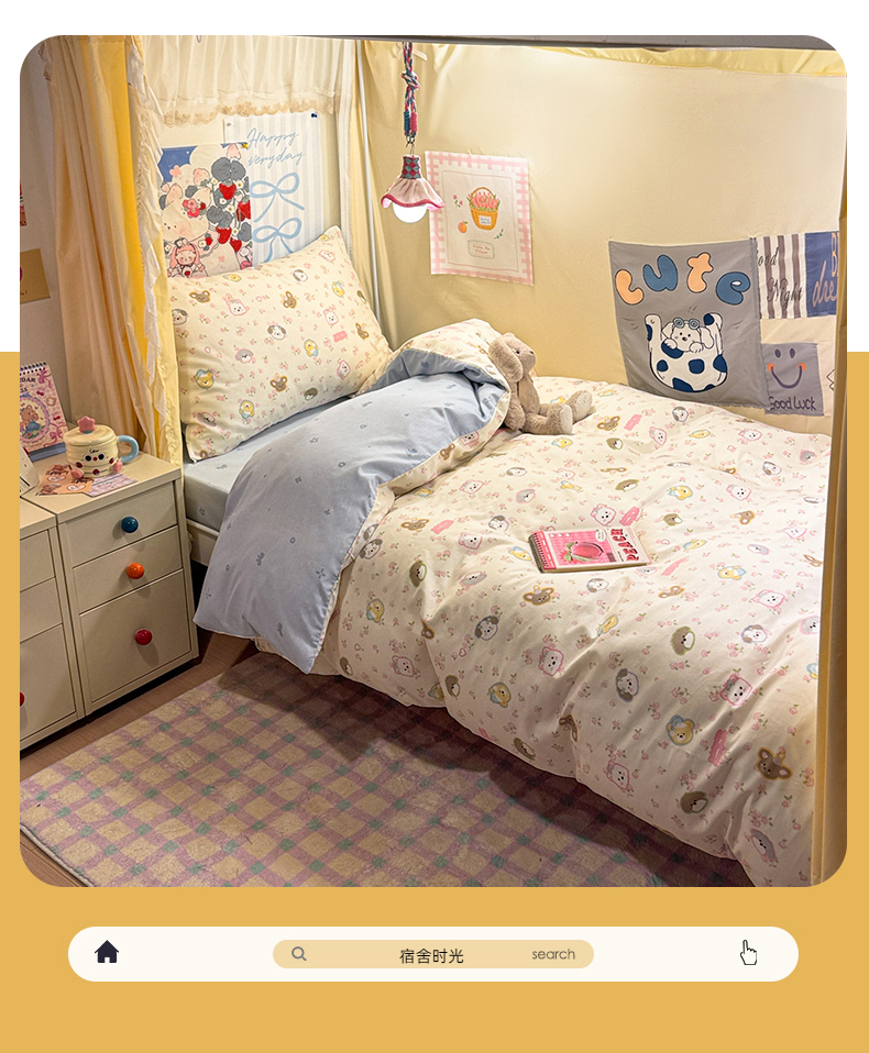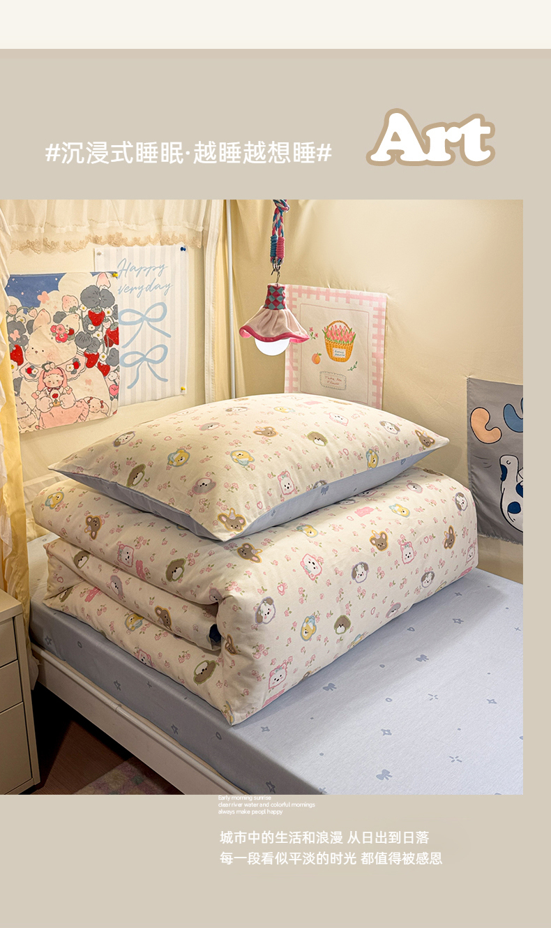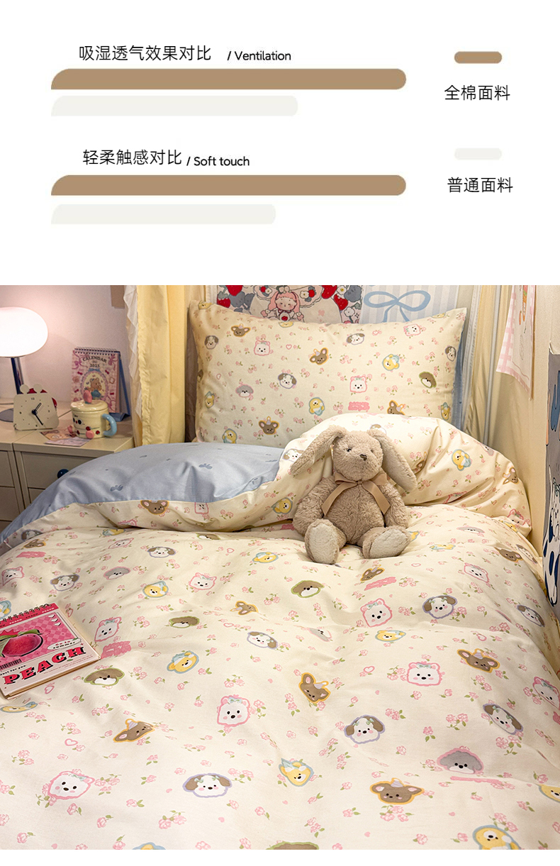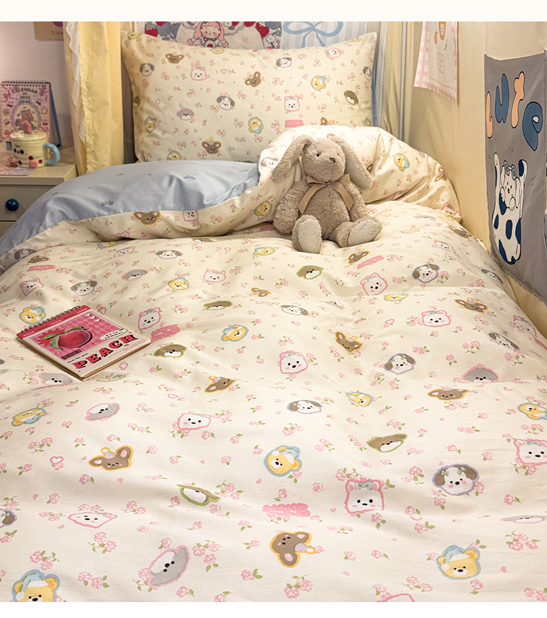 当前位置: 91家纺网 > 商品网购 > 床品套件 > 三件套 > 简宜家居(朝初家纺) 2025新款全棉12868斜纹卡通花卉学生三件套四件套 萌友聚会