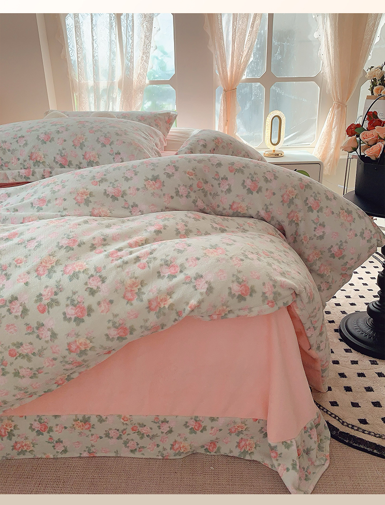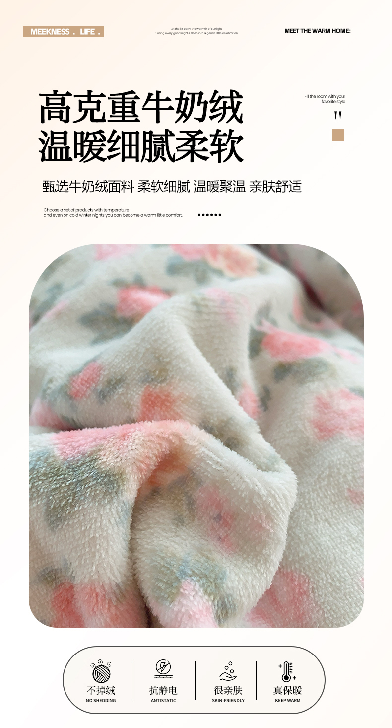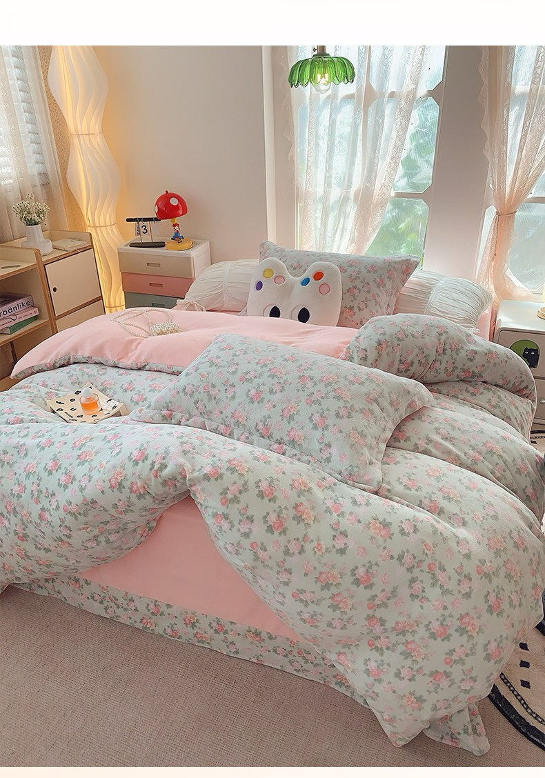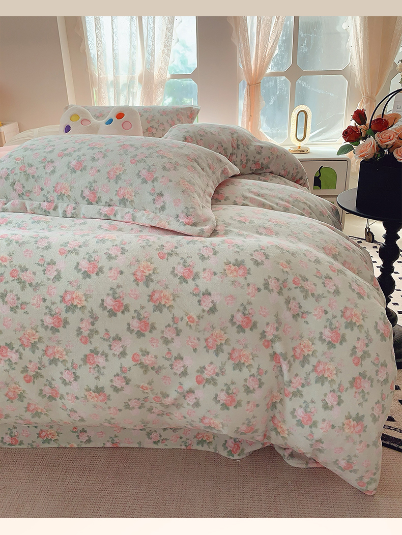商品名称:奈萝家纺 2025新款加厚小清新印花牛奶绒三件套四件套 温馨花语绿