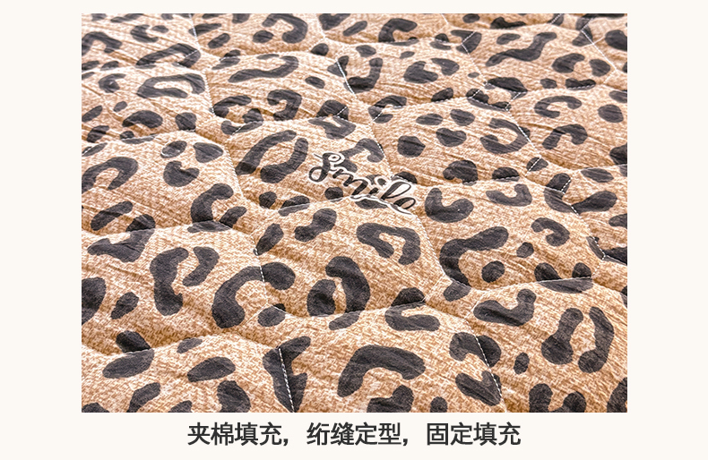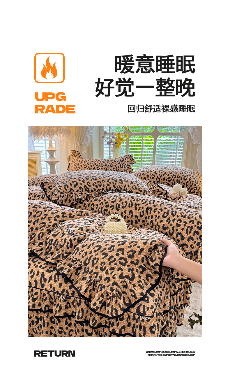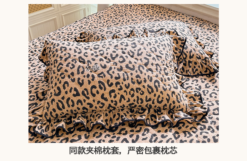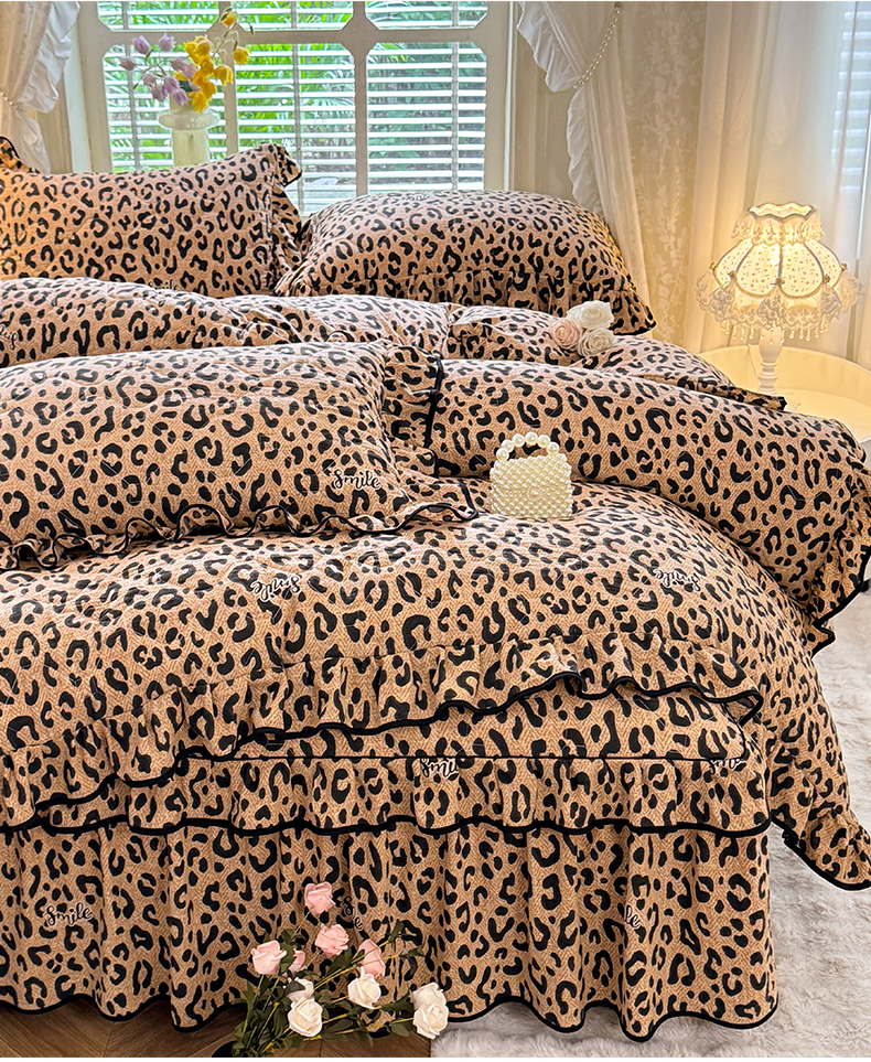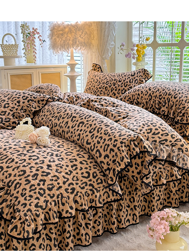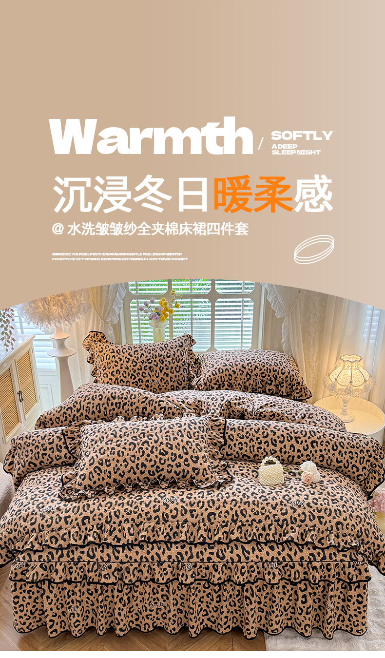 优家居 2025新品水洗棉全夹棉床裙四件套韩版糯糯棉水洗皱皱纱床罩花边被套枕套直播爆款 豹纹-咖