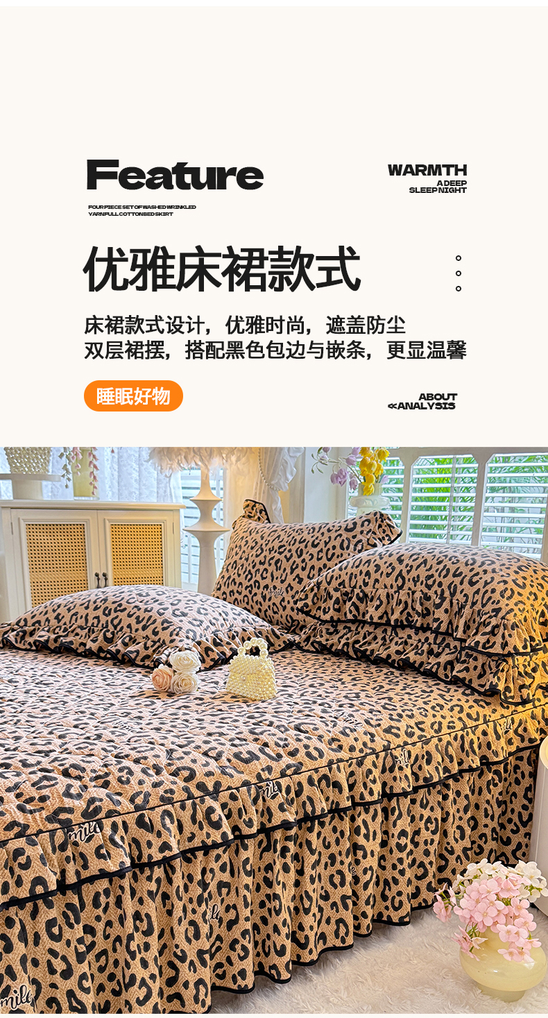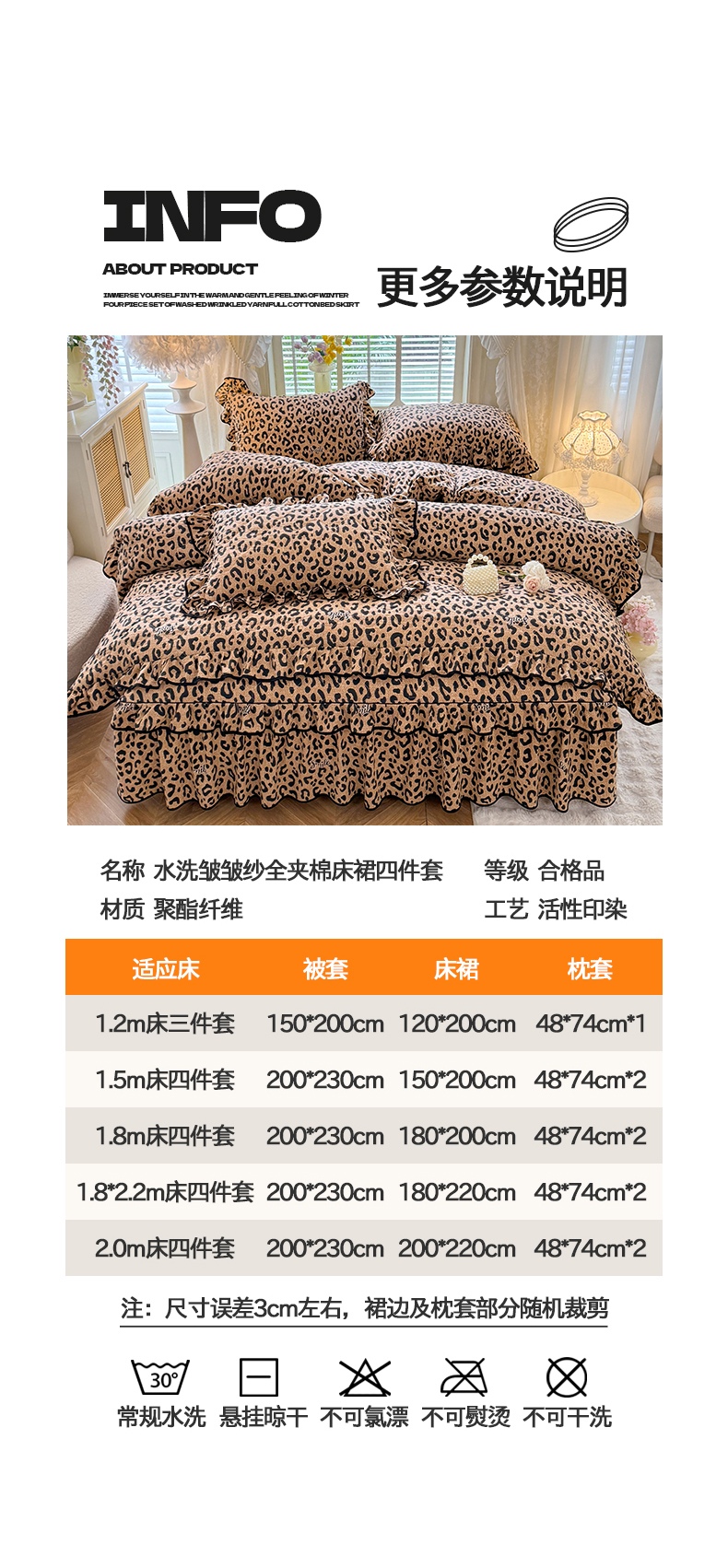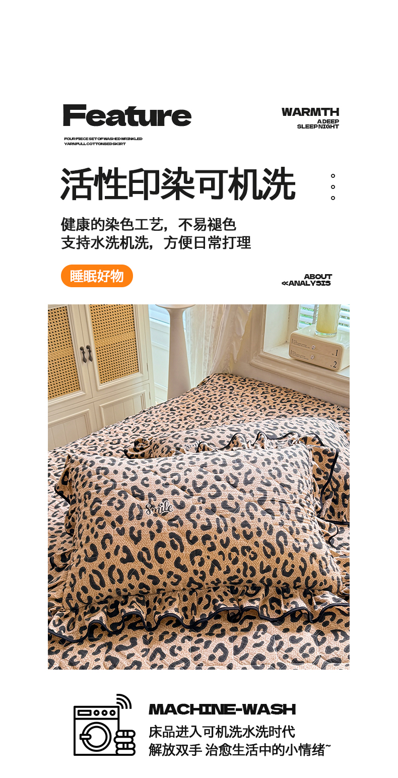 商品名称:优家居 2025新品水洗棉全夹棉床裙四件套韩版糯糯棉水洗皱皱纱床罩花边被套枕套直播爆款 豹纹-咖