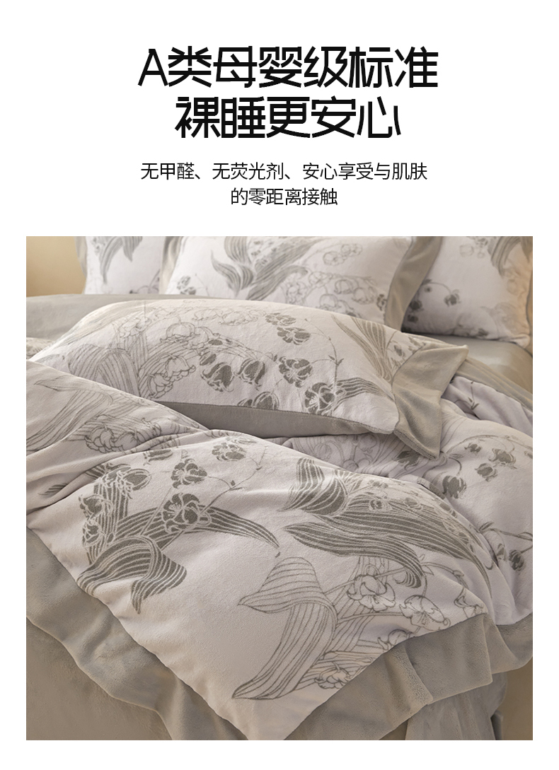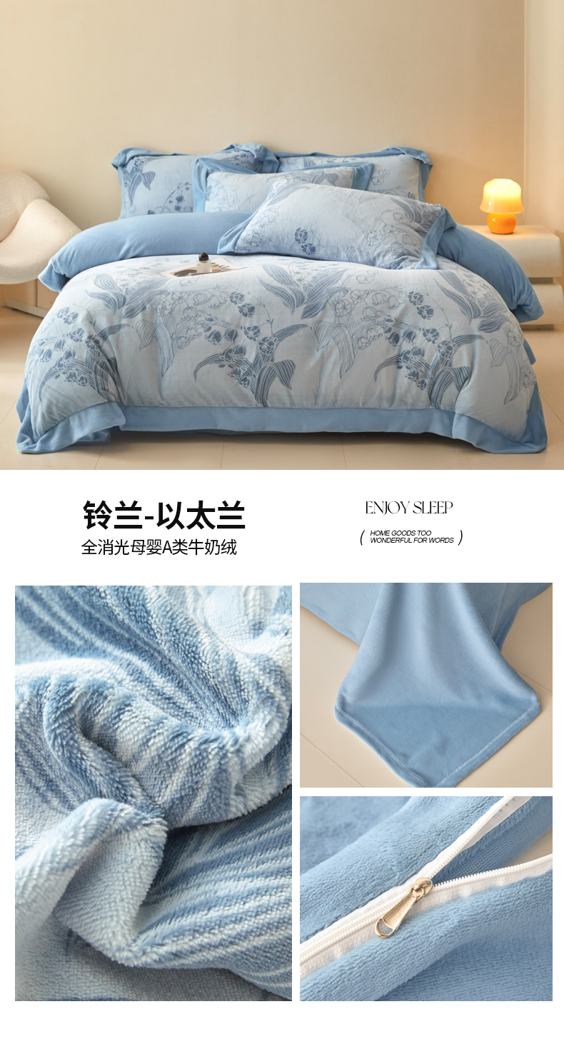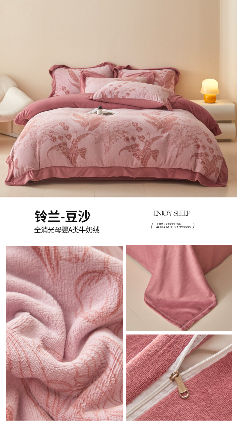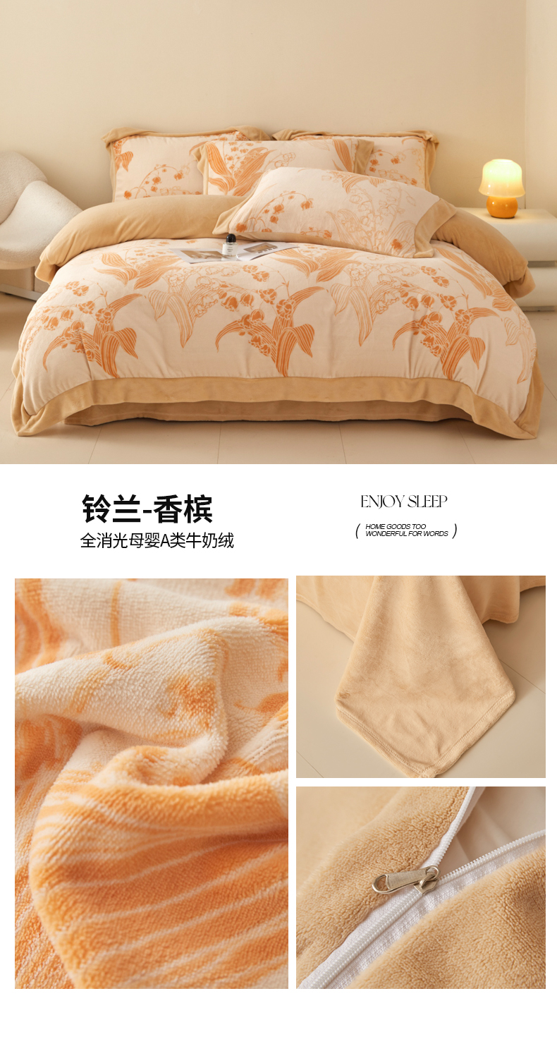 商品名称:(总)2025新款高克重9.2斤240克A类全消光印花拼角牛奶绒四件套-铃兰
