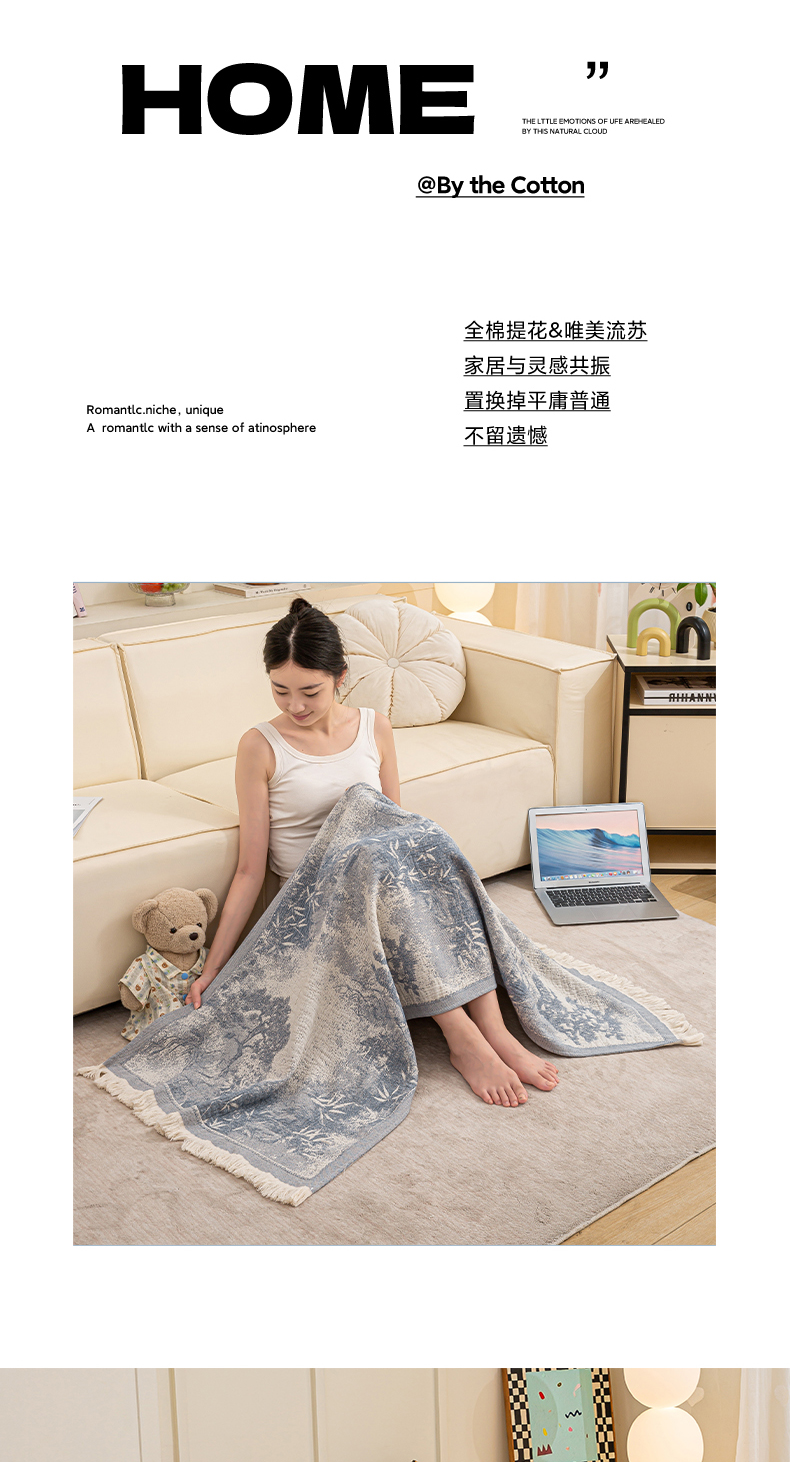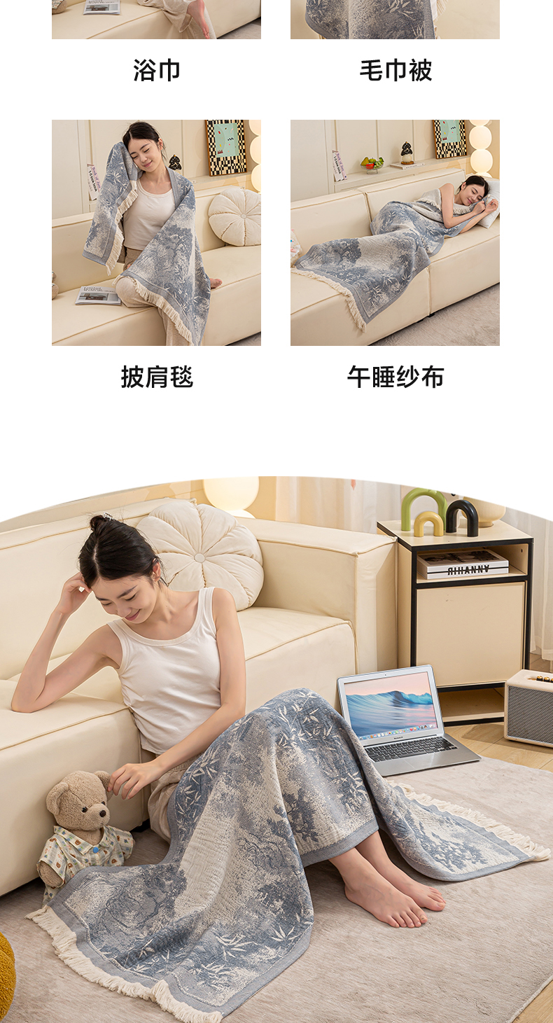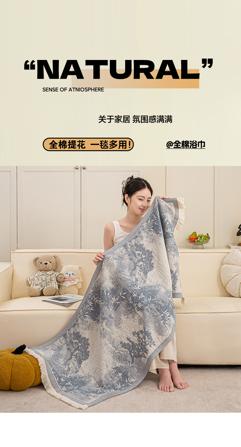 商品名称:恋人优选 2025新款A类流苏全棉纯棉提花四层水洗浴巾 苍松翠竹-蓝 66x150cm