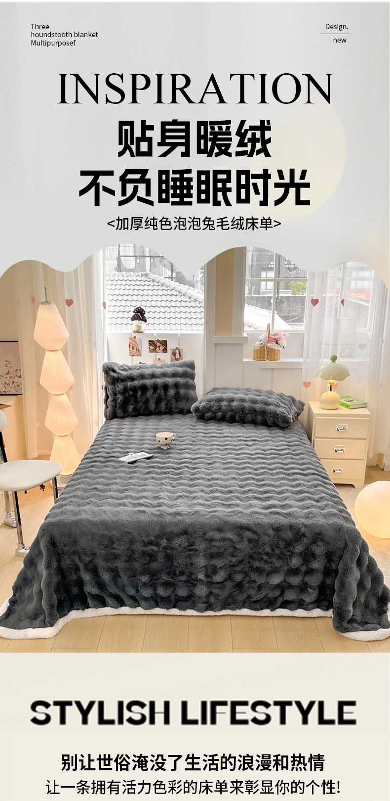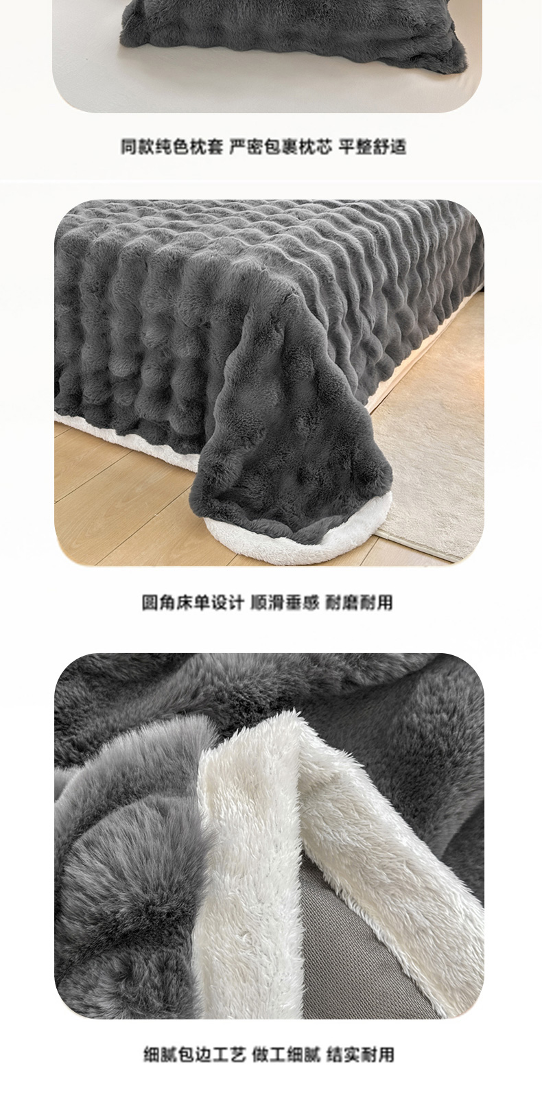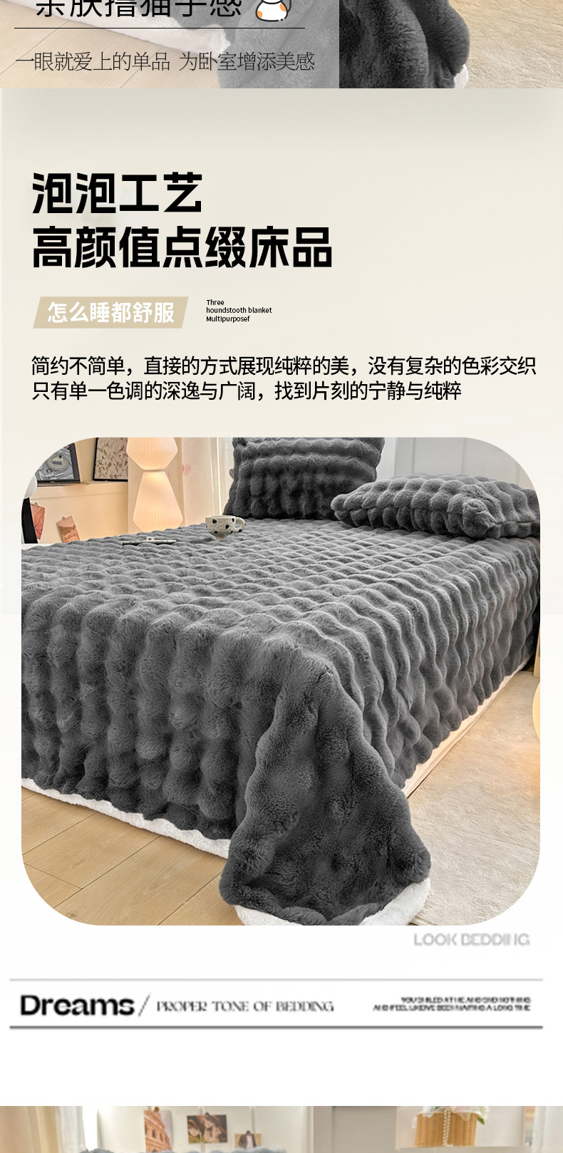 麒东家纺 2025新款泡泡绒兔毛绒床单 深灰