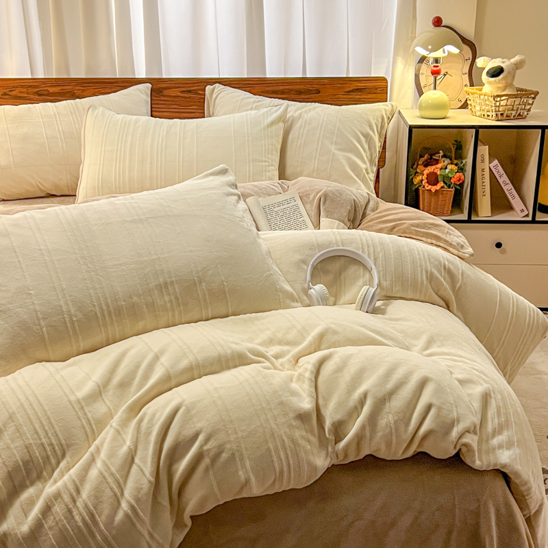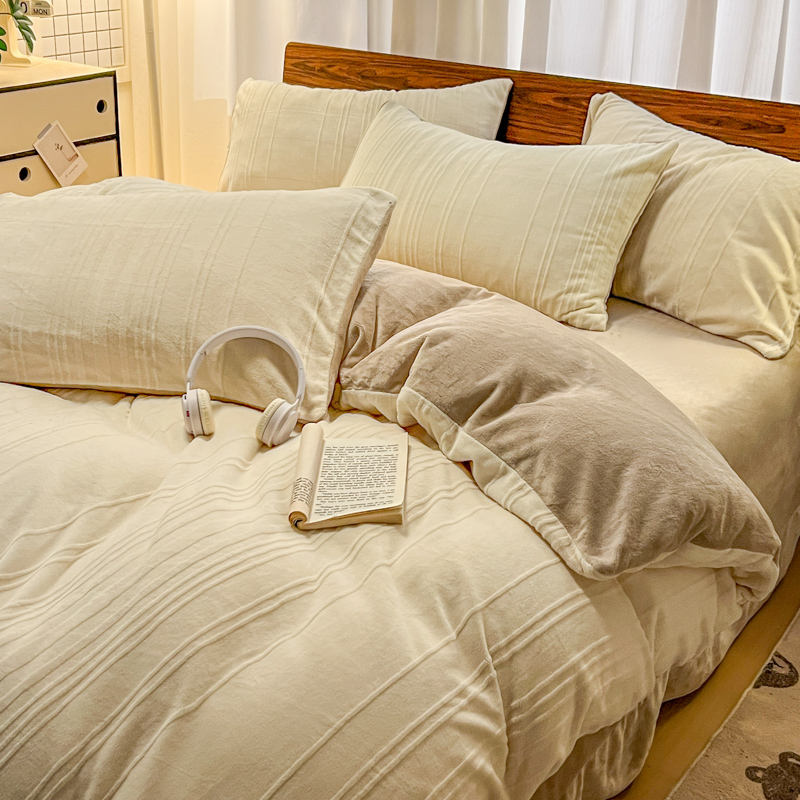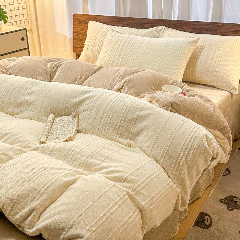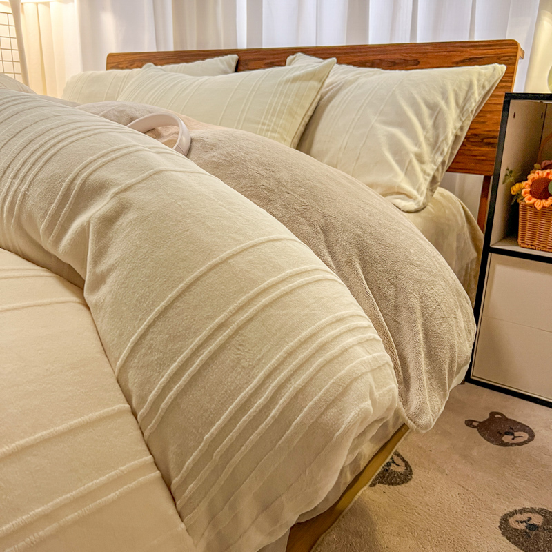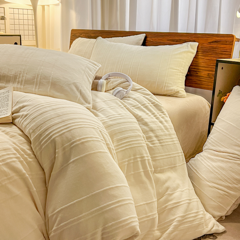 商品名称:沐晴家纺 2024秋冬新款雕花牛奶绒纯色简约轻奢四件套 简约条纹-奶白