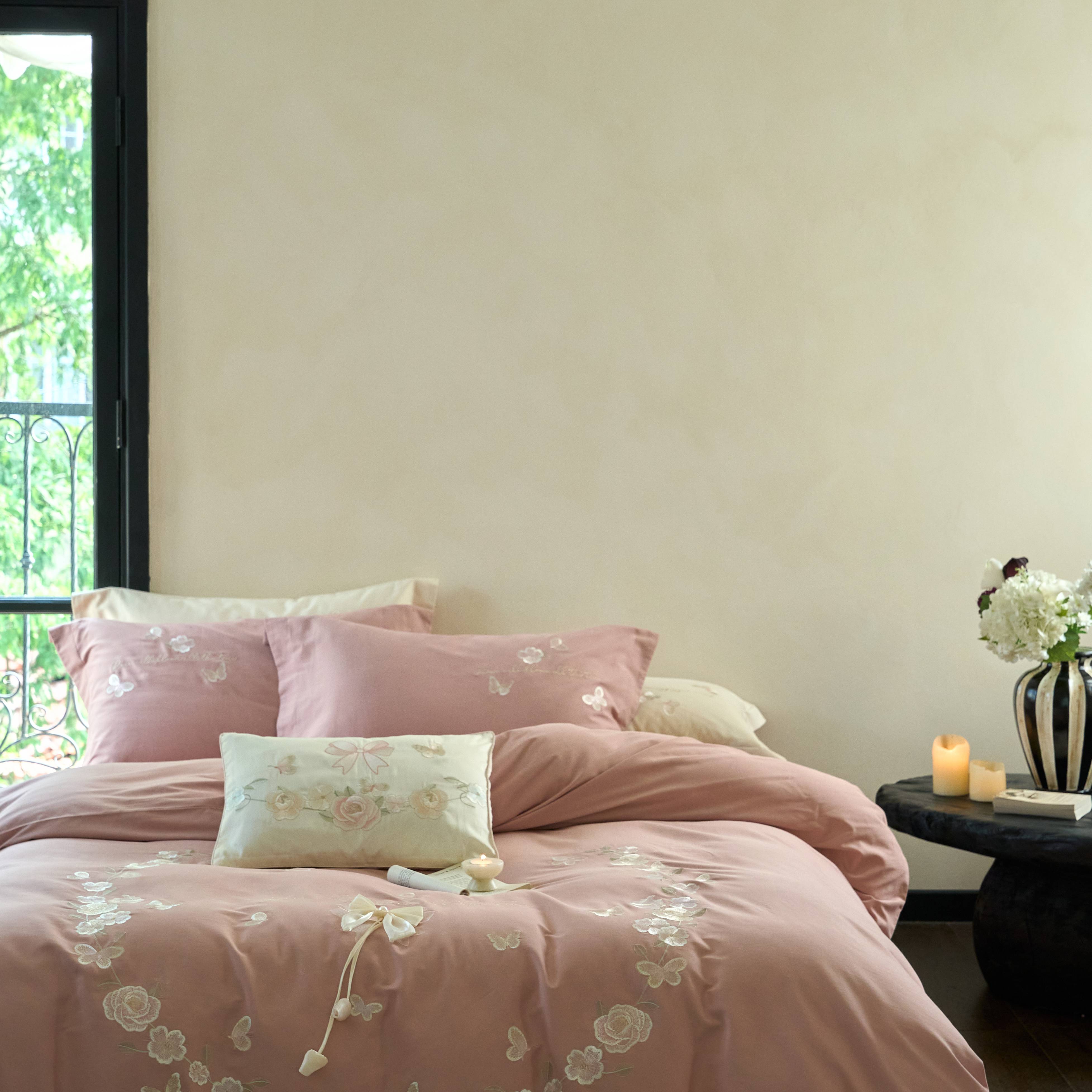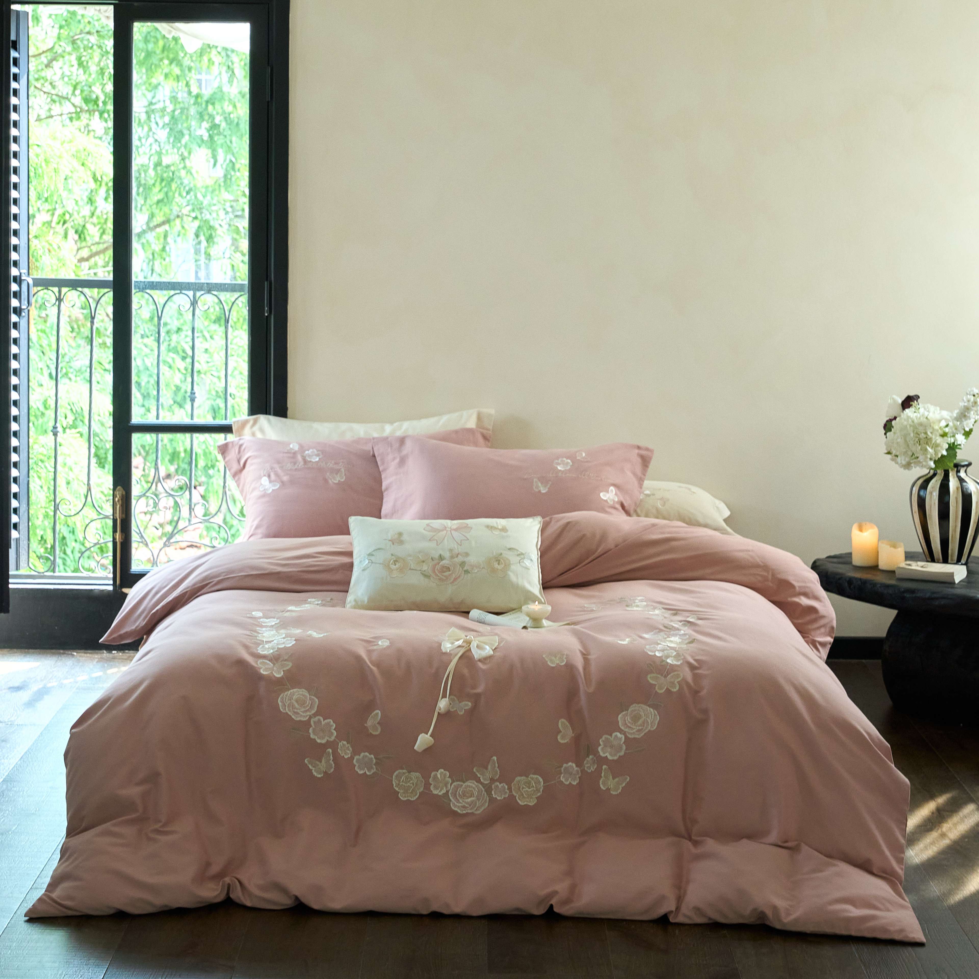 佳汐蓝家纺 2025秋冬新款刺绣长绒棉全棉纯棉磨毛四件套花序 花序-奶芙粉