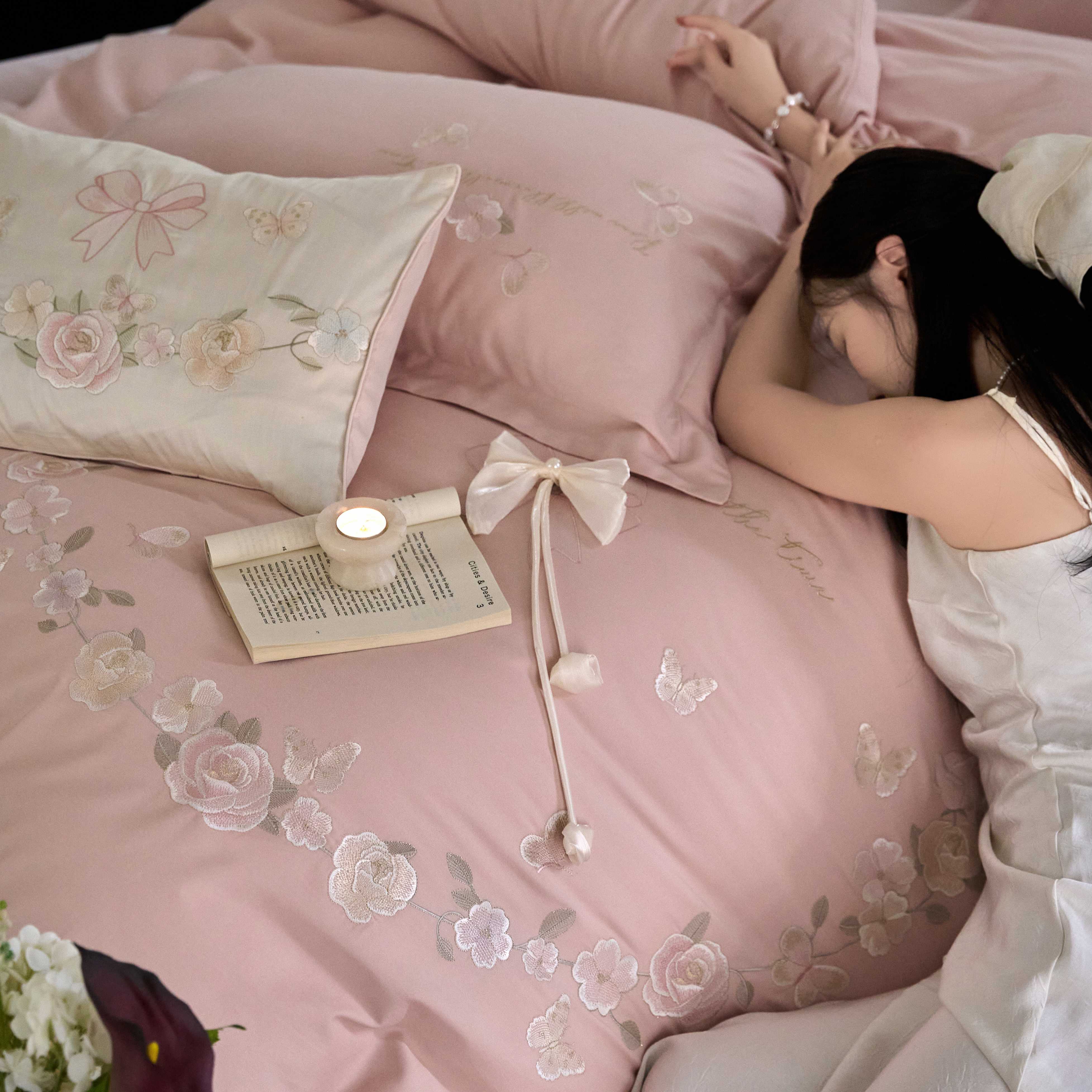 (总)佳汐蓝家纺 2025春夏新款天丝棉蝶舞繁花绣花天丝四件套,蝶舞繁花·粉,蝶舞繁花·蓝
