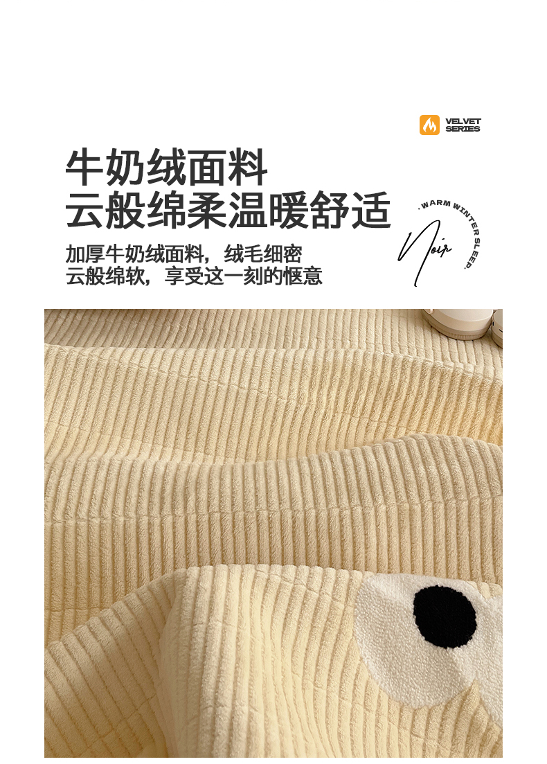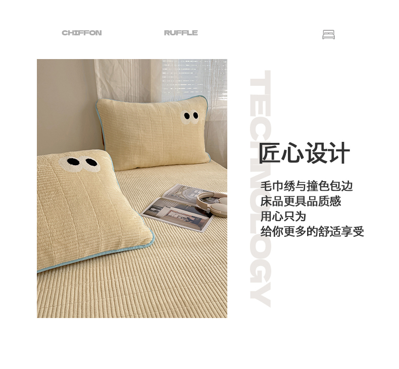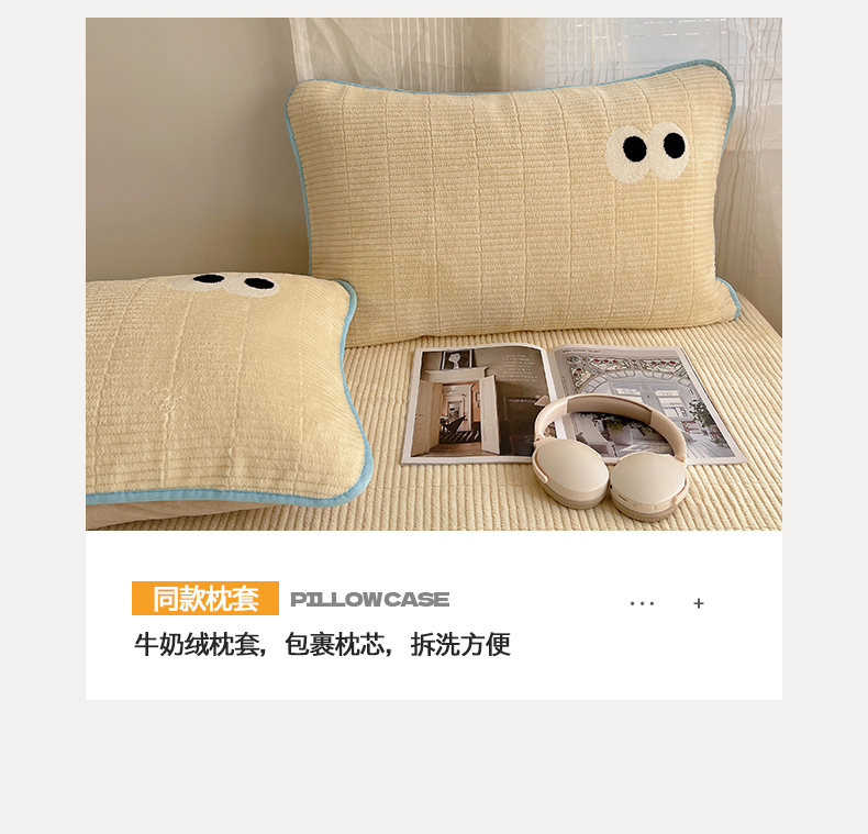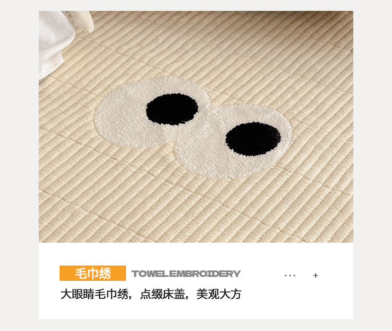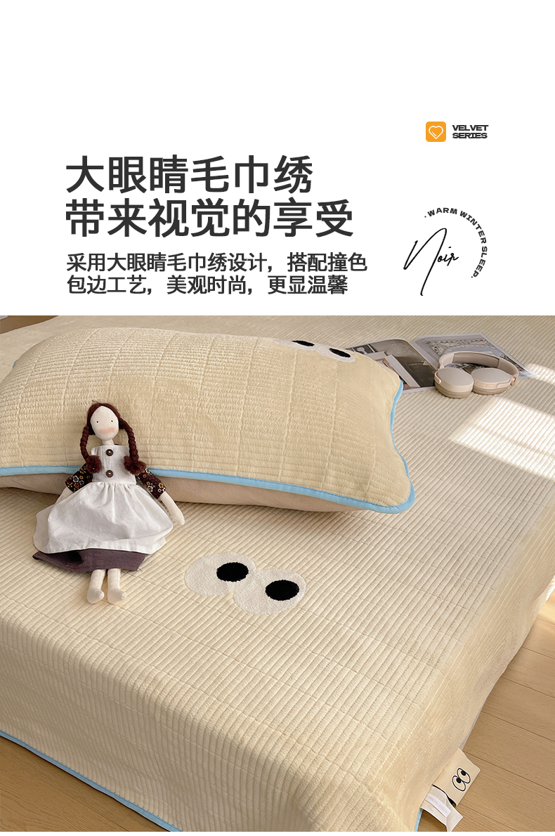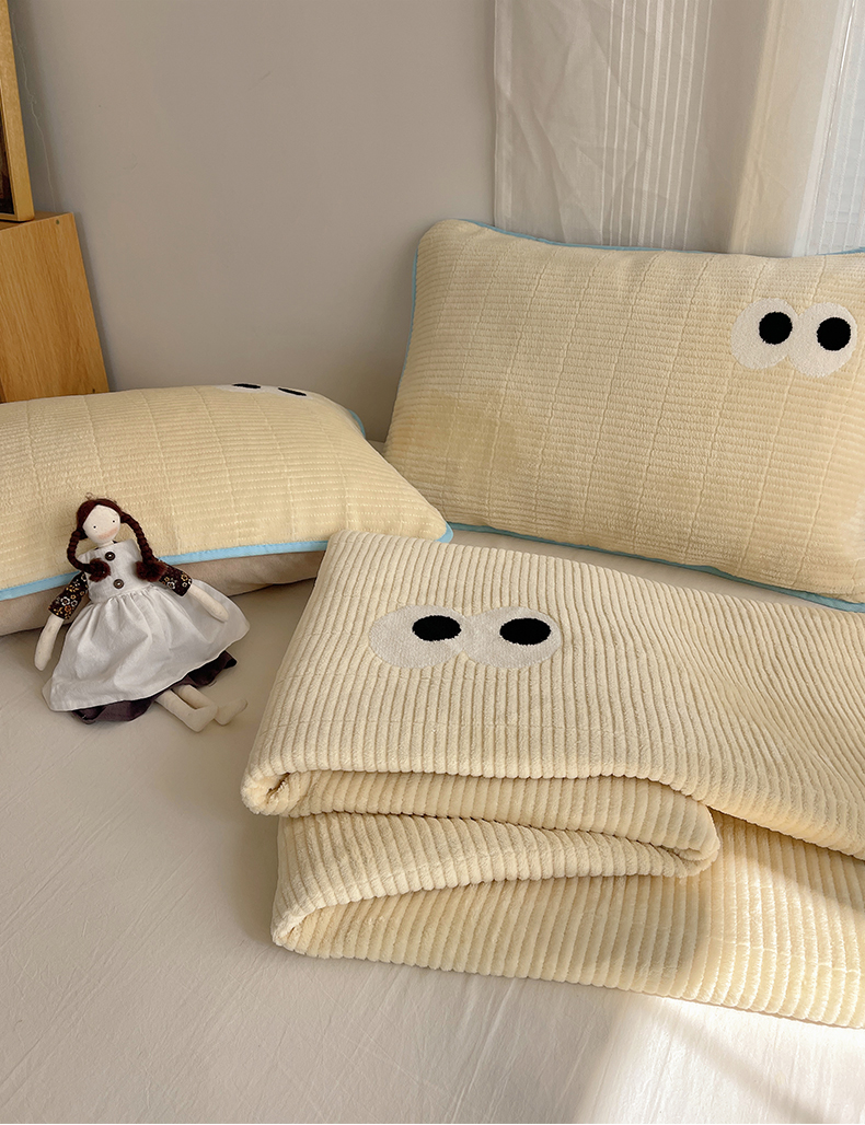 • 91家纺网 家纺一手货源 找家纺 桃子家居 2025新款韩系撞色毛巾绣大眼睛加厚牛奶绒多功能床盖三件套单品 绒床盖-毛巾绣大眼黄