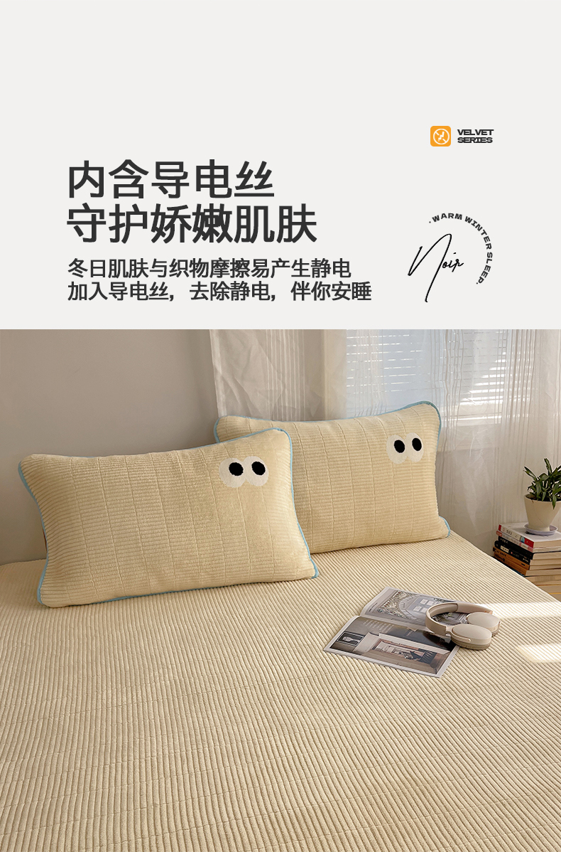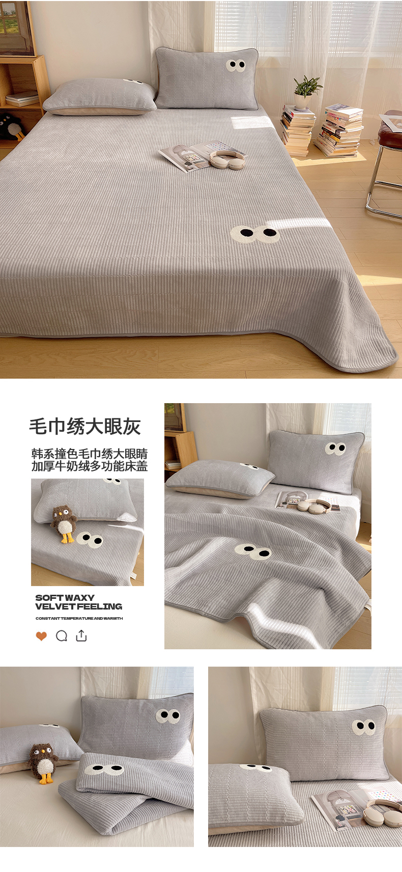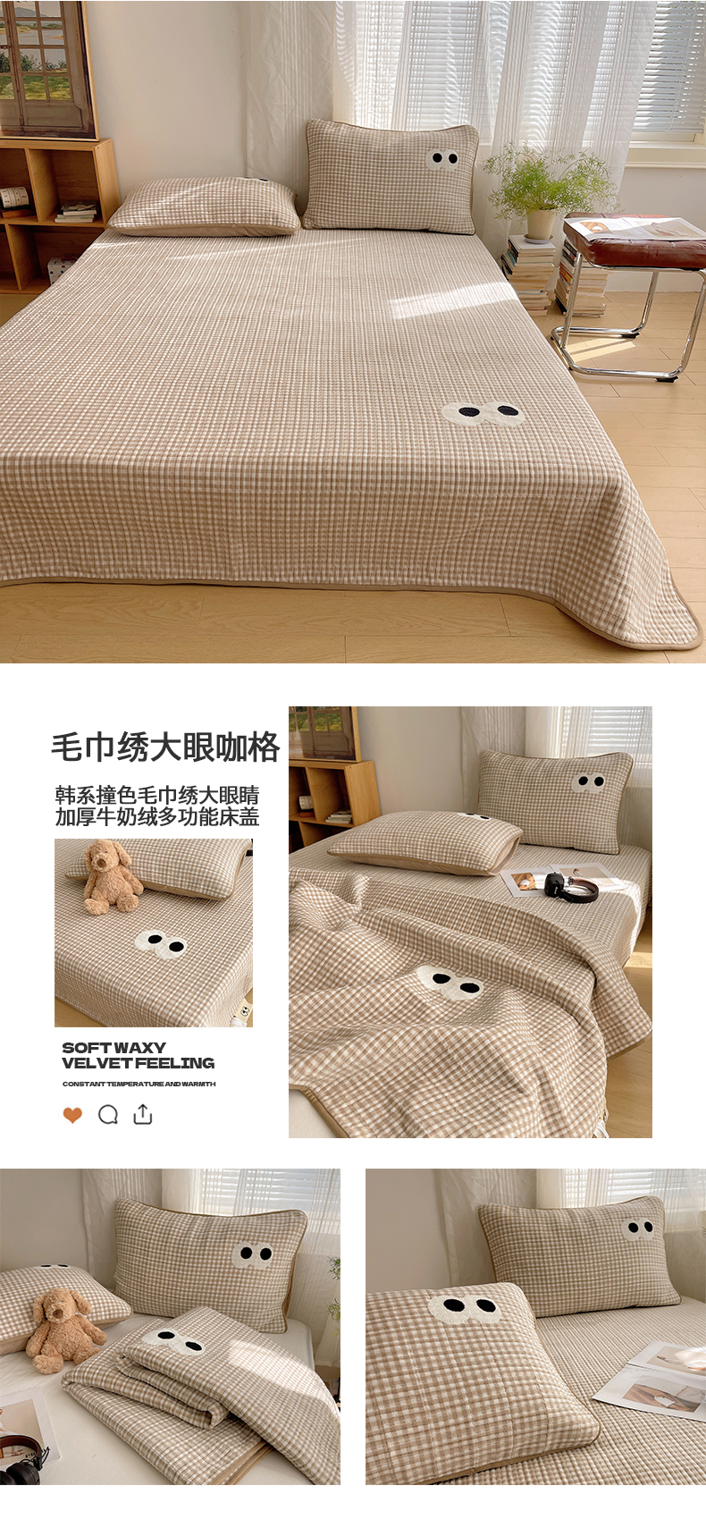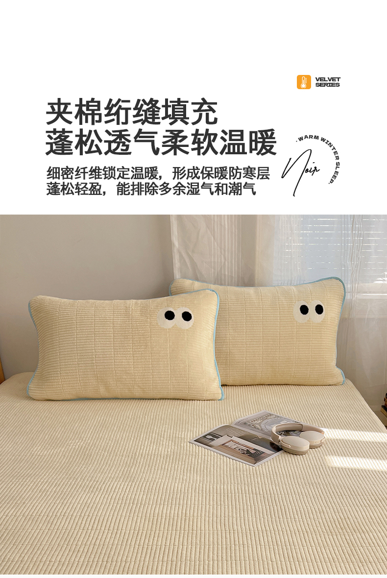 • 91家纺网 家纺一手货源 找家纺 桃子家居 2025新款韩系撞色毛巾绣大眼睛加厚牛奶绒多功能床盖三件套单品 绒床盖-毛巾绣大眼黄