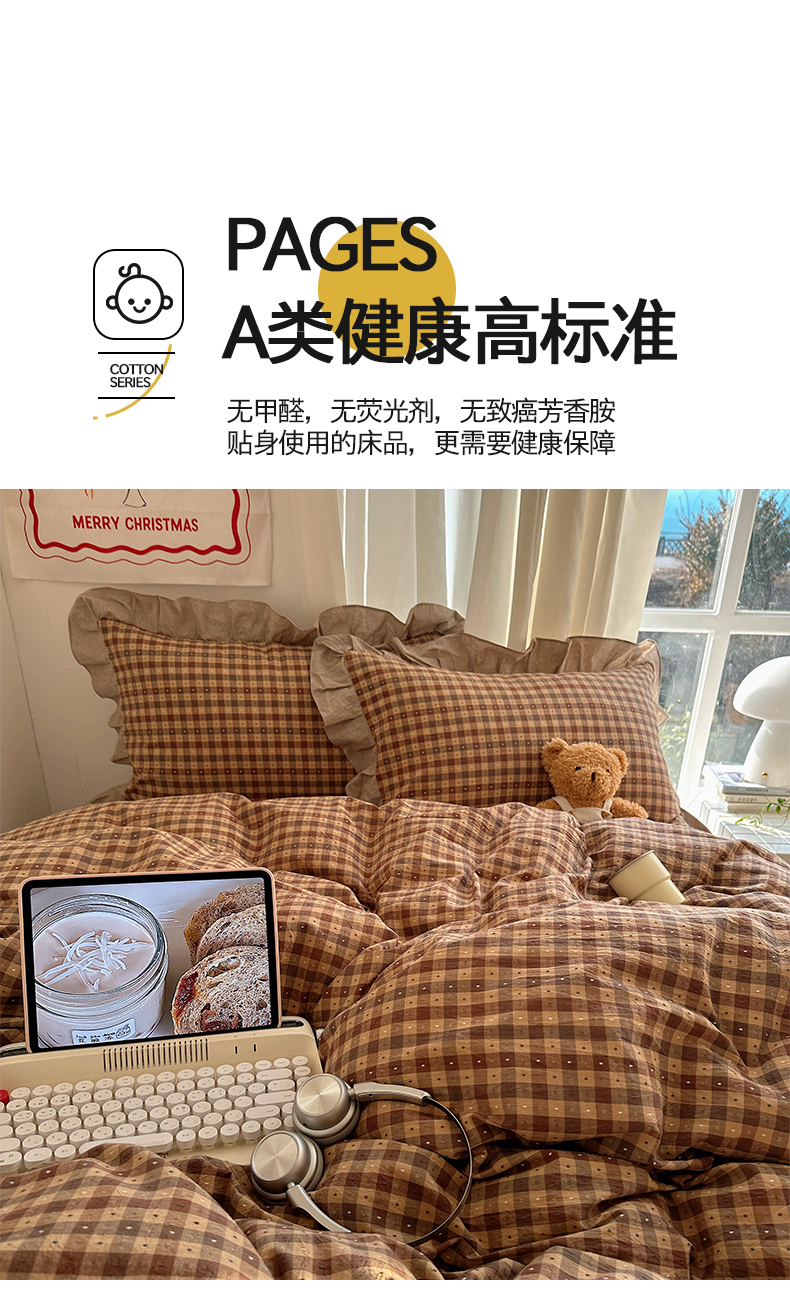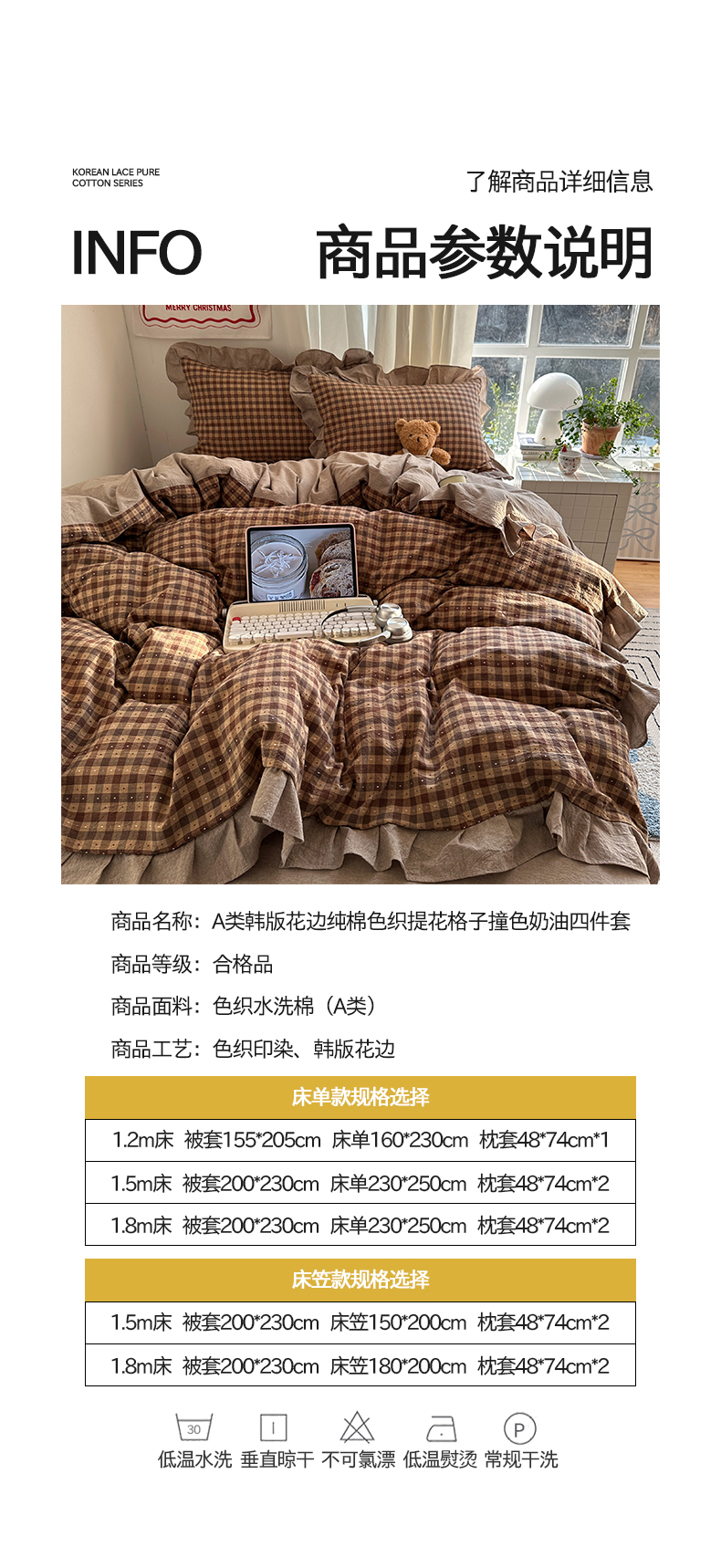 商品名称:桃子家居 2026新款A类韩版花边纯棉色织提花格子撞色奶油四件套 棉花边提花-米咖格