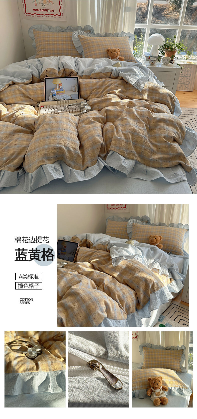 (总)桃子家居 2026新款A类韩版花边纯棉色织提花格子撞色奶油四件套,棉花边提花-蓝黄格,棉花边提花-幻境蓝格,棉花边提花-米咖格,棉花边提花-璎珞粉格