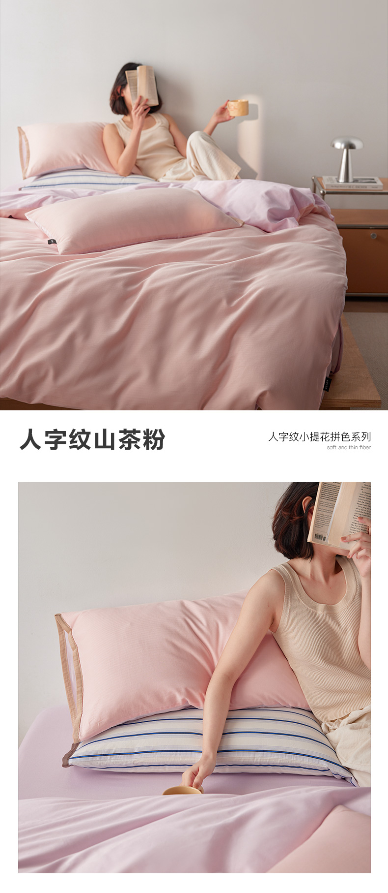 商品名称:佳汐蓝家纺 2026新款春夏人字纹小提花拼色系列四件套 人字纹山茶粉