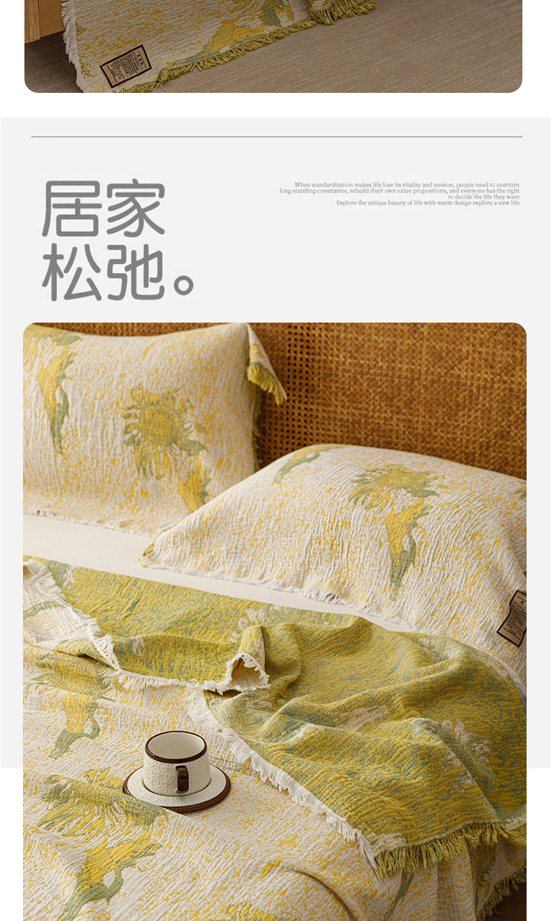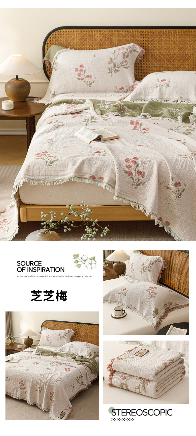 朴尔家纺-毛巾被 2026新款全棉60s精细纱流苏花边四层纱布毛巾被 兰草情