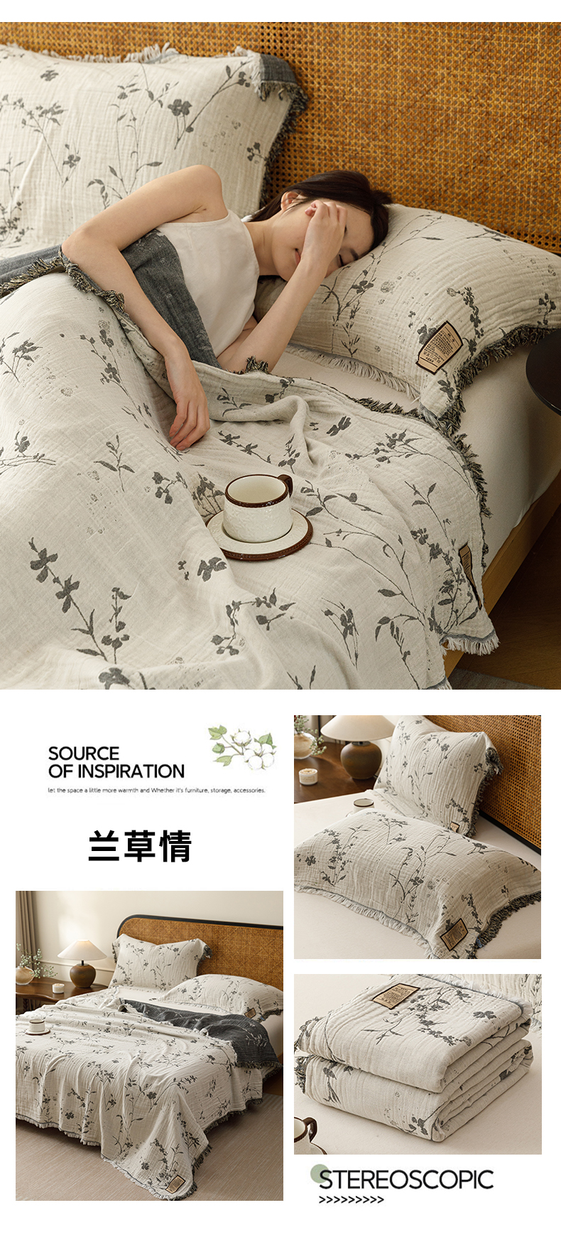 • 91家纺网 家纺一手货源 找家纺 朴尔家纺-毛巾被 2026新款全棉60s精细纱流苏花边四层纱布毛巾被 兰草情