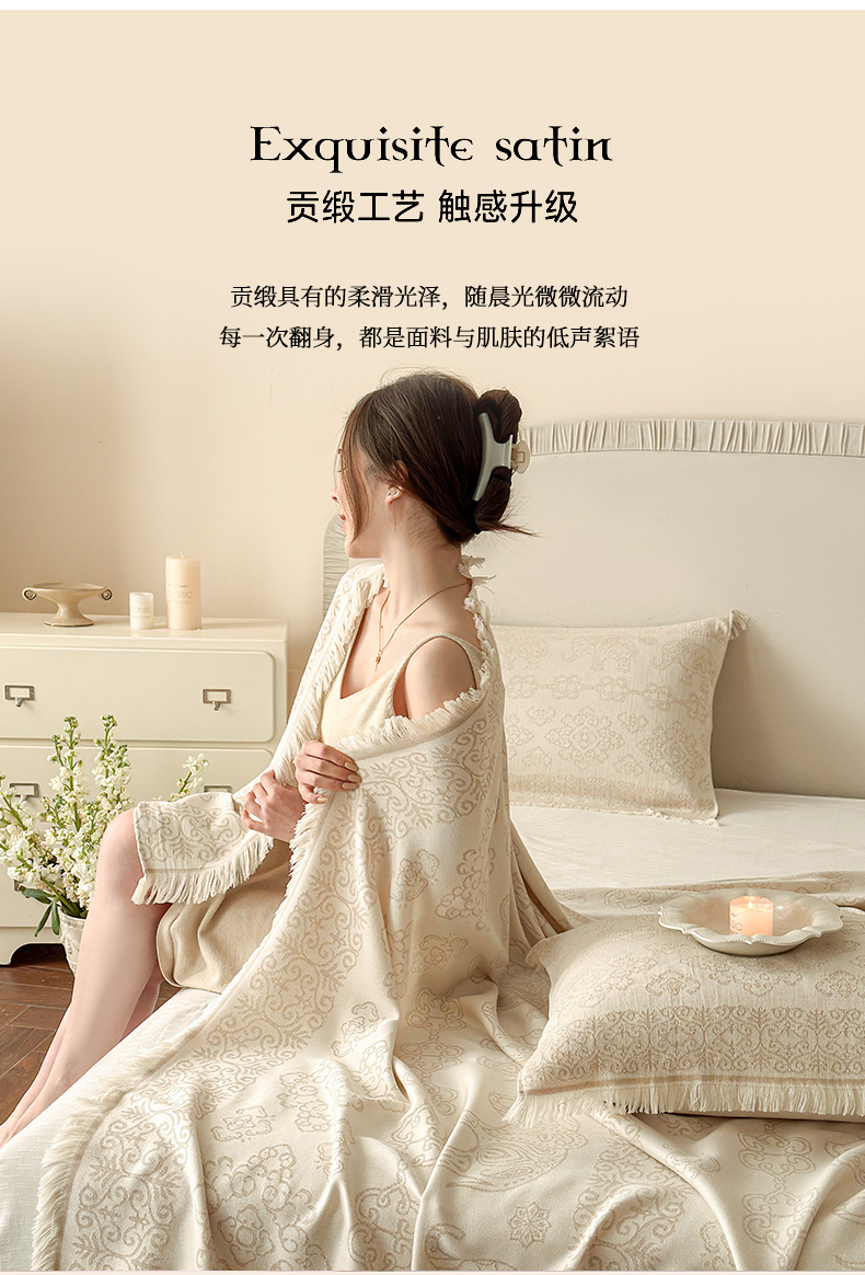 商品名称:朴尔家纺-毛巾被 2026新款长绒棉100s贡缎丝光棉纯棉流苏纱布毛巾被三件套 巴宝方格-驼