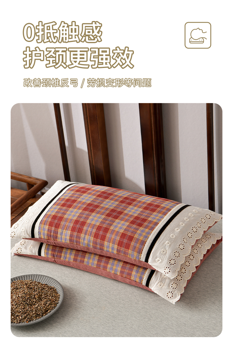 商品名称:小桃姐家纺 2025新款花边全棉纯棉双层纱荞麦枕枕芯枕头 红小格