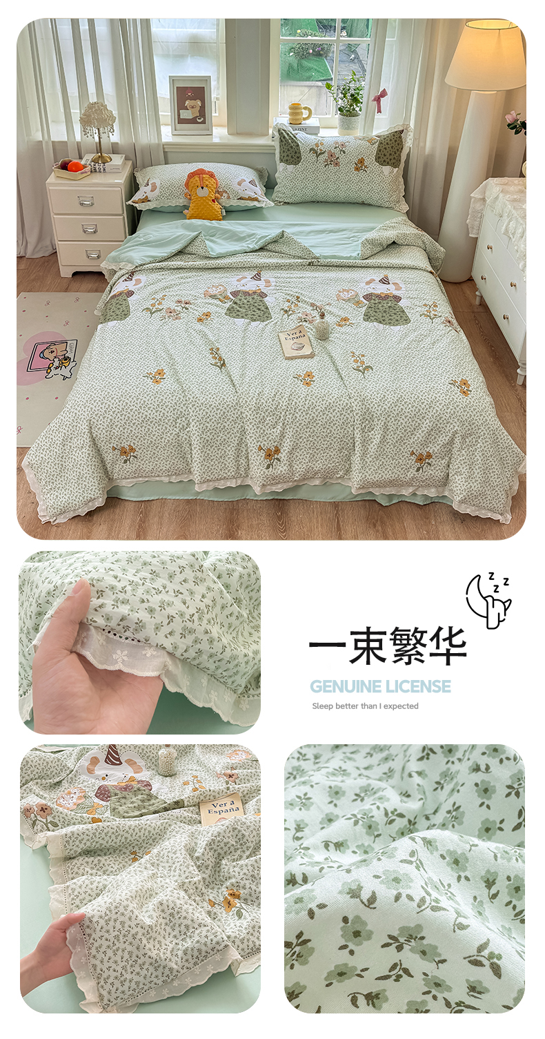 商品名称:(总)憨豆家纺 2026春夏新款古法仿棉夏被四件套镂空花边大板印花夏凉被空调被(含抗菌纤维)