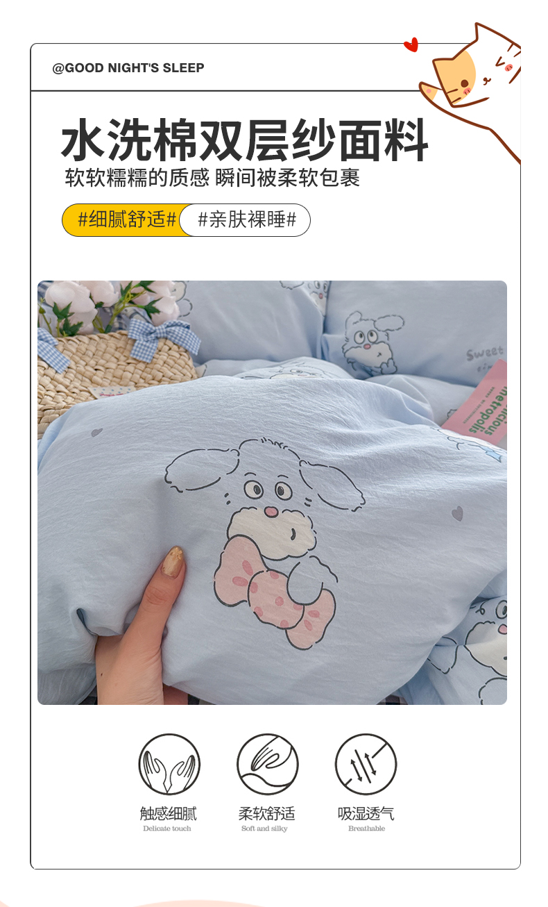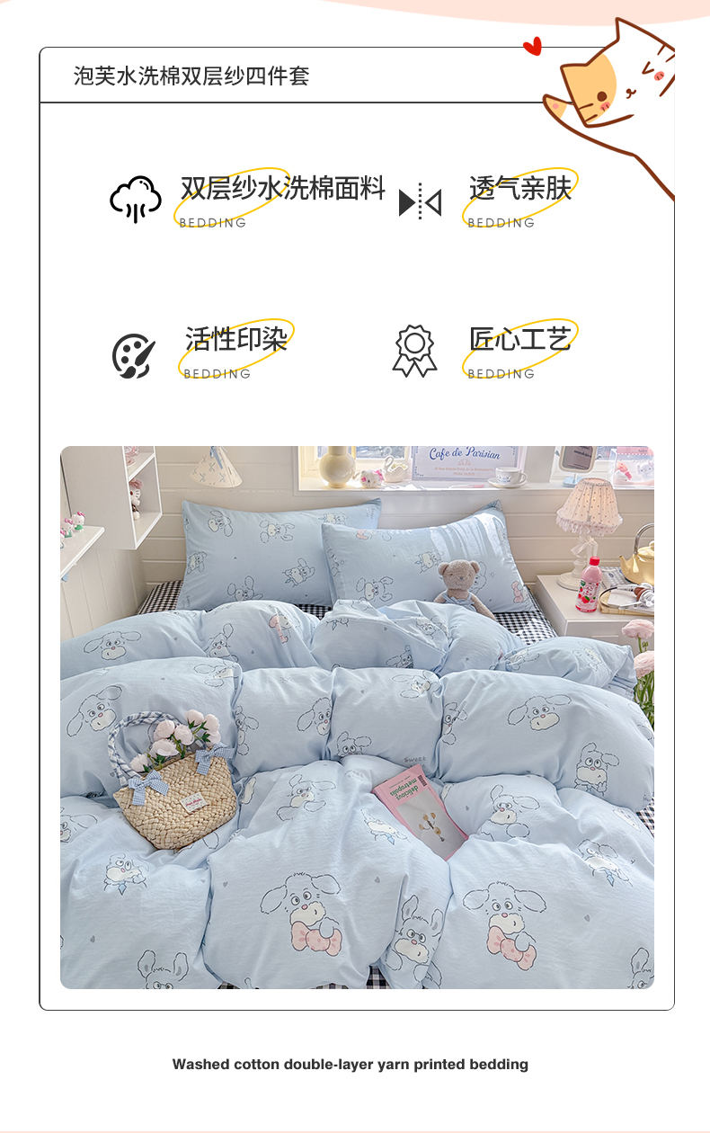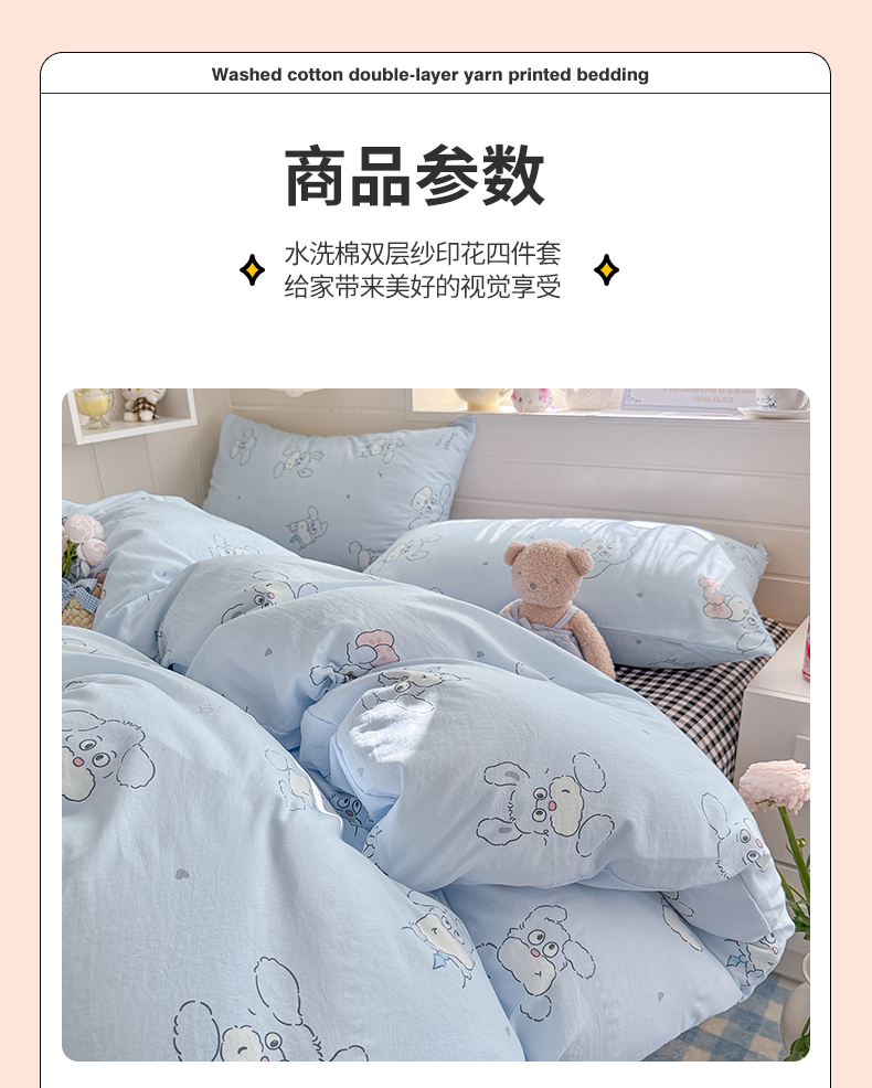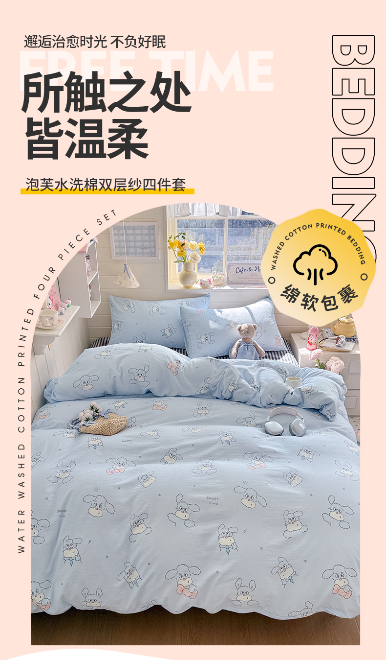 当前位置: 91家纺网 > 商品网购 > 床品套件 > 四件套 > 其它四件套 > 罗亿家纺 2026年新款泡芙水洗棉双层纱四件套 超级小狗