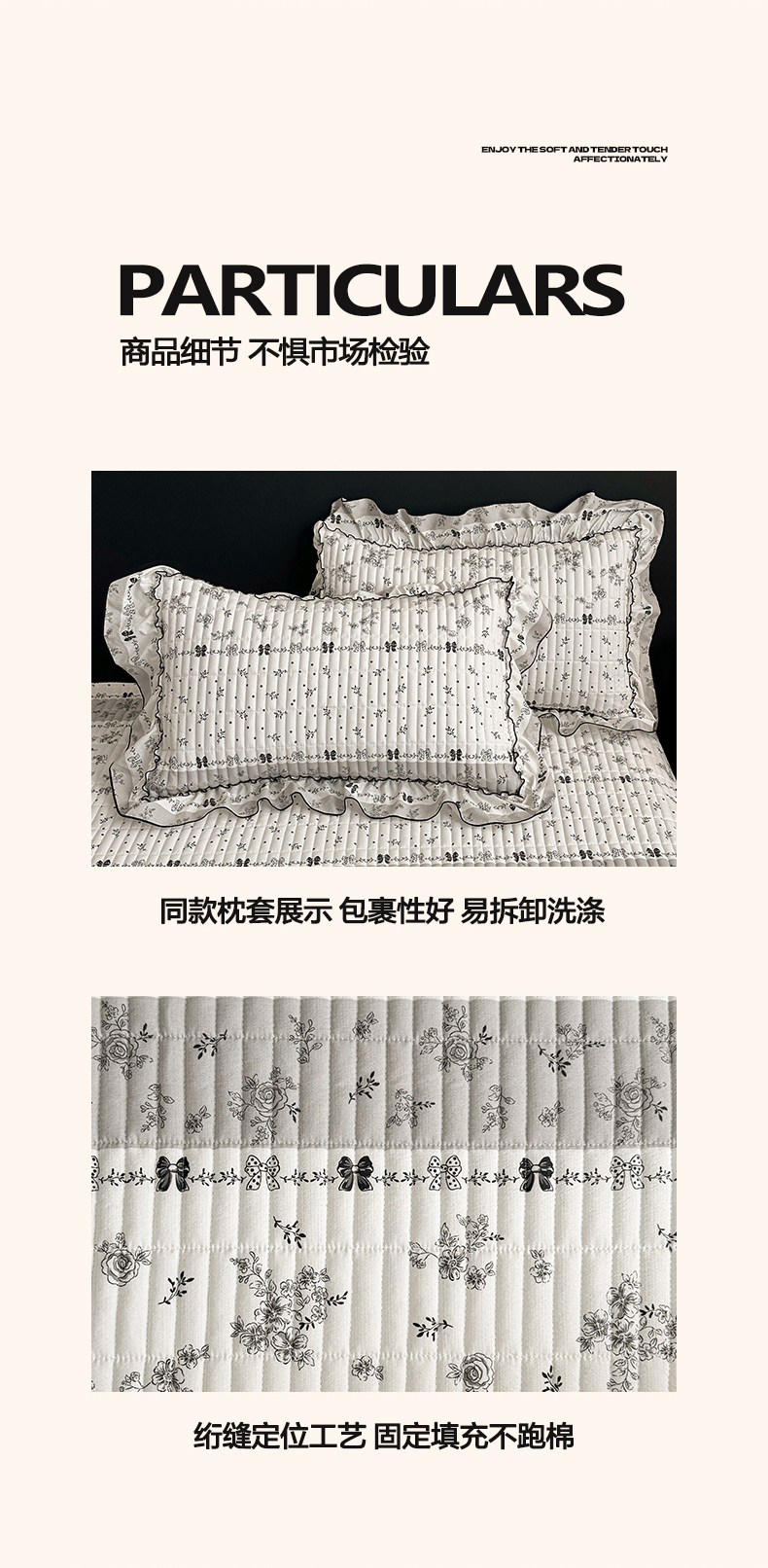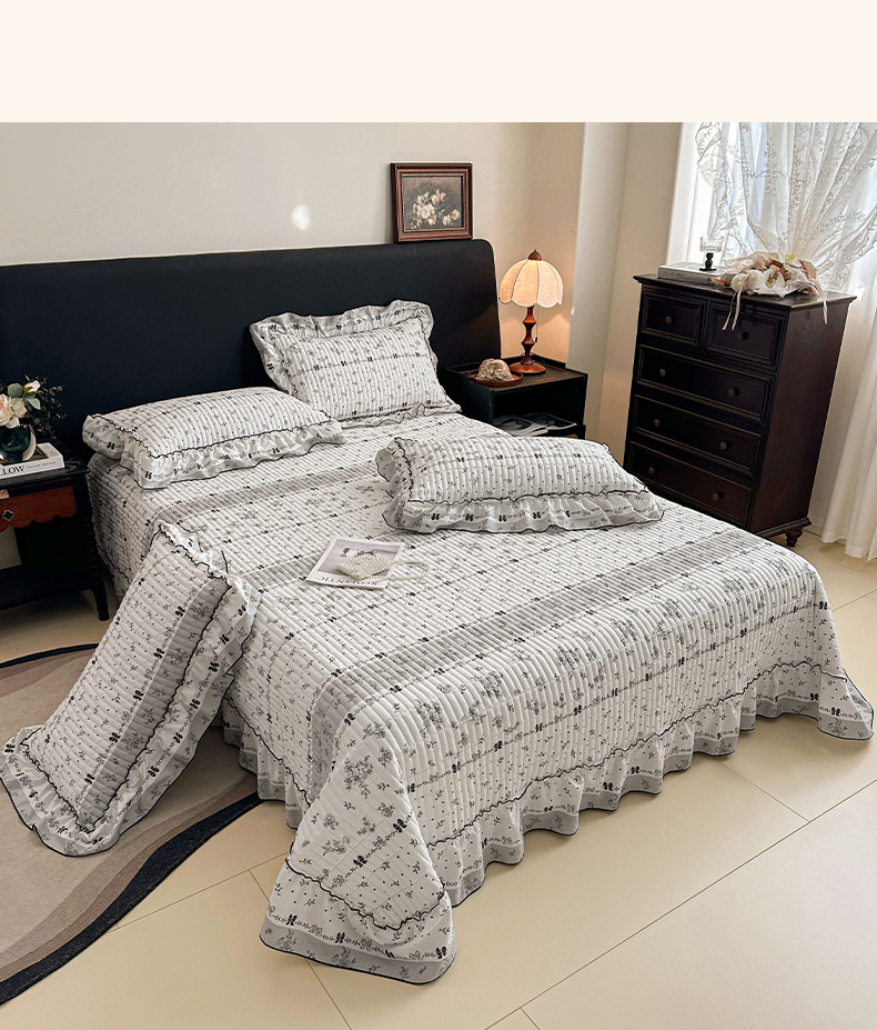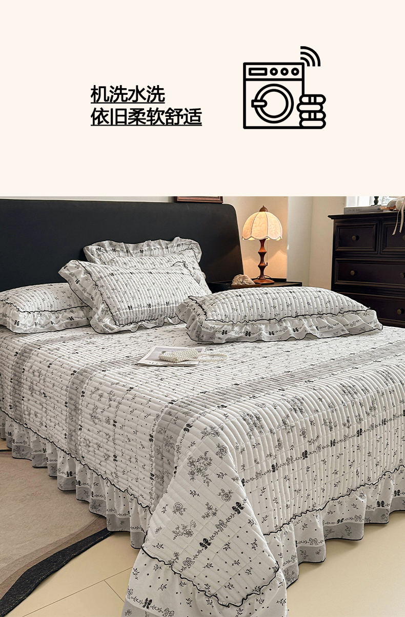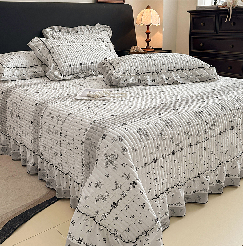 • 91家纺网 家纺一手货源 找家纺 眠势力 2026新款双层纱花边床盖单件加厚夹棉云感皱皱纱大花边床单三件套赫本风 水墨蔷薇