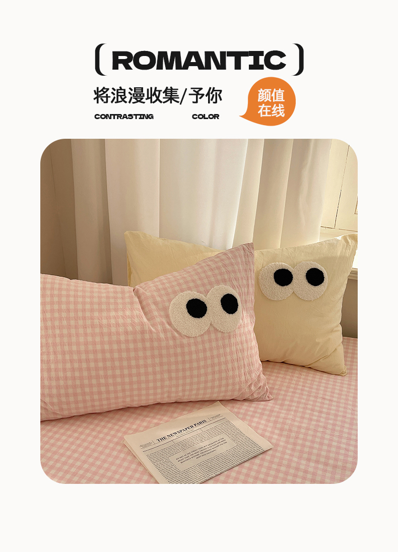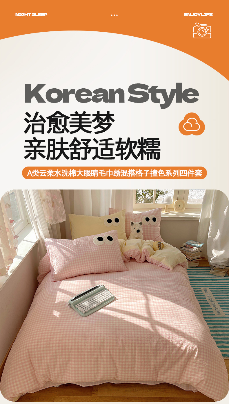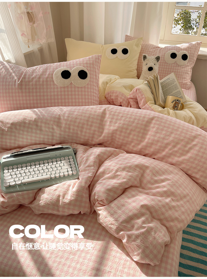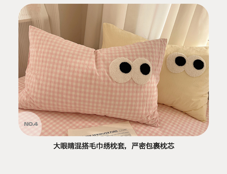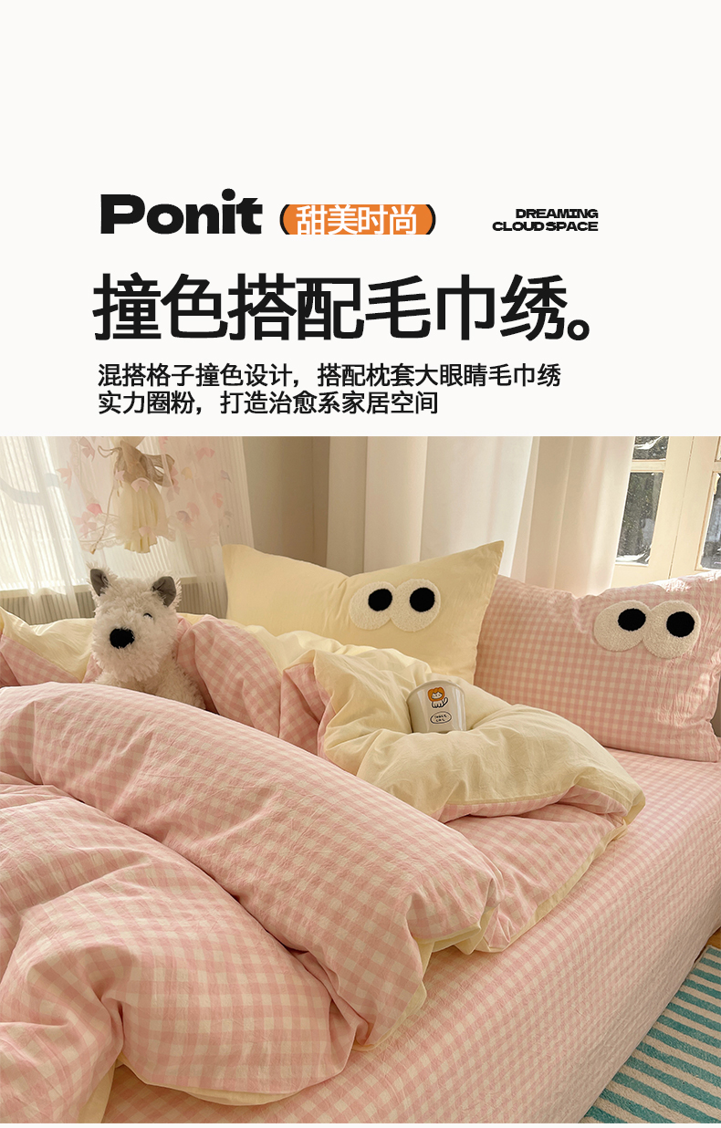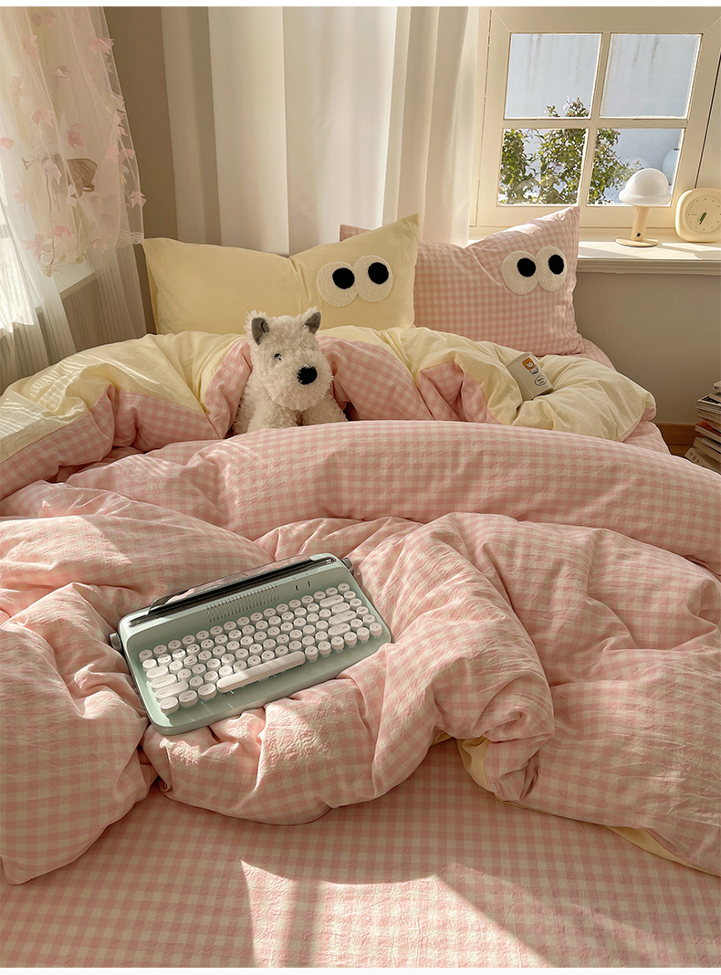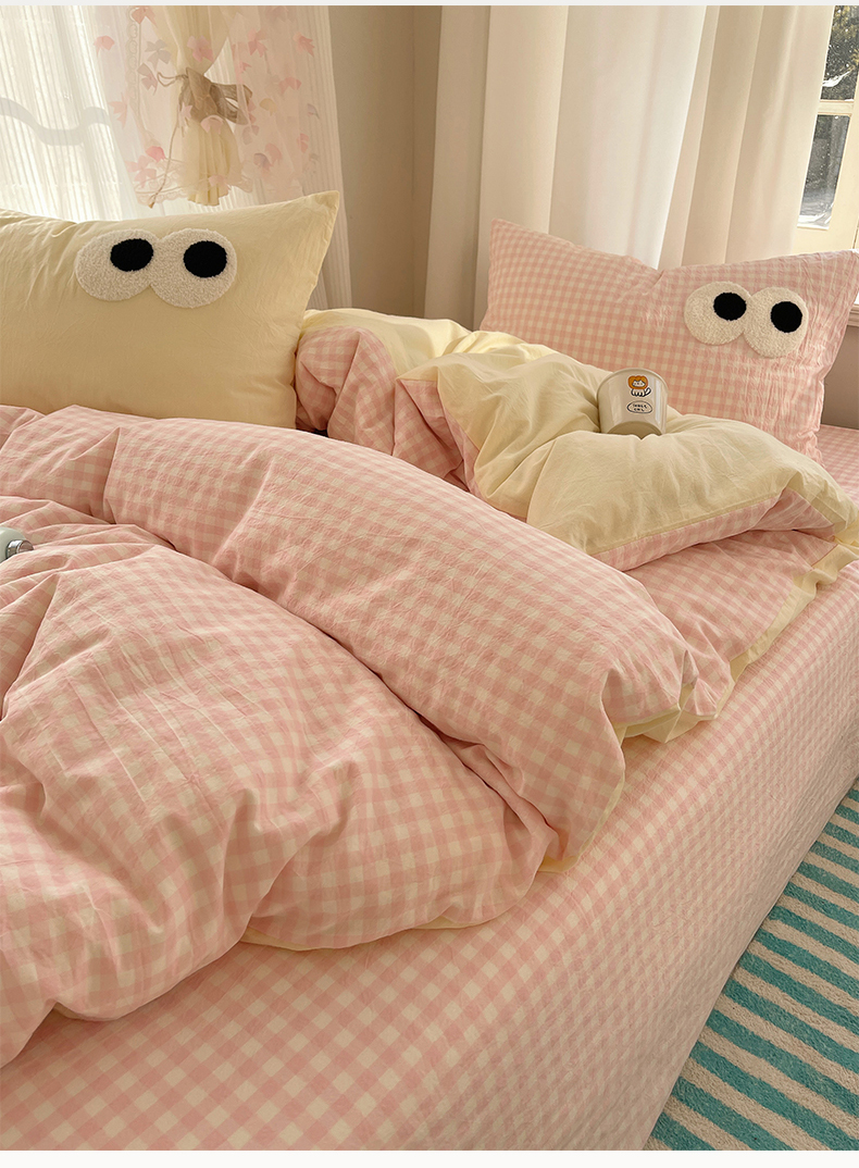 当前位置: 91家纺网 > 商品网购 > 床品套件 > 四件套 > 毛巾绣四件套 > 桃心家居 2026新款A类亲肤舒适软糯云柔水洗棉大眼睛毛巾绣混搭格子撞色系列四件套 云柔水洗棉-大眼粉小格奶黄
