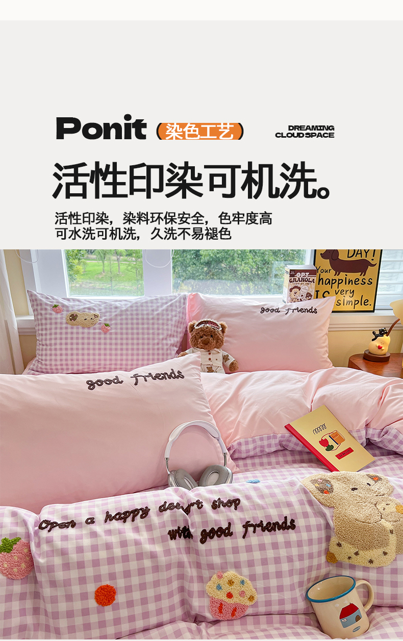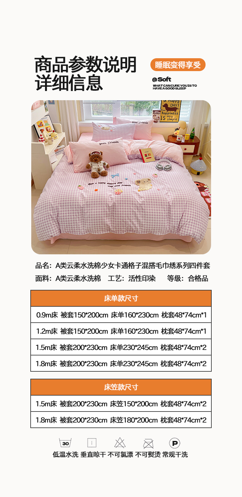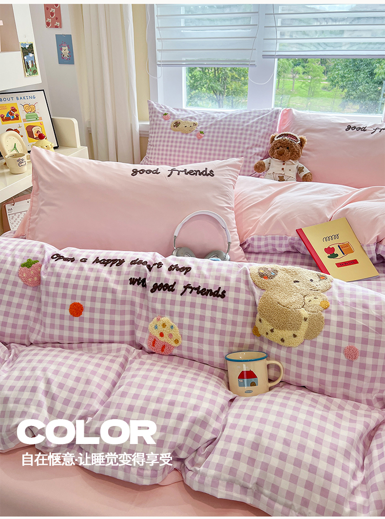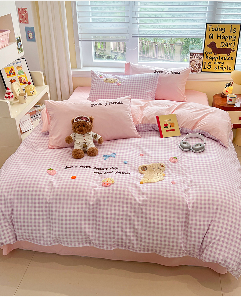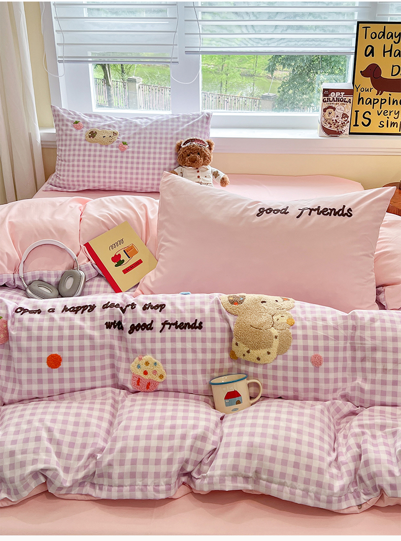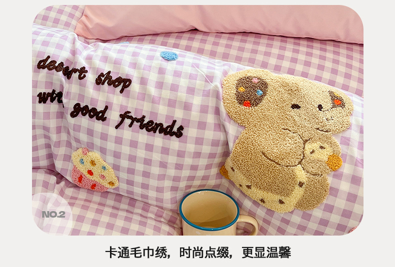商品名称:(总)桃心家居 2026新款A类亲肤舒适软糯云柔水洗棉少女卡通格子混搭毛巾绣水洗棉系列四件套
