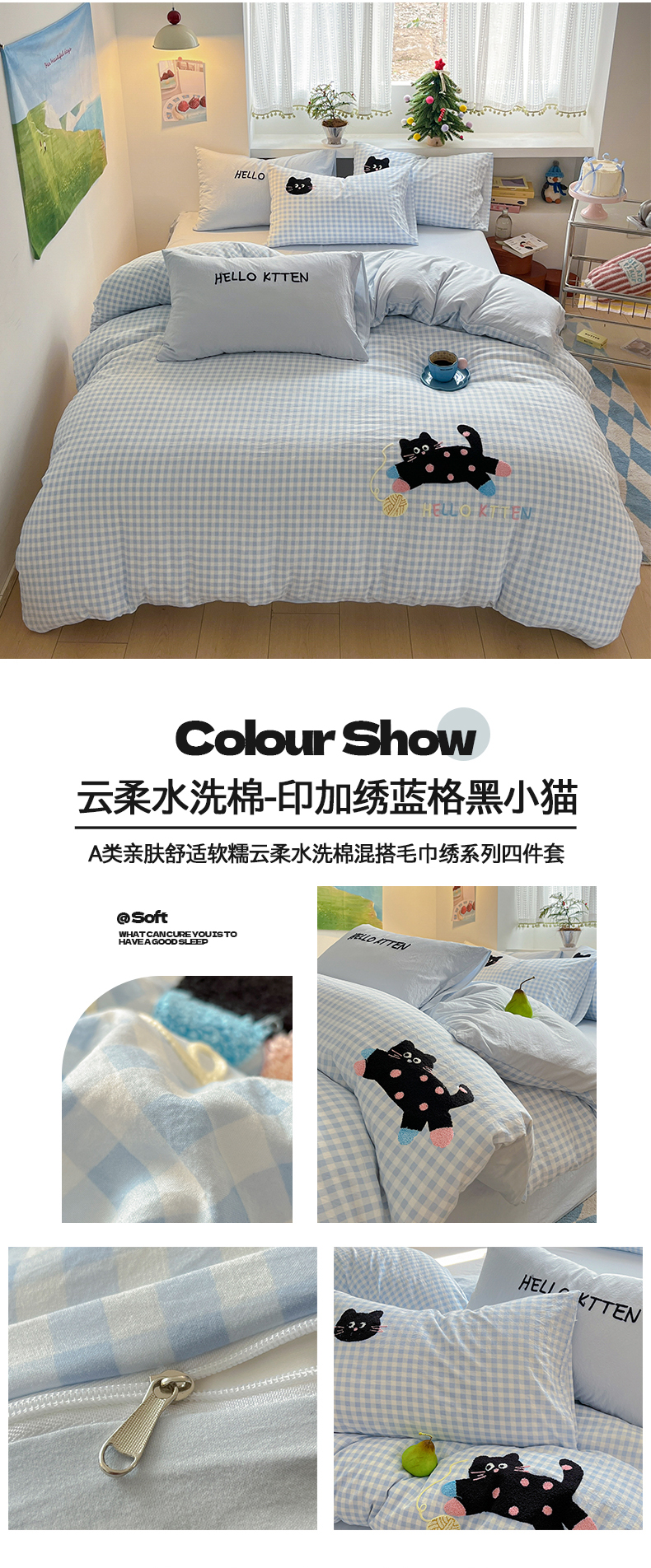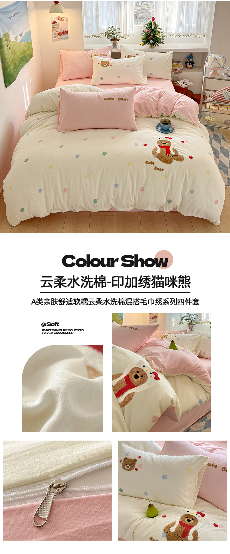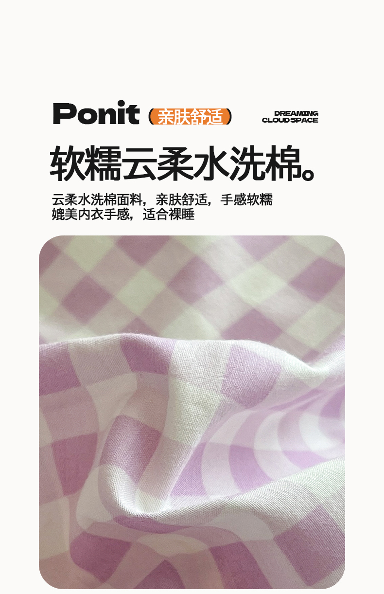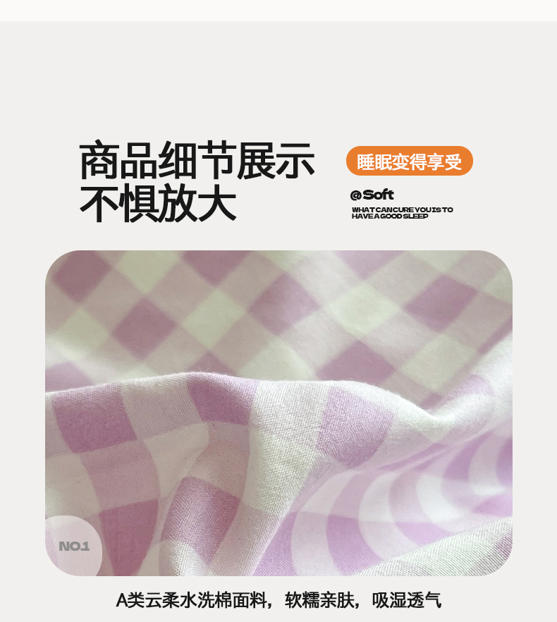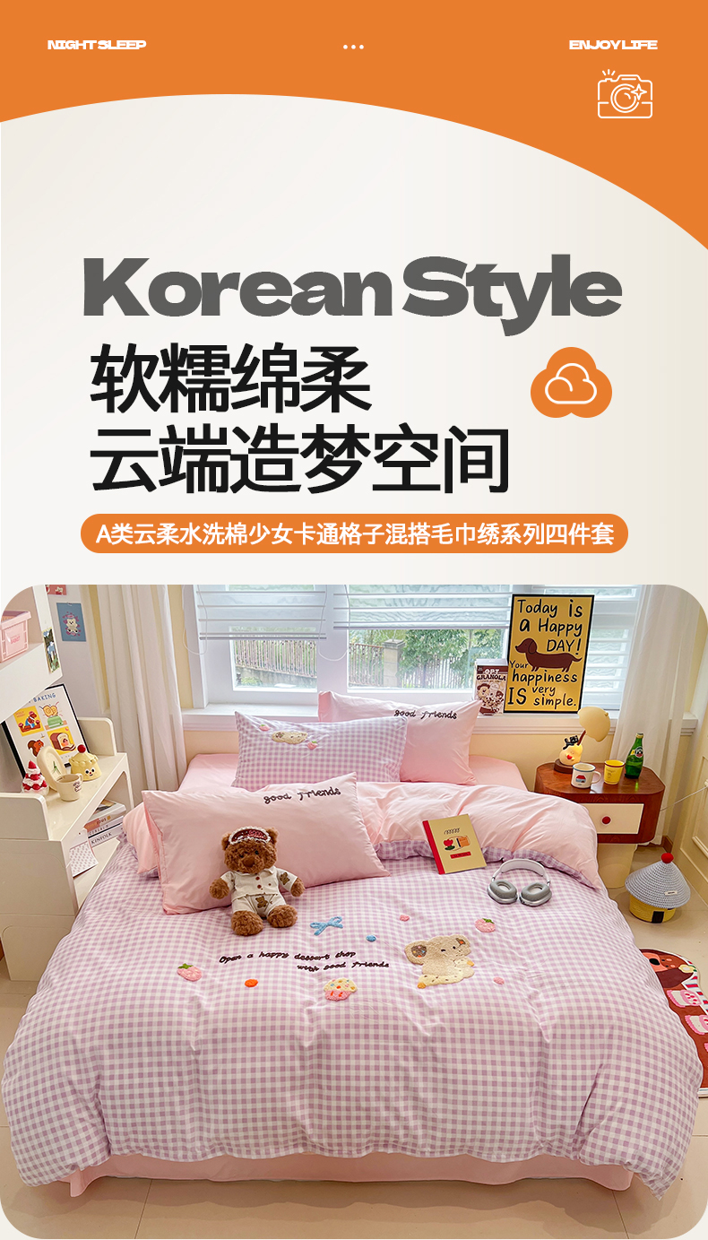 商品名称:(总)桃心家居 2026新款A类亲肤舒适软糯云柔水洗棉少女卡通格子混搭毛巾绣水洗棉系列四件套