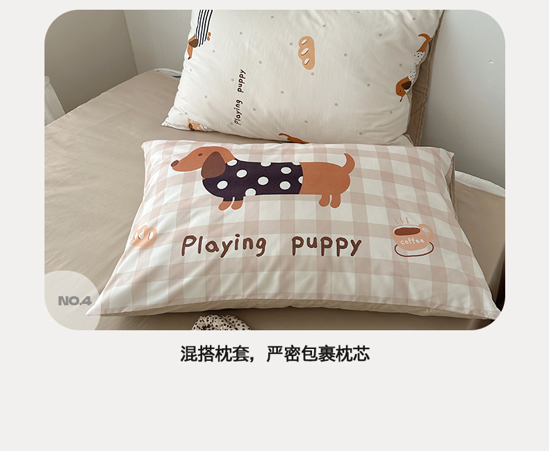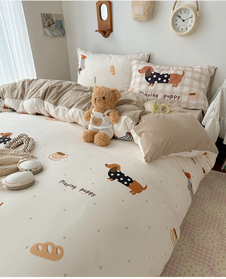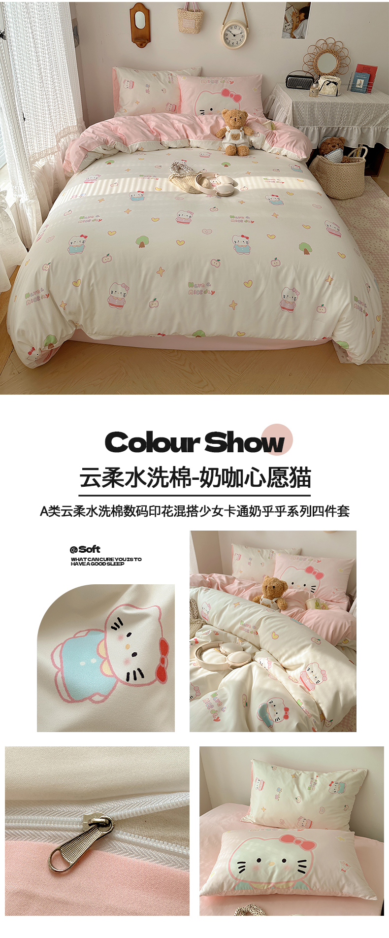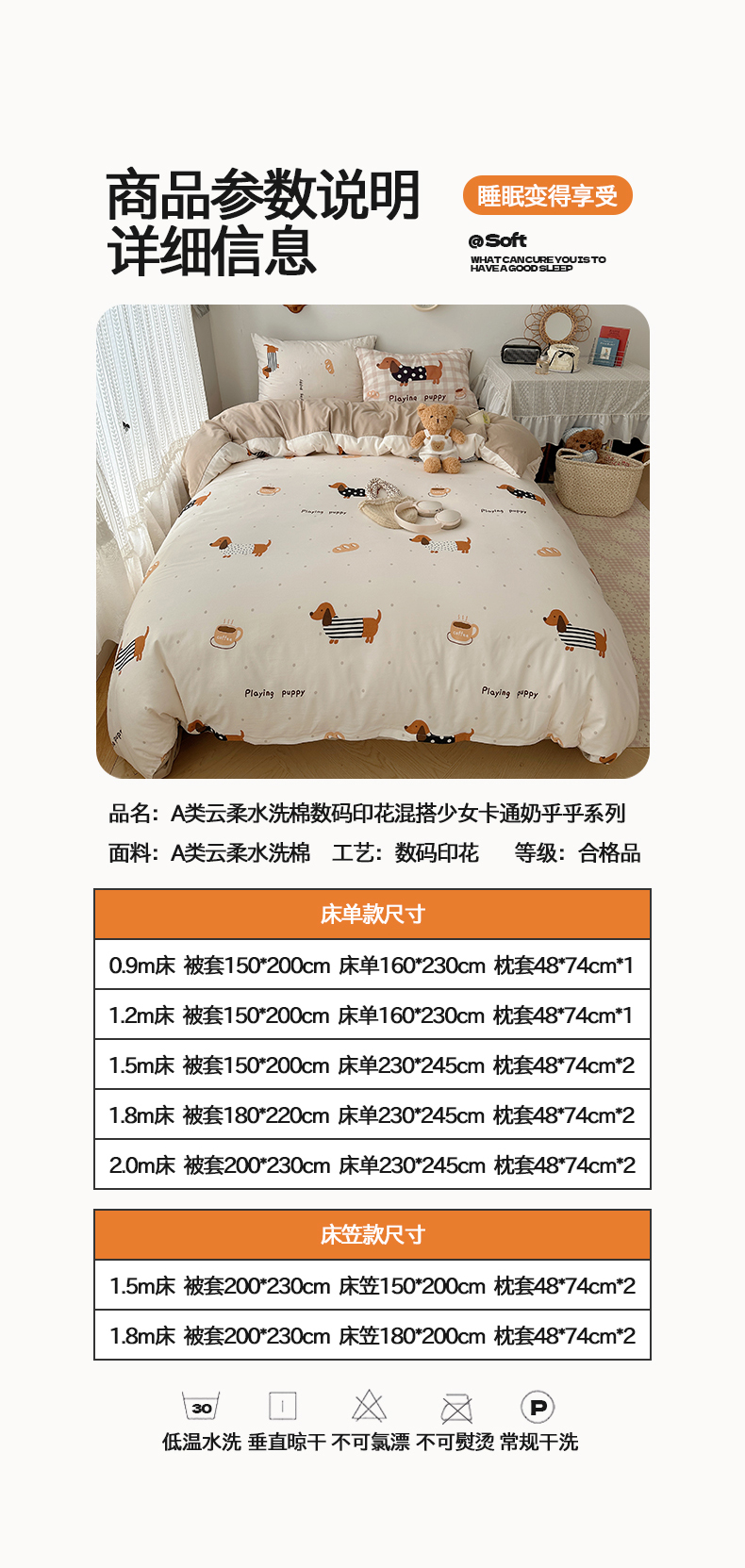 当前位置: 91家纺网 > 商品网购 > 床品套件 > 四件套 > 水洗棉四件套 > 桃心家居 2026新款A类亲肤舒适软糯云柔水洗棉数码印花混搭少女卡通奶乎乎系列四件套 云柔水洗棉-奶咖小腊肠