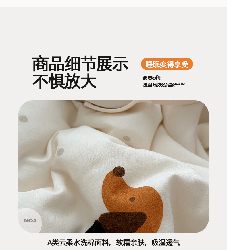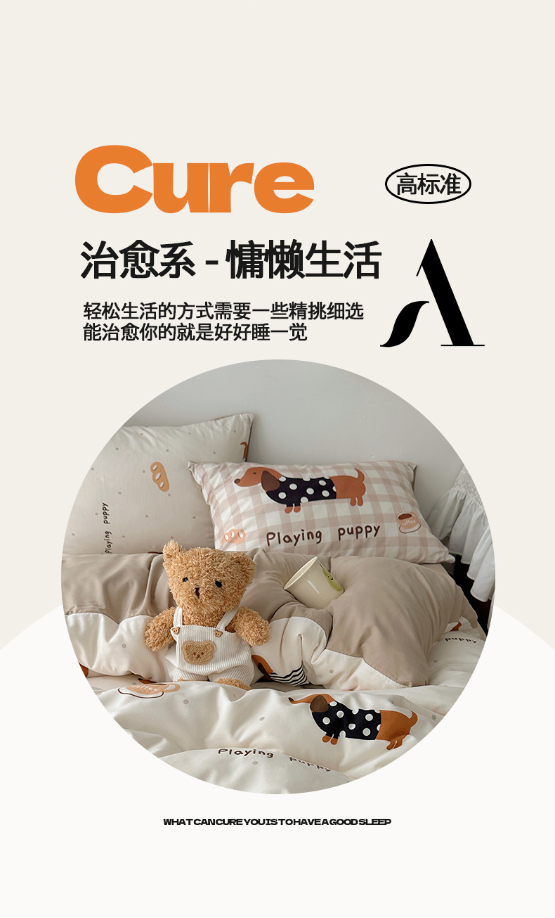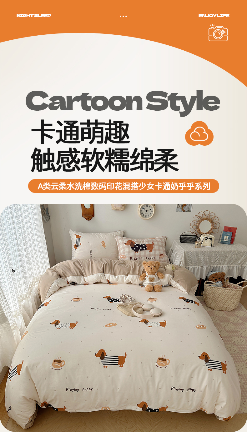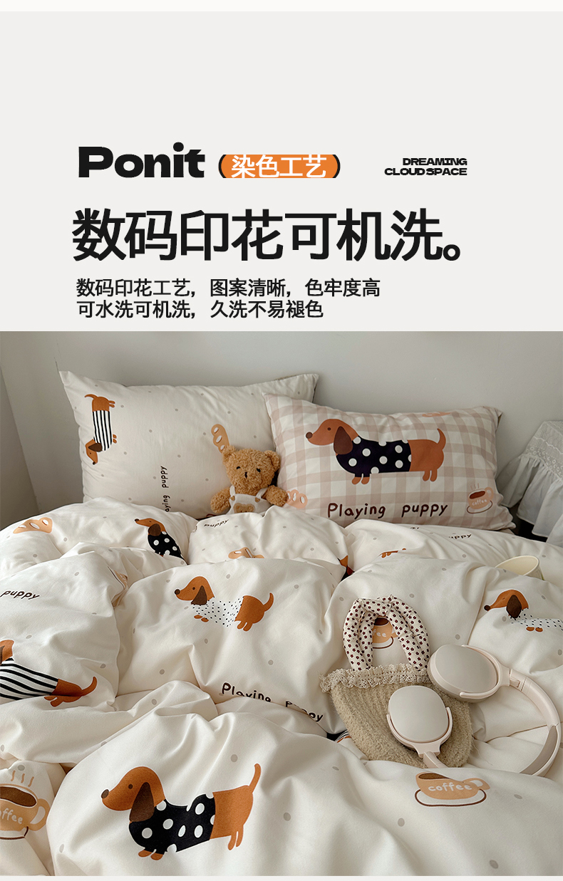 当前位置: 91家纺网 > 商品网购 > 床品套件 > 四件套 > 水洗棉四件套 > 桃心家居 2026新款A类亲肤舒适软糯云柔水洗棉数码印花混搭少女卡通奶乎乎系列四件套 云柔水洗棉-奶咖小腊肠