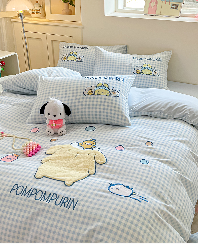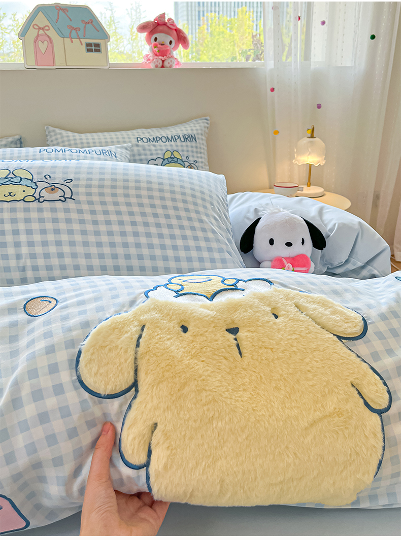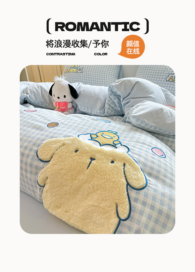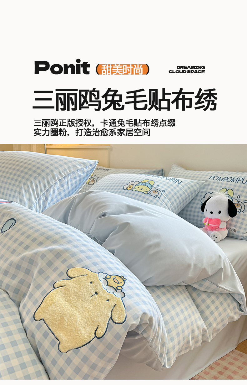 当前位置: 91家纺网 > 商品网购 > 床品套件 > 四件套 > 水洗棉四件套 > 桃心家居 2026新款A类三丽鸥正版授权云柔水洗棉兔毛贴布绣刺绣软糯系列四件套 云柔水洗棉-贴布绣萌萌布丁狗